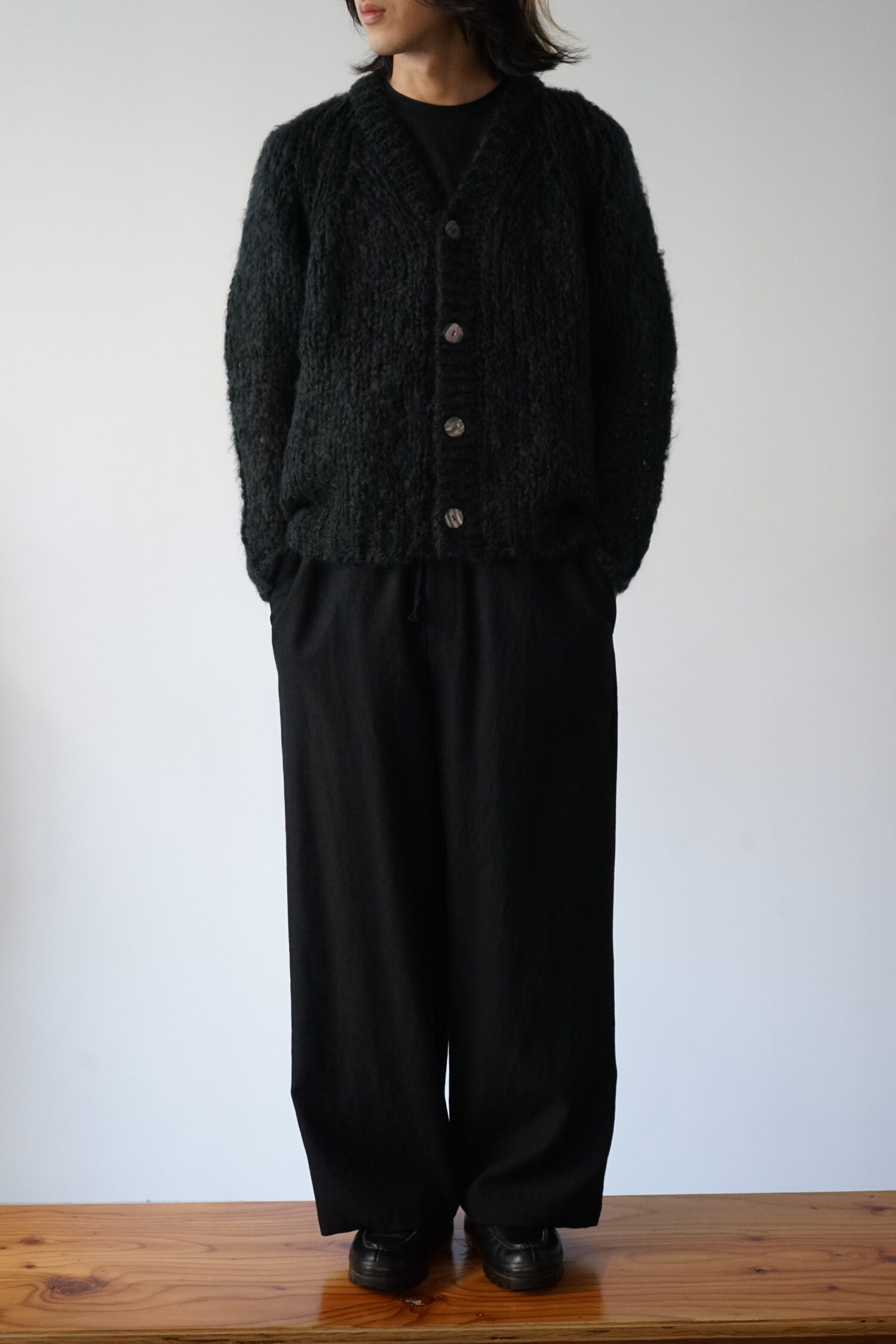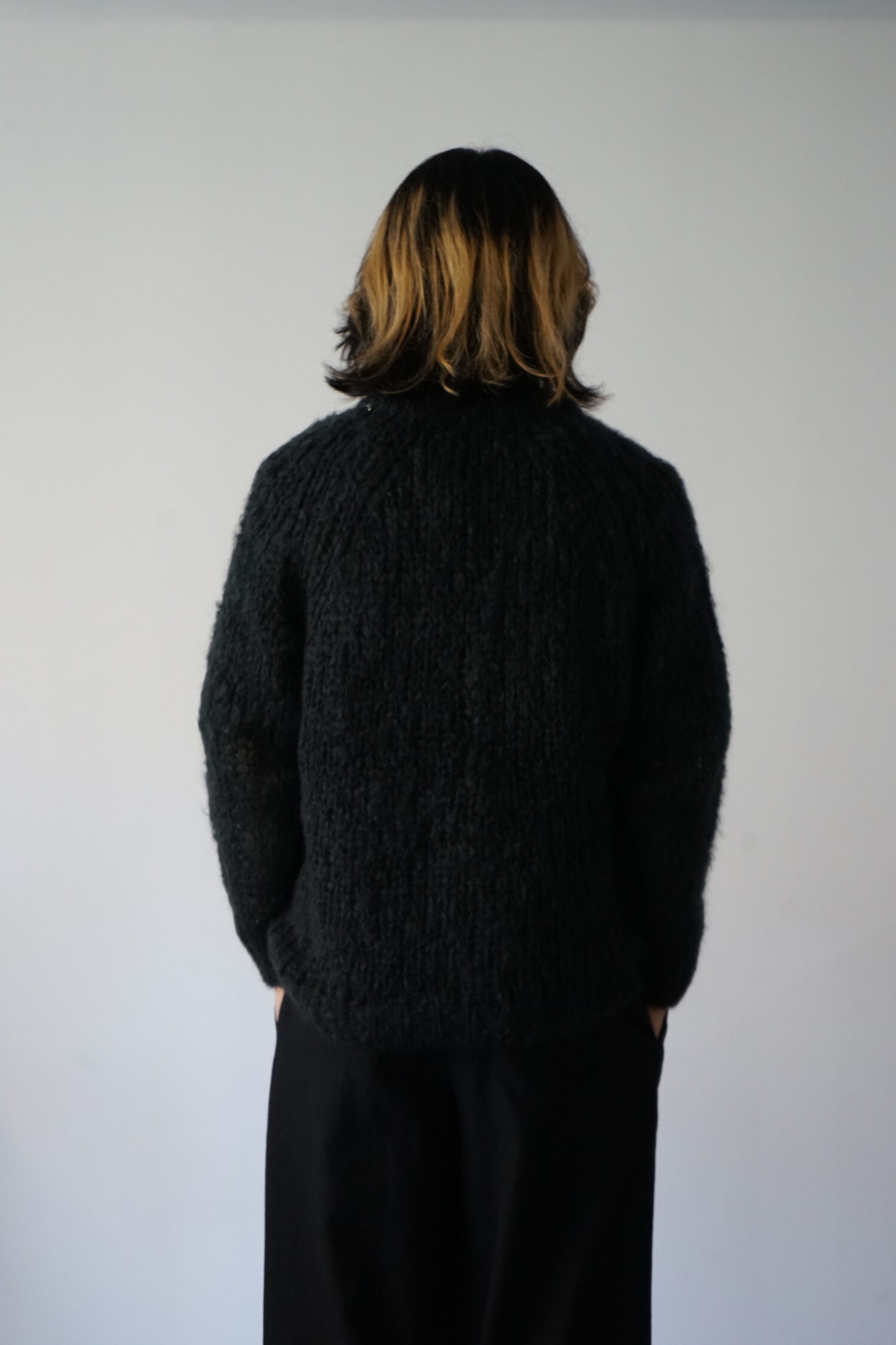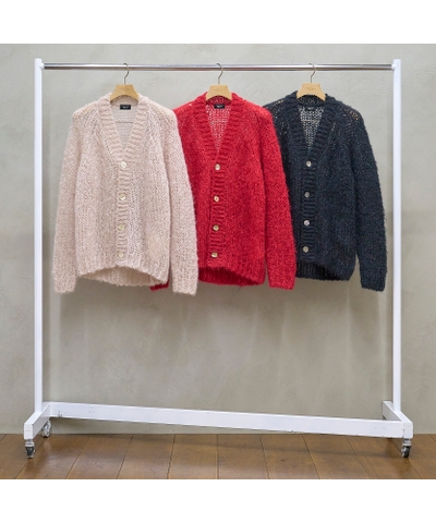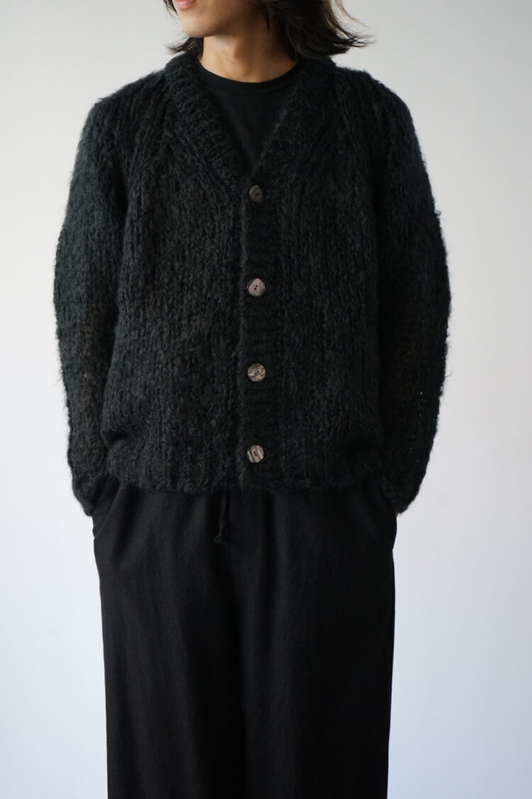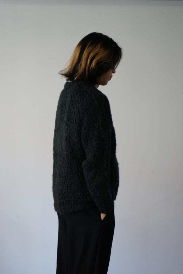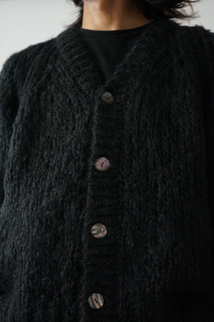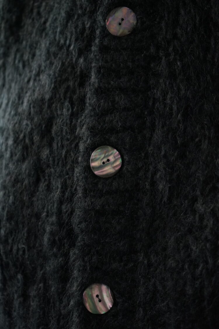 "73% MOHIAR 27% WOOL SHELL BUTTON (生地の特徴) 芯糸にウールを使ったモヘア起毛糸です。 起毛のムラやウールとモヘアの素材違いによる色差、フラットな編み方をしても編み目の凹凸感が出る素材です。 手編みで編むような糸番手ですが機械編みしています。日本ではほとんど無い手横という人の手で動かす編み機で製作しました。 ローゲージのニット製品ですが、程よい厚みと軽量感ある上がりになっています。"