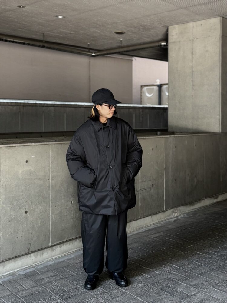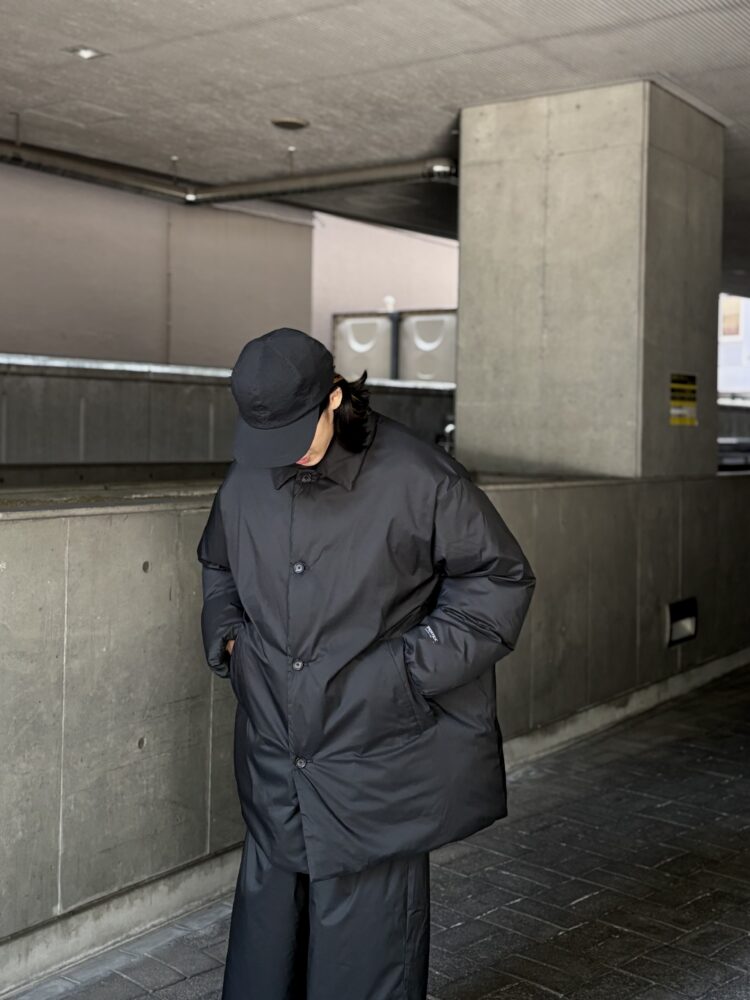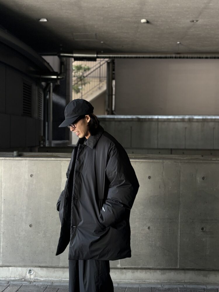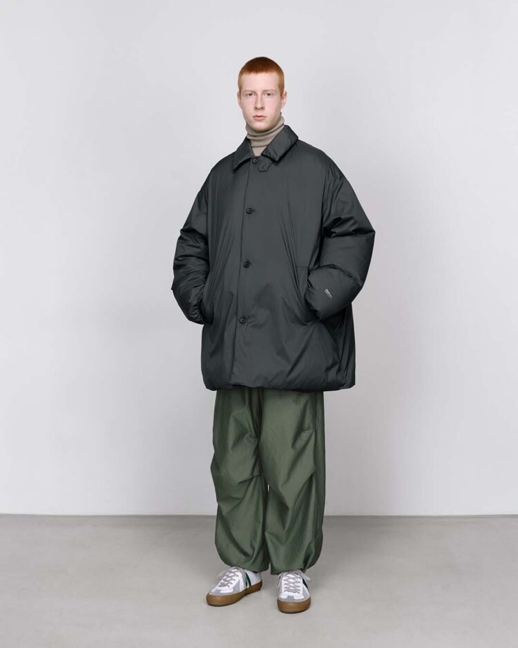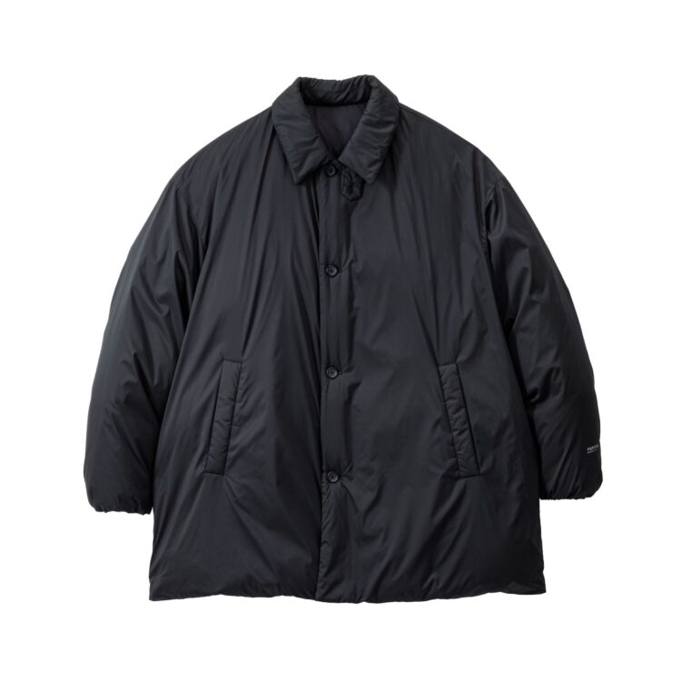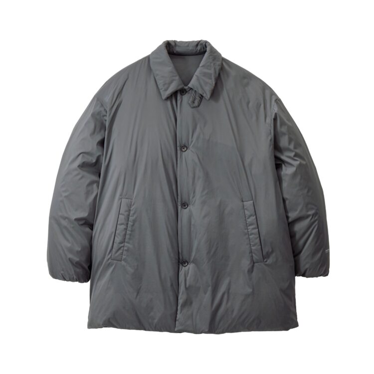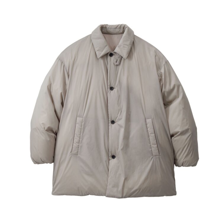 非常に細いナイロンを高密度に織り上げた、優れた耐久性と防風性を誇るPERTEX QUANTUM AIR_を使用したバルカラーコート。贅沢にダウンを詰め込み、高い保温性を持つ。表面はキルトやギャザーといった装飾を省きフラットに仕上げたクリーンな一着。
