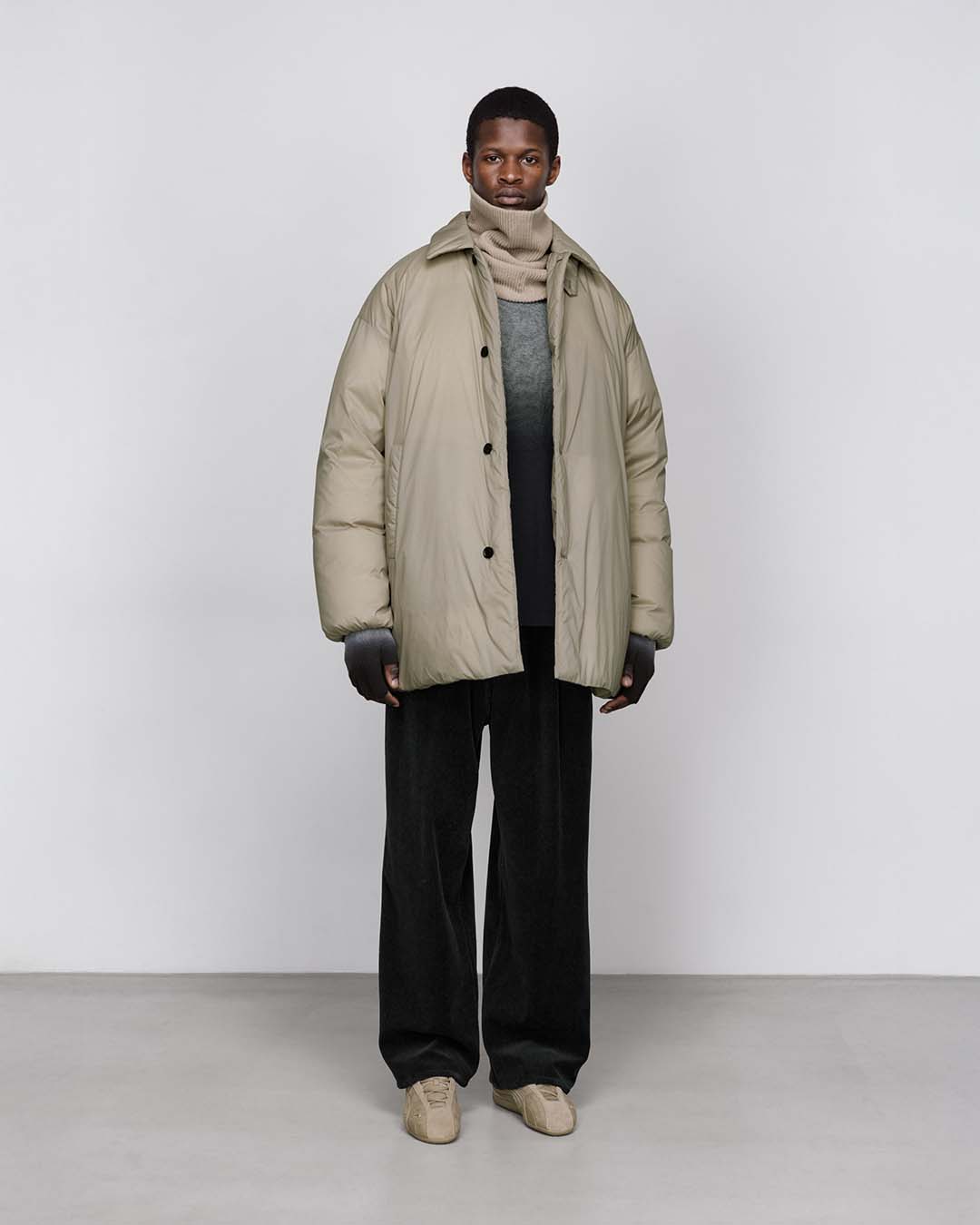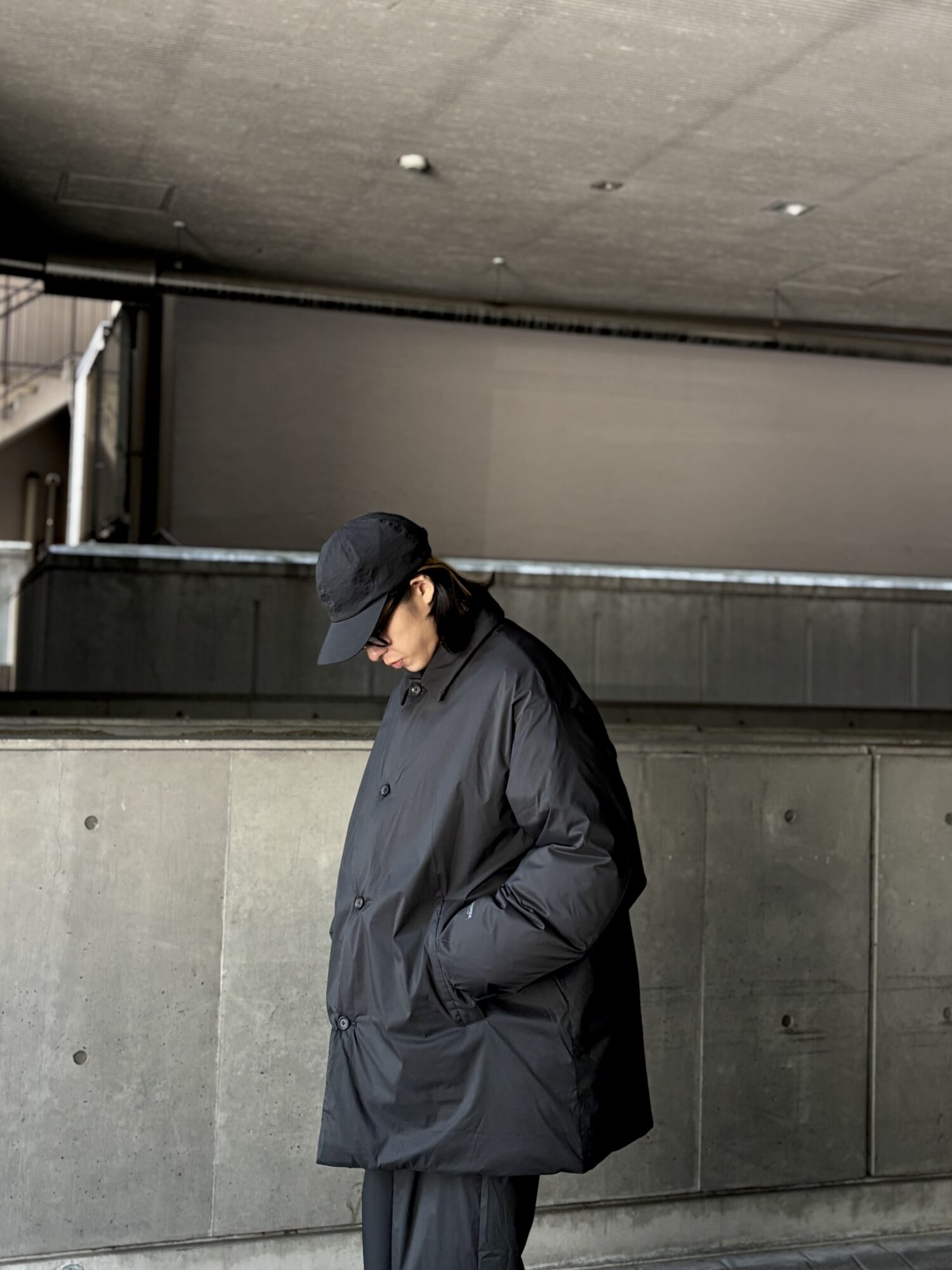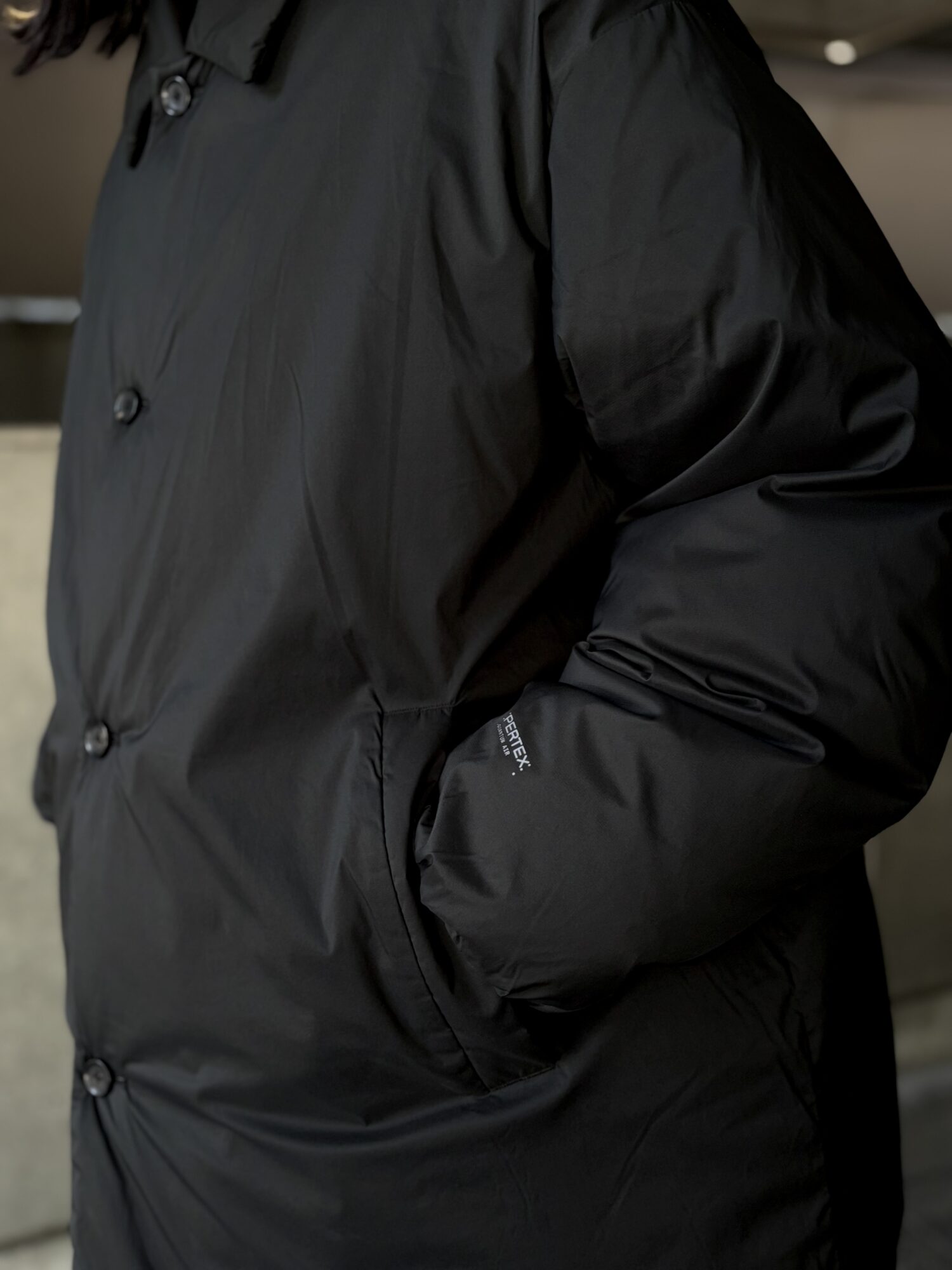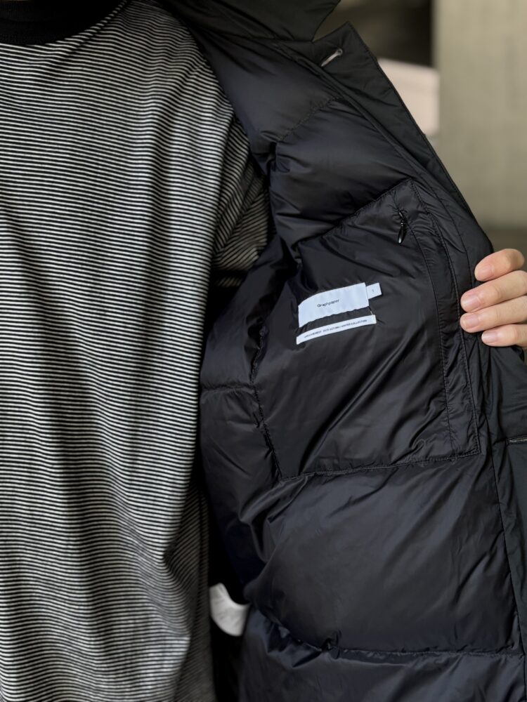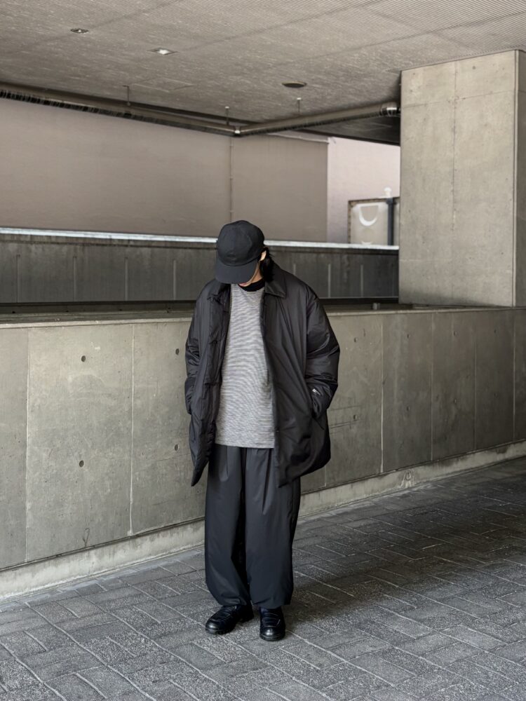 非常に細いナイロンを高密度に織り上げた、優れた耐久性と防風性を誇るPERTEX QUANTUM AIR_を使用したバルカラーコート。贅沢にダウンを詰め込み、高い保温性を持つ。表面はキルトやギャザーといった装飾を省きフラットに仕上げたクリーンな一着。