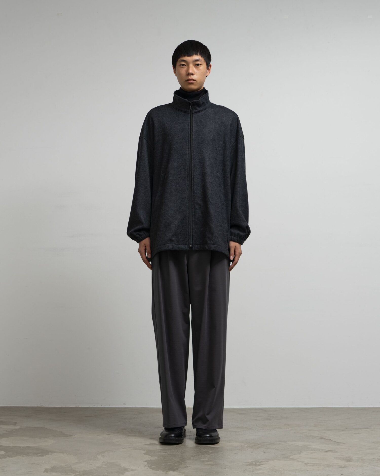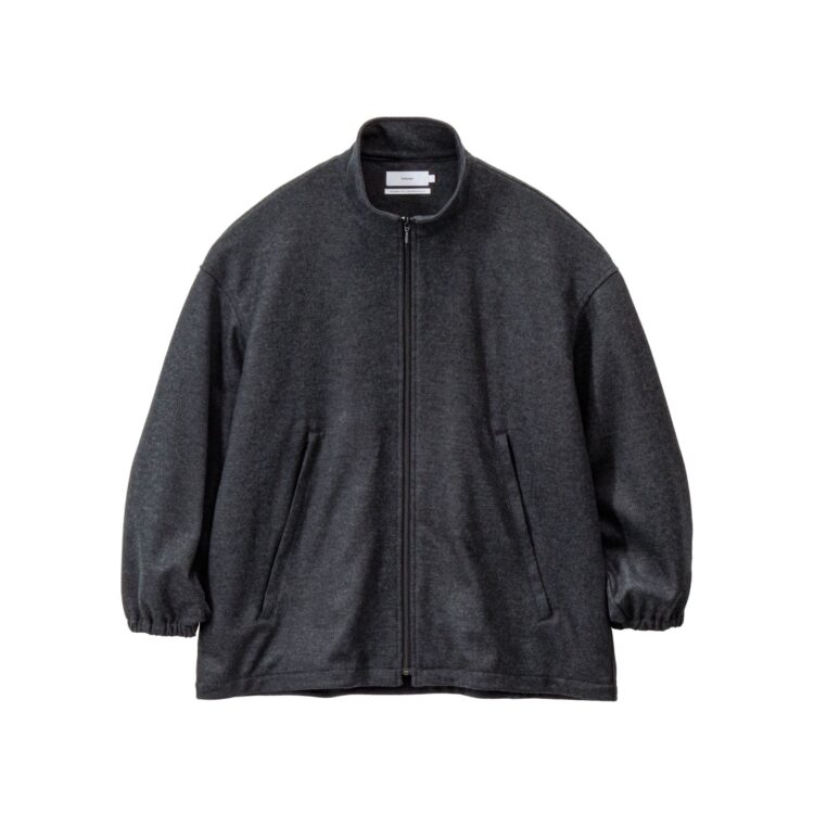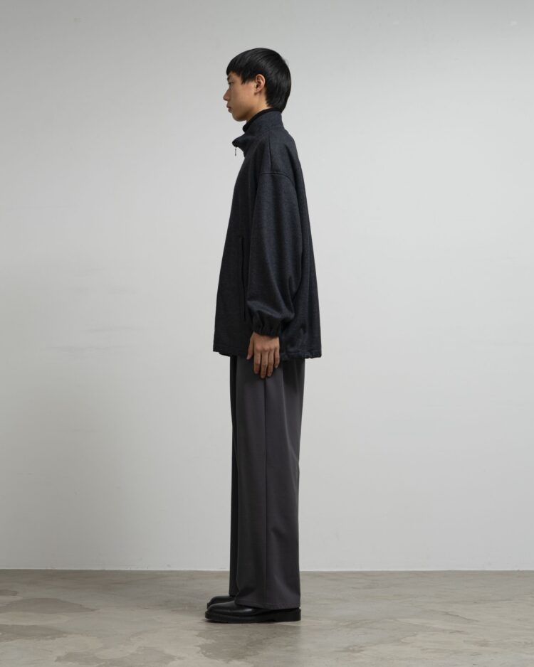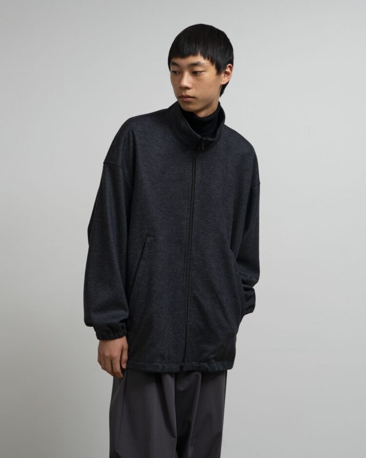 上質なウールで編み上げたスムースを高圧でミルド加工しフランネルのように仕上げた圧縮ウールスムース。ミルド加工と共にスケールオフ加工を行っており、ハンドウオッシャブル可能。ウールらしい上品な光沢感と圧縮することによって生まれるしっかりとしたハリ感、しなやかなドレープが特徴。冬に最適なウォーム感のあるトラックジャケット。