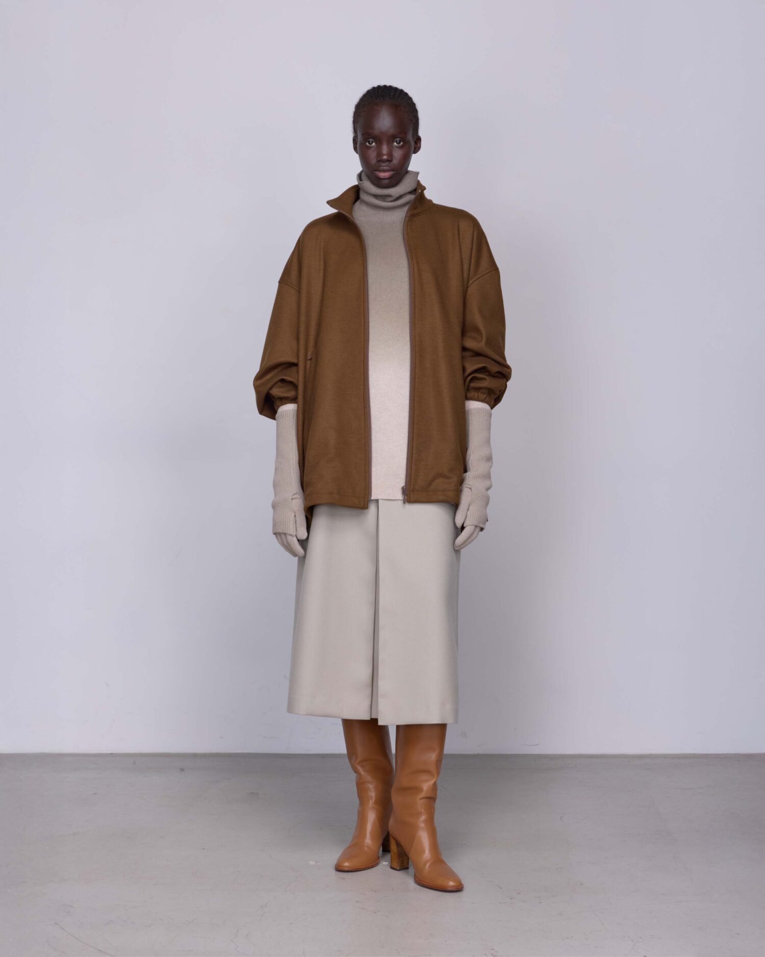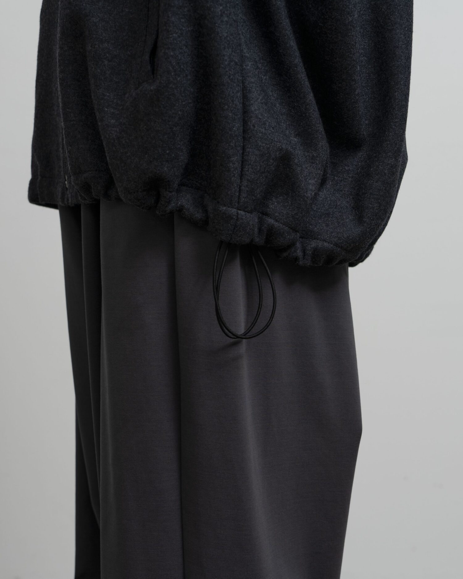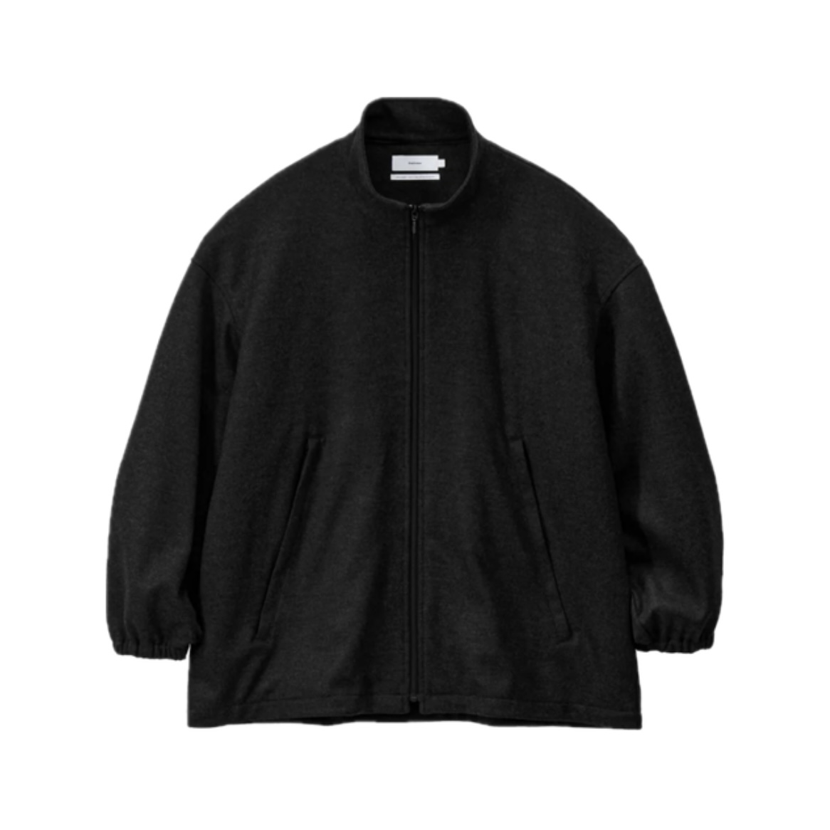 上質なウールで編み上げたスムースを高圧でミルド加工しフランネルのように仕上げた圧縮ウールスムース。ミルド加工と共にスケールオフ加工を行っており、ハンドウオッシャブル可能。ウールらしい上品な光沢感と圧縮することによって生まれるしっかりとしたハリ感、しなやかなドレープが特徴。冬に最適なウォーム感のあるトラックジャケット。