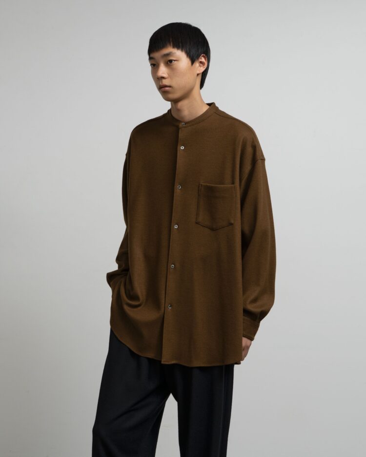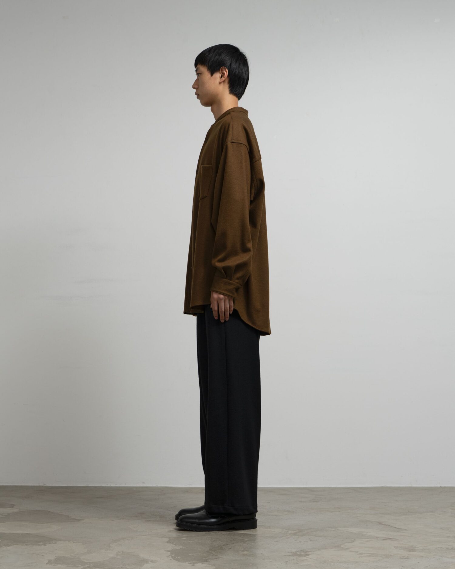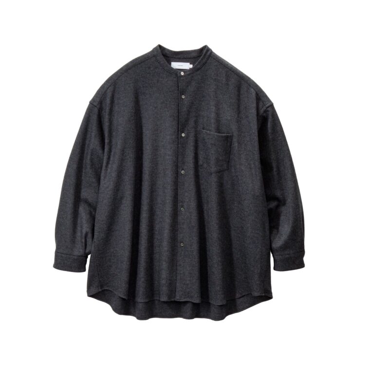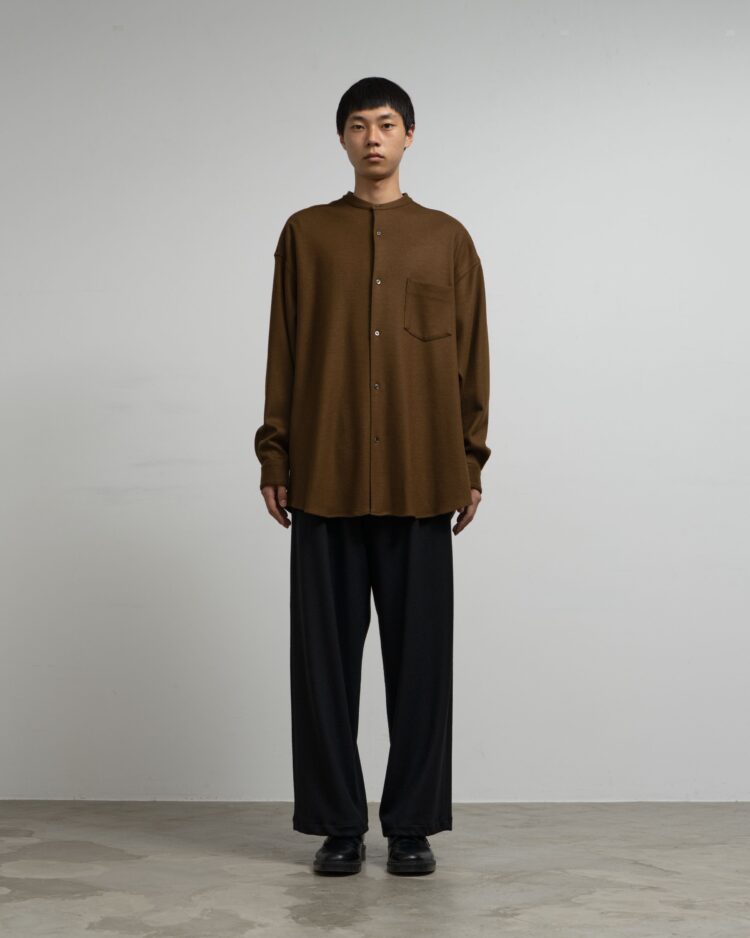 上質なウールで編み上げたスムースを高圧でミルド加工しフランネルのように仕上げた圧縮ウールスムース。ミルド加工と共にスケールオフ加工を行っており、ハンドウオッシャブル可能。ウールらしい上品な光沢感と圧縮することによって生まれるしっかりとしたハリ感、しなやかなドレープが特徴。冬に最適なウォーム感のあるオーバーサイズフィットのパンドカラーシャツ。