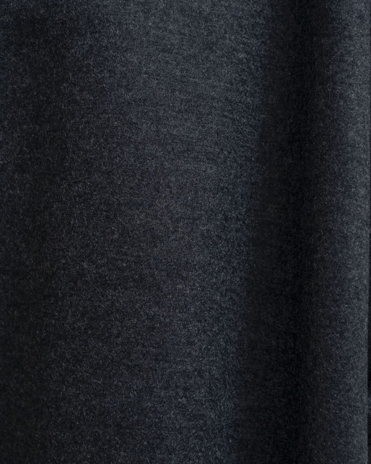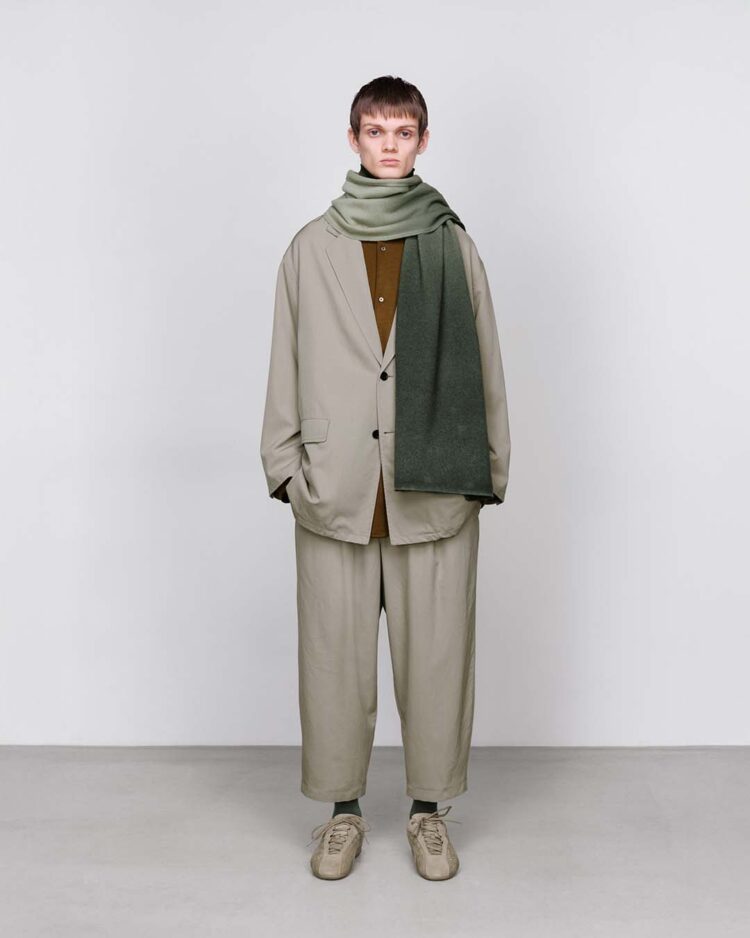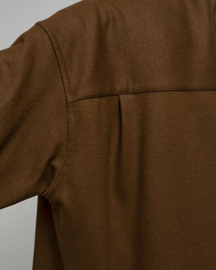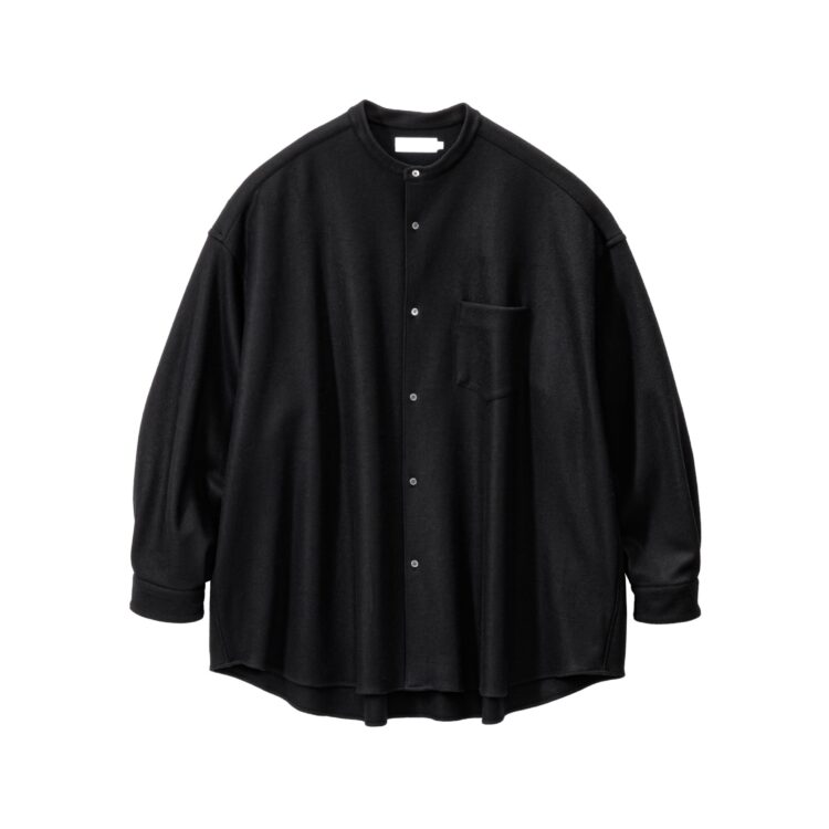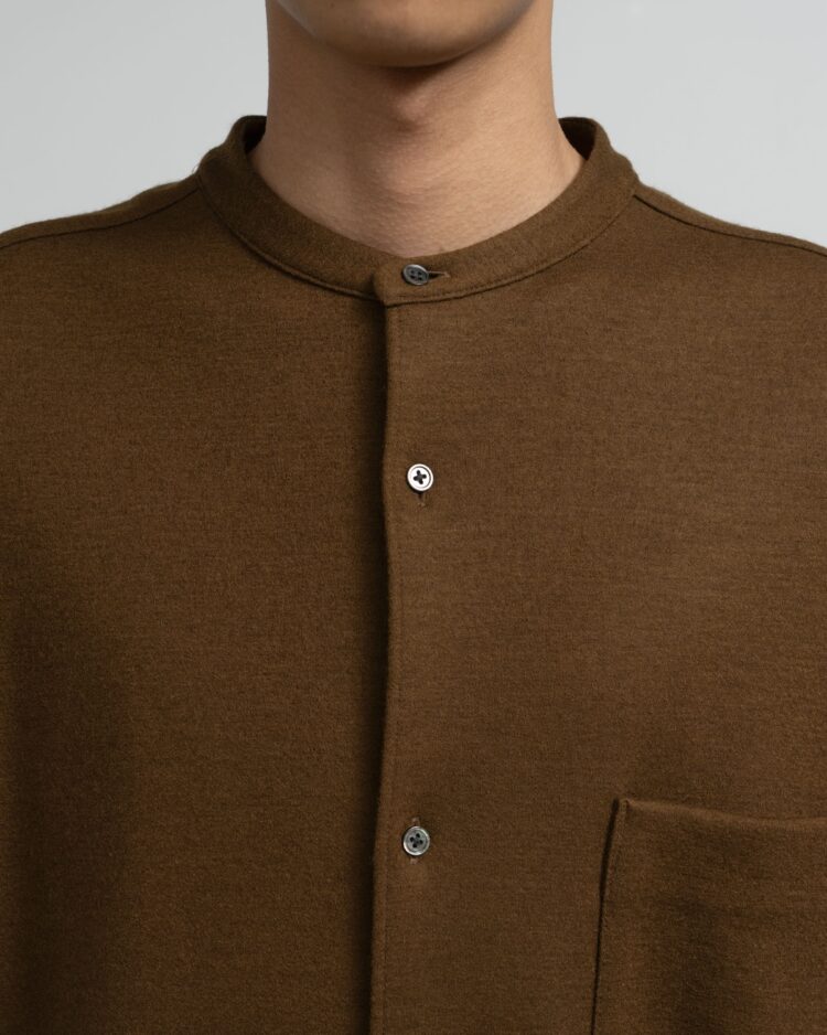上質なウールで編み上げたスムースを高圧でミルド加工しフランネルのように仕上げた圧縮ウールスムース。ミルド加工と共にスケールオフ加工を行っており、ハンドウオッシャブル可能。ウールらしい上品な光沢感と圧縮することによって生まれるしっかりとしたハリ感、しなやかなドレープが特徴。冬に最適なウォーム感のあるオーバーサイズフィットのパンドカラーシャツ。