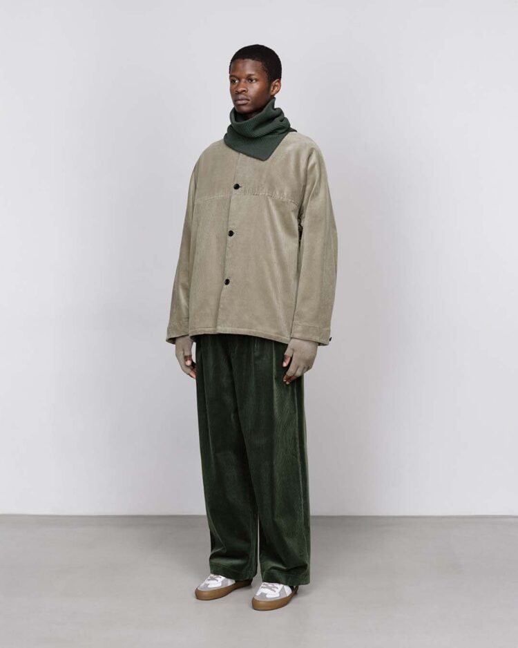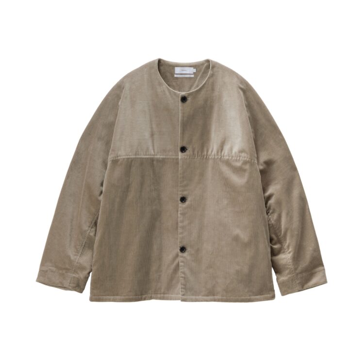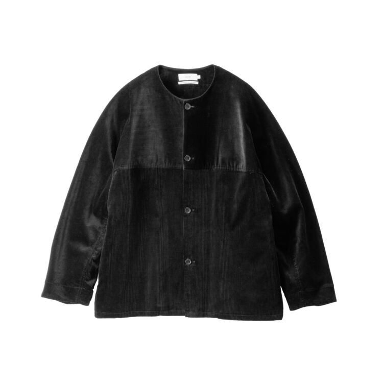 希少なスビンゴールドコットンを用いて織り上げたコーデュロイ生地。柔らかくしなやかな手触りと、太い畝一本一本の深味ある光沢、さらに美しい発色が特徴的な上品な素材。前後に配したヨークスリーブとカラーレスのネックラインが特徴的なジャケット。