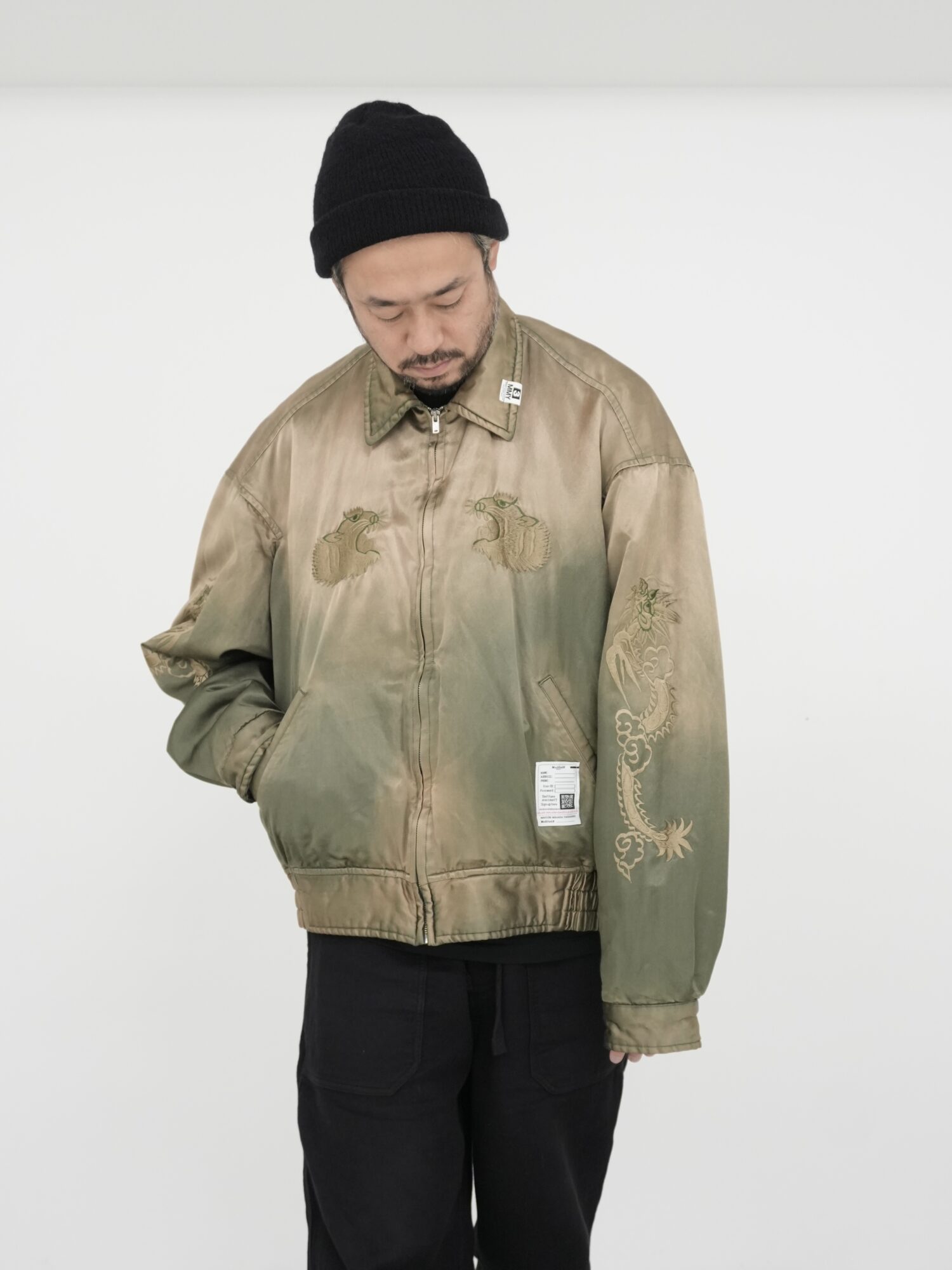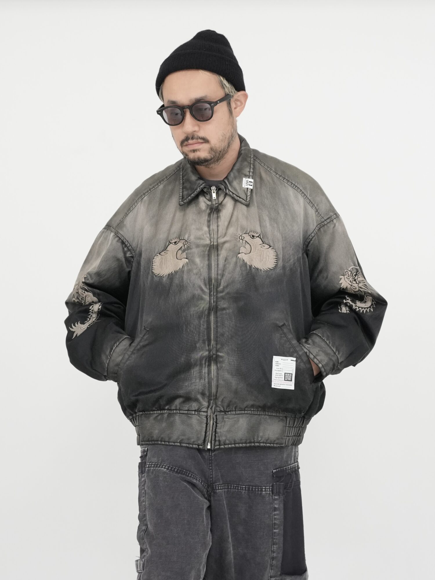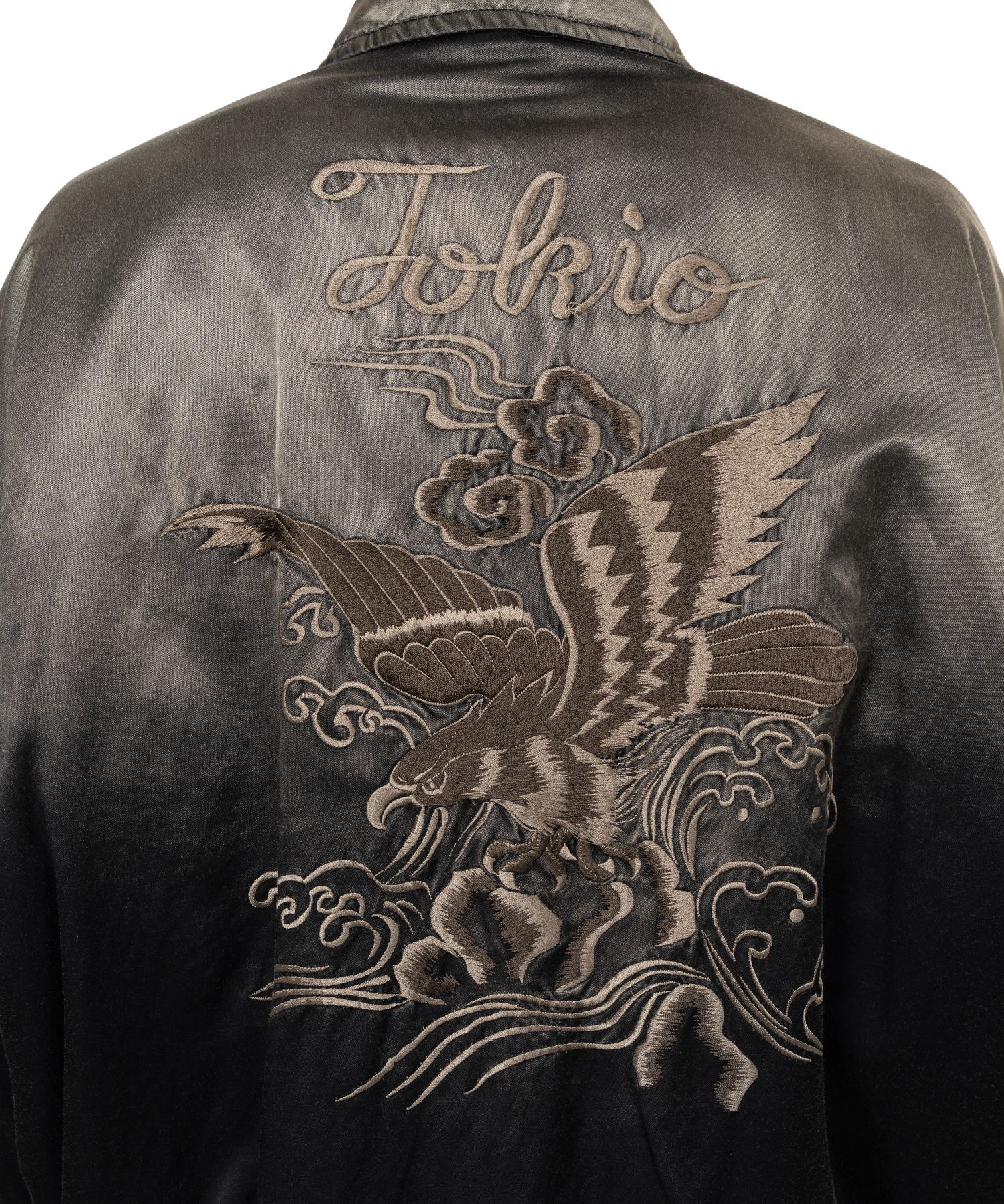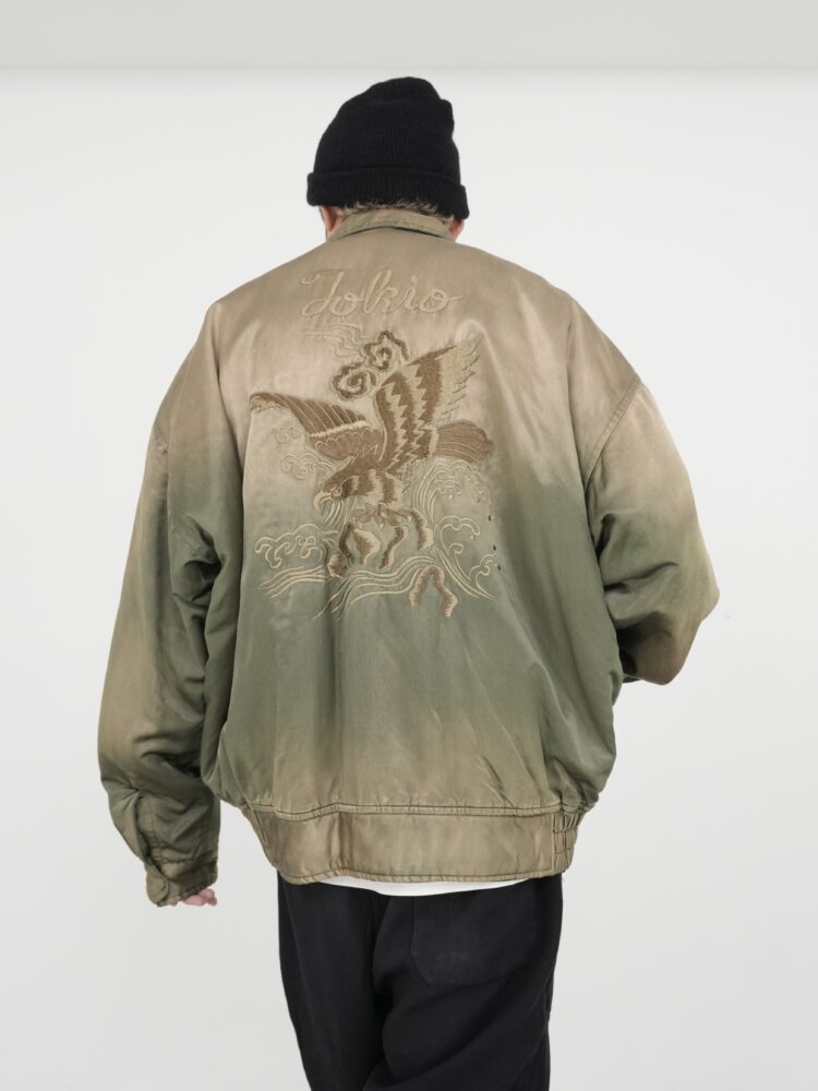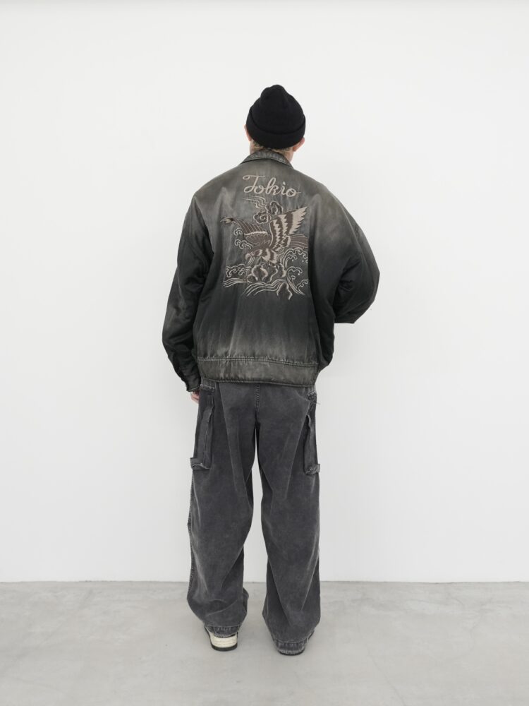 横須賀発祥のスカジャンをインスピレーション源にデザインされた襟付きスーベニアジャケット。 後ろ丈が長いデザインになっており、バックに"Tokio"の文字刺繍。 フロントポケットでジップアップ。中綿入り。