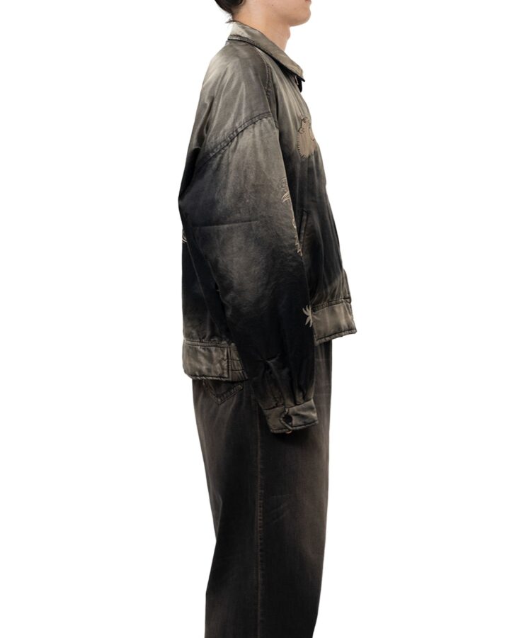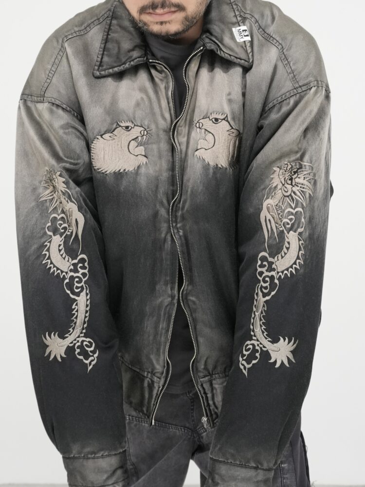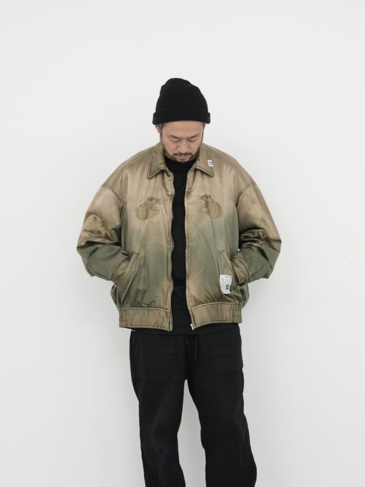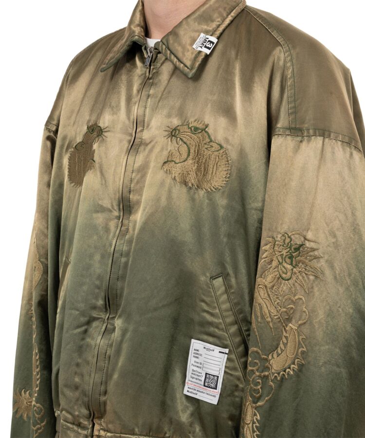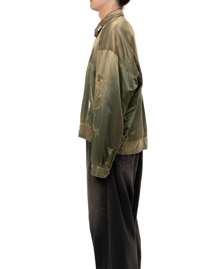 横須賀発祥のスカジャンをインスピレーション源にデザインされた襟付きスーベニアジャケット。 後ろ丈が長いデザインになっており、バックに"Tokio"の文字刺繍。 フロントポケットでジップアップ。中綿入り。