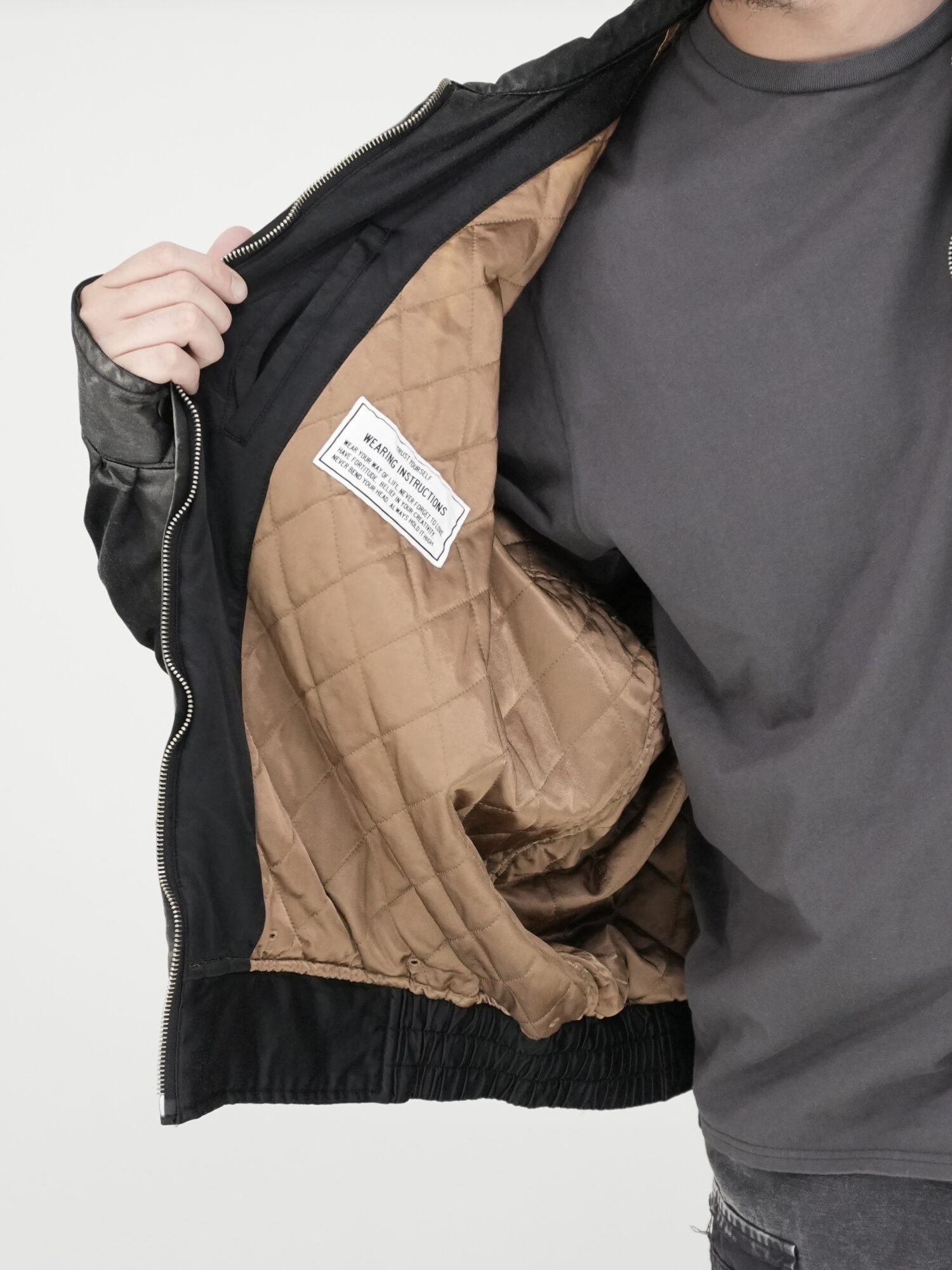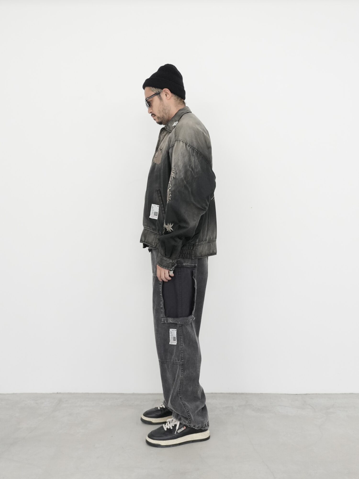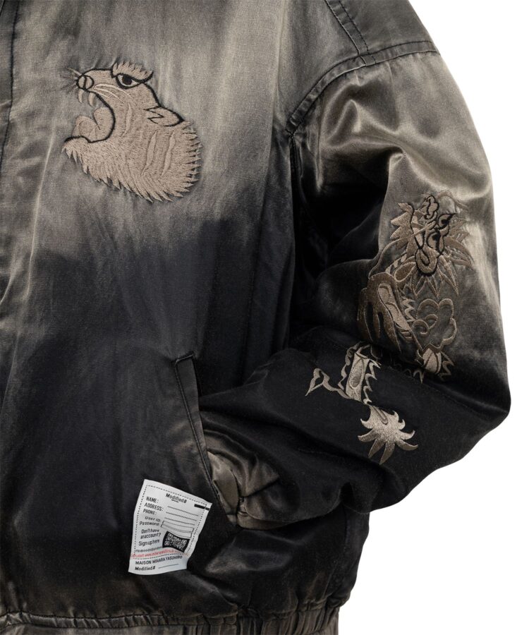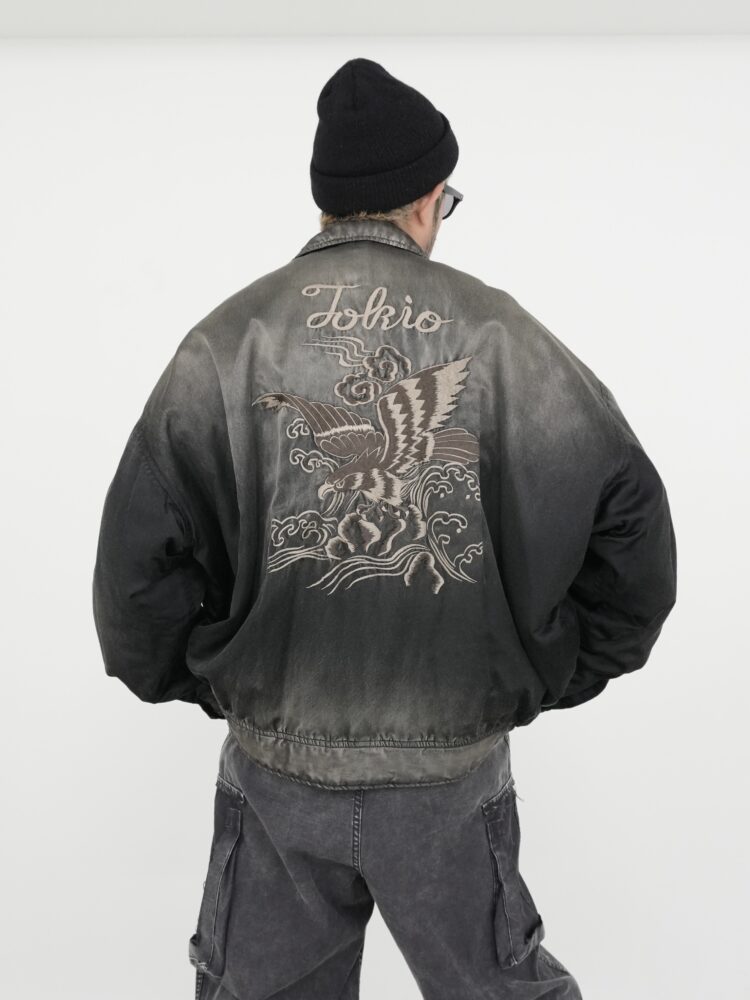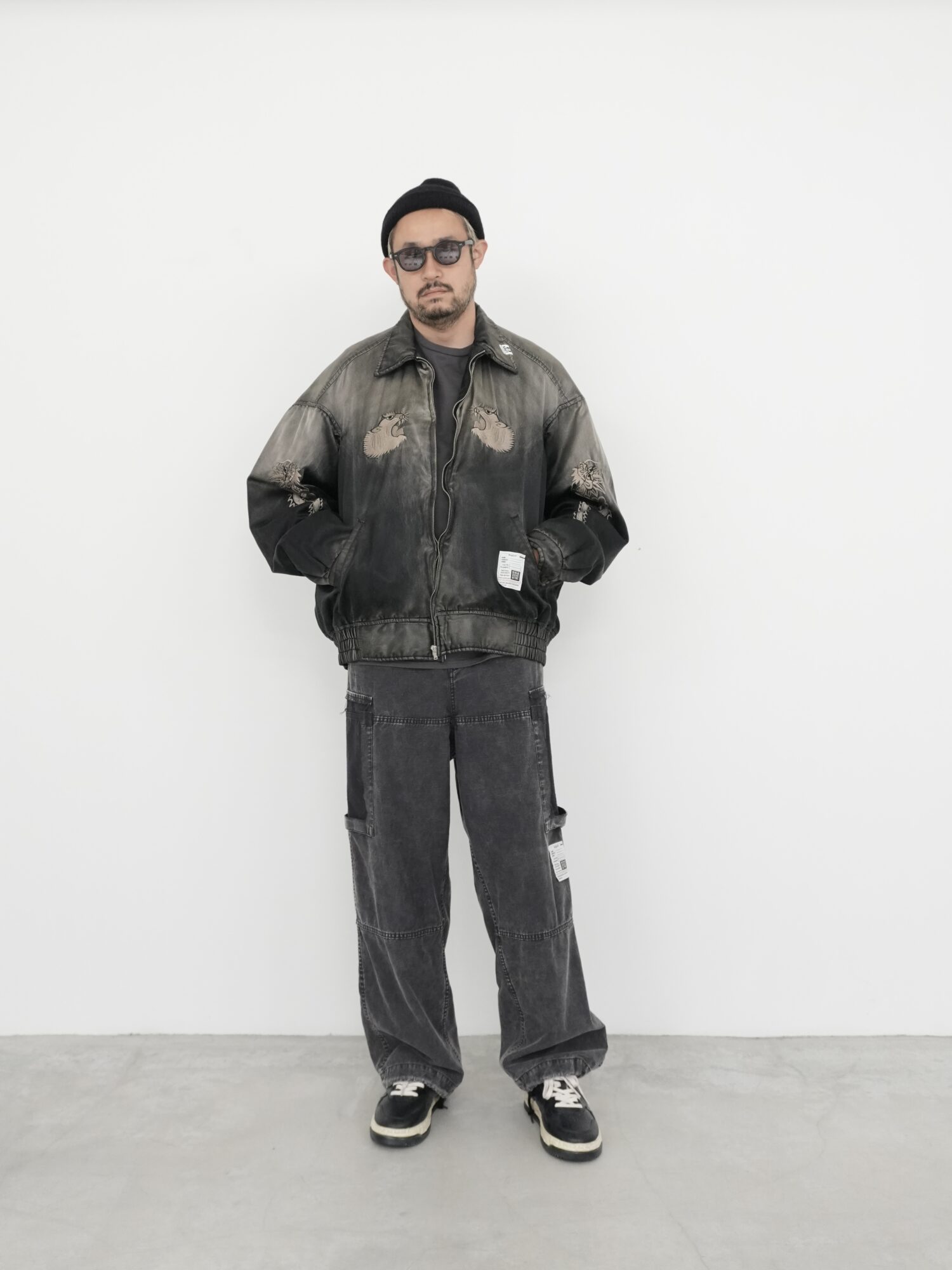 横須賀発祥のスカジャンをインスピレーション源にデザインされた襟付きスーベニアジャケット。 後ろ丈が長いデザインになっており、バックに"Tokio"の文字刺繍。 フロントポケットでジップアップ。中綿入り。