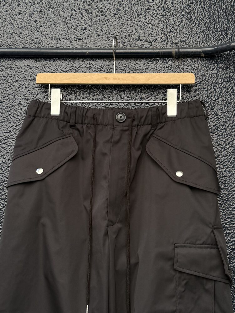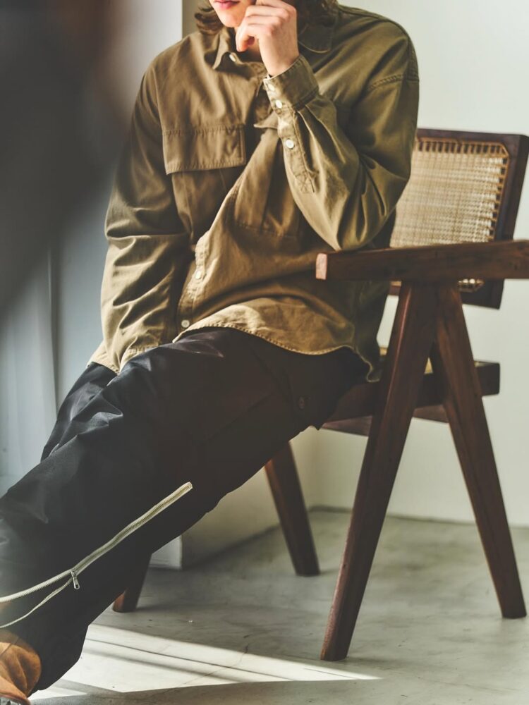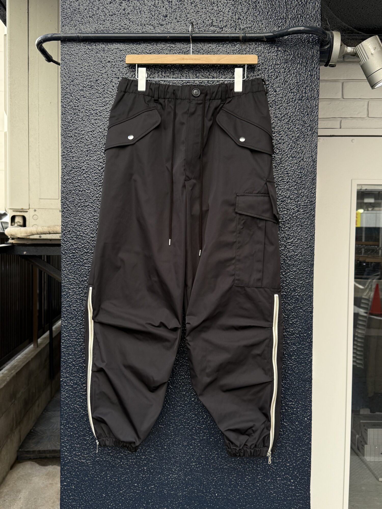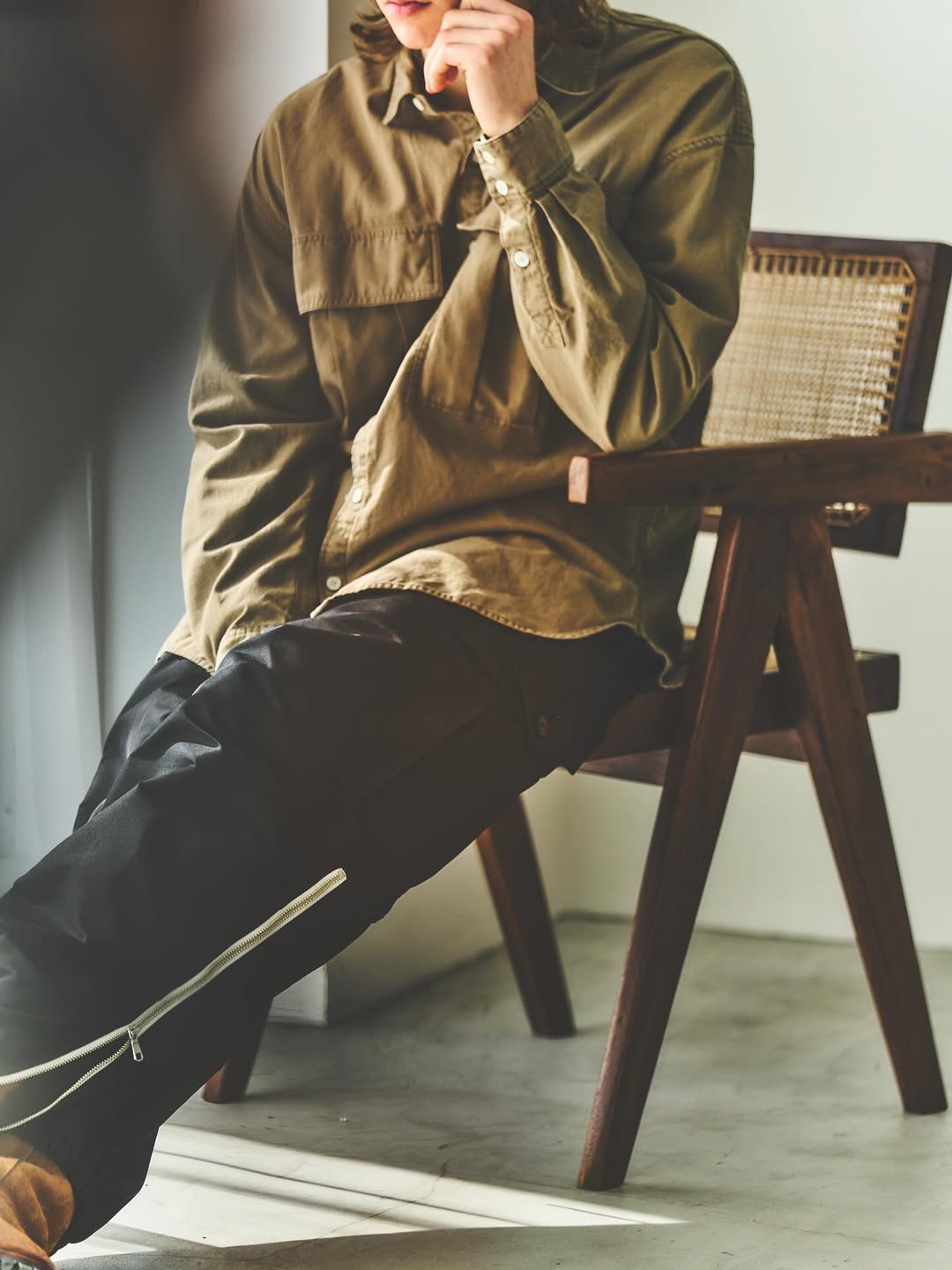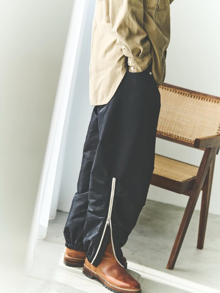 ワイドで丸みのあるシルエット。 サイドでもセンターでもなく、斜めに設置されたジップがあり、閉めた状態であれば裾はギュッとしており、開くとスリットになり、足元の靴を綺麗に見せてくれるパンツです。