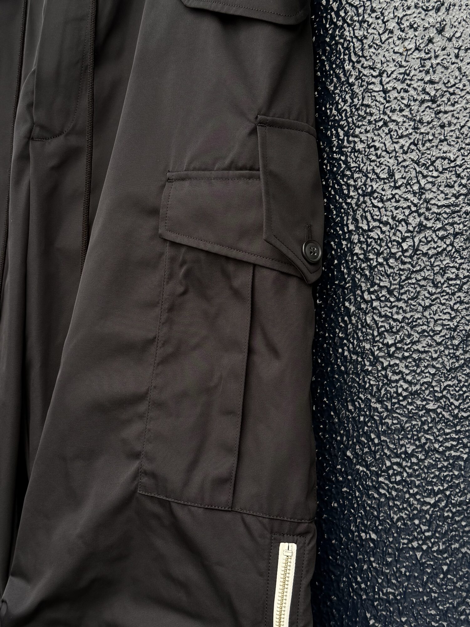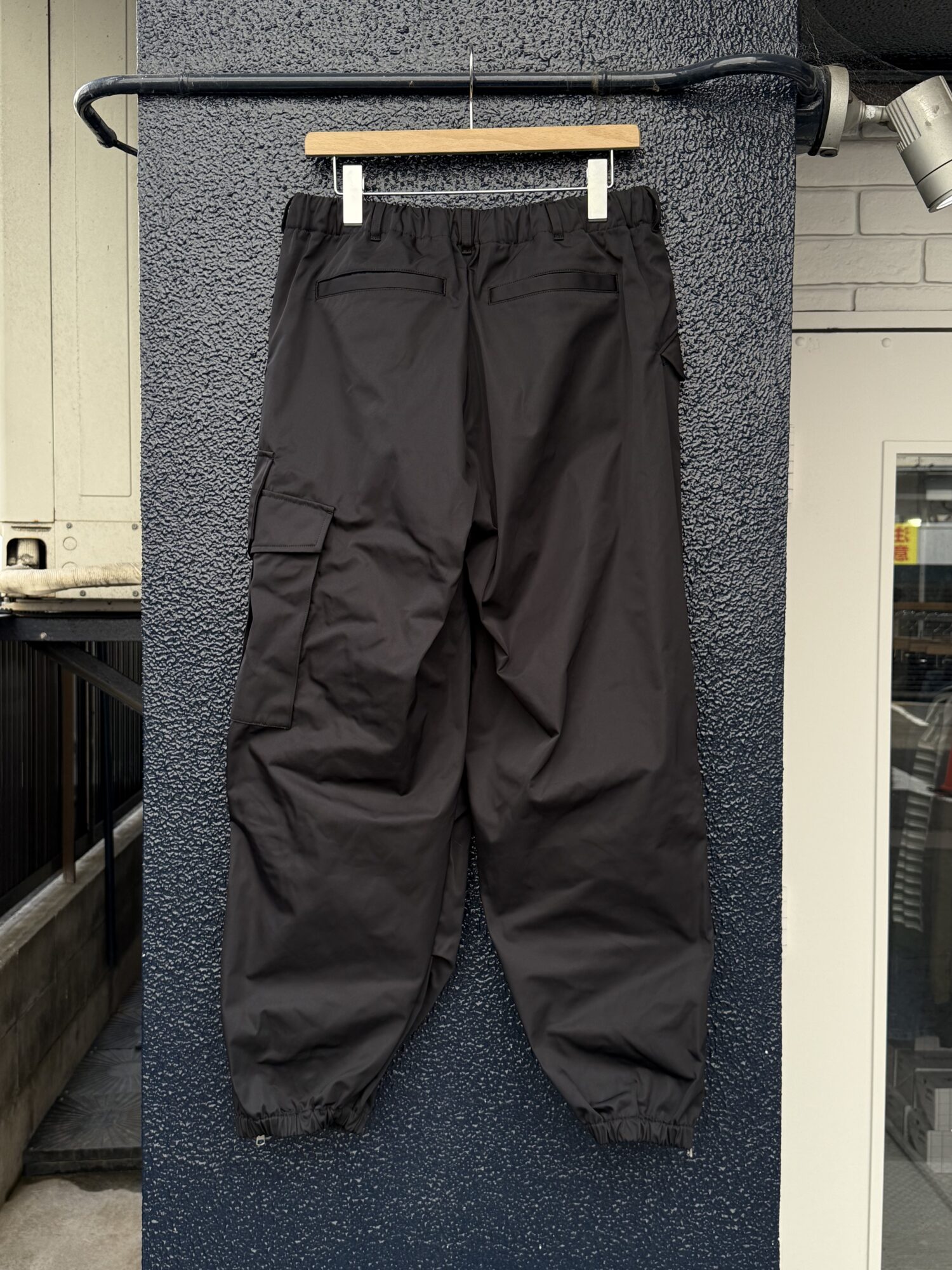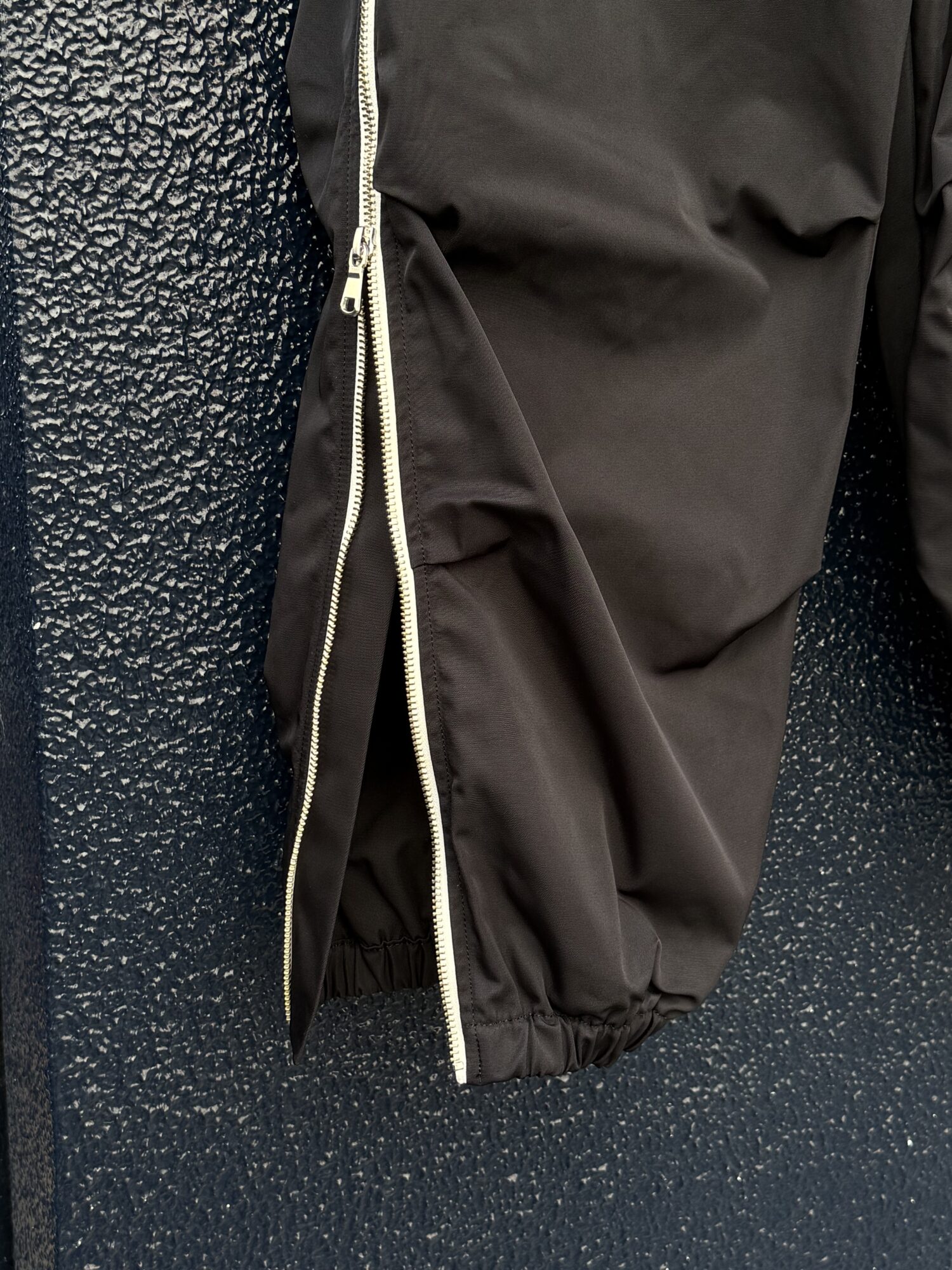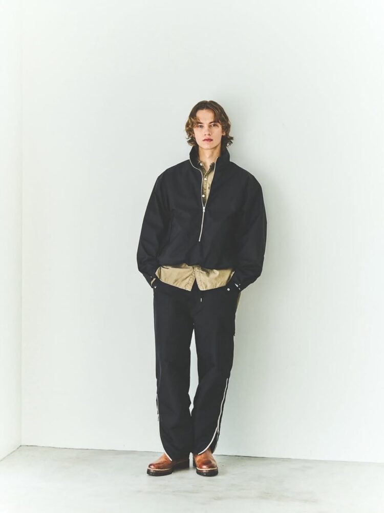 ワイドで丸みのあるシルエット。 サイドでもセンターでもなく、斜めに設置されたジップがあり、閉めた状態であれば裾はギュッとしており、開くとスリットになり、足元の靴を綺麗に見せてくれるパンツです。