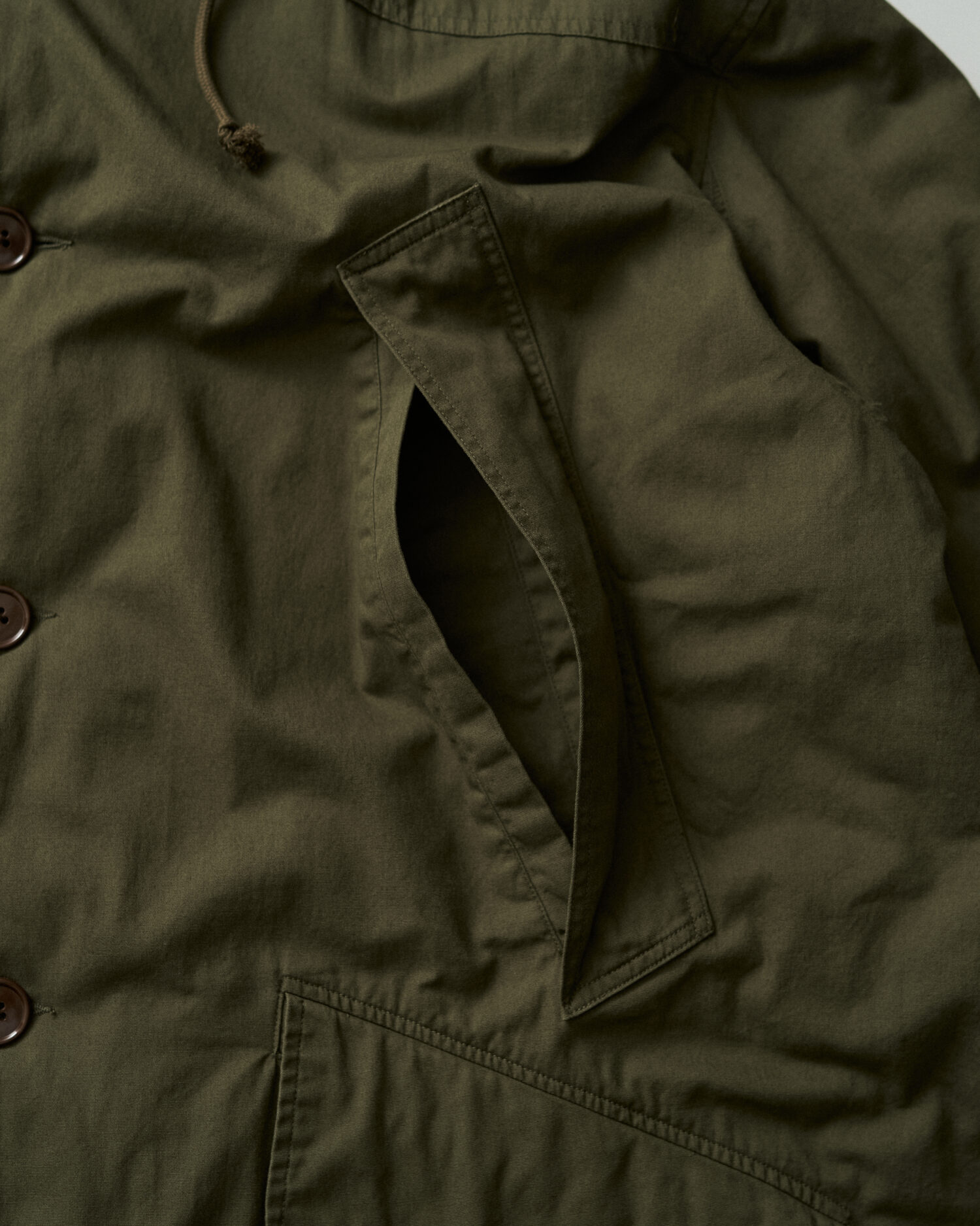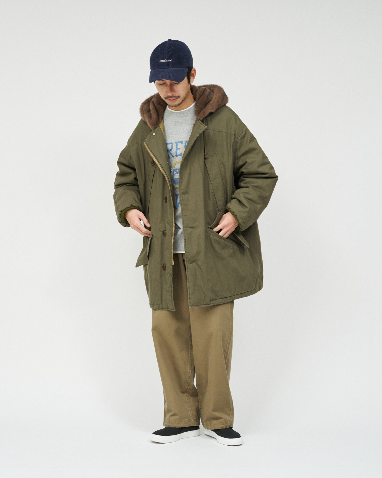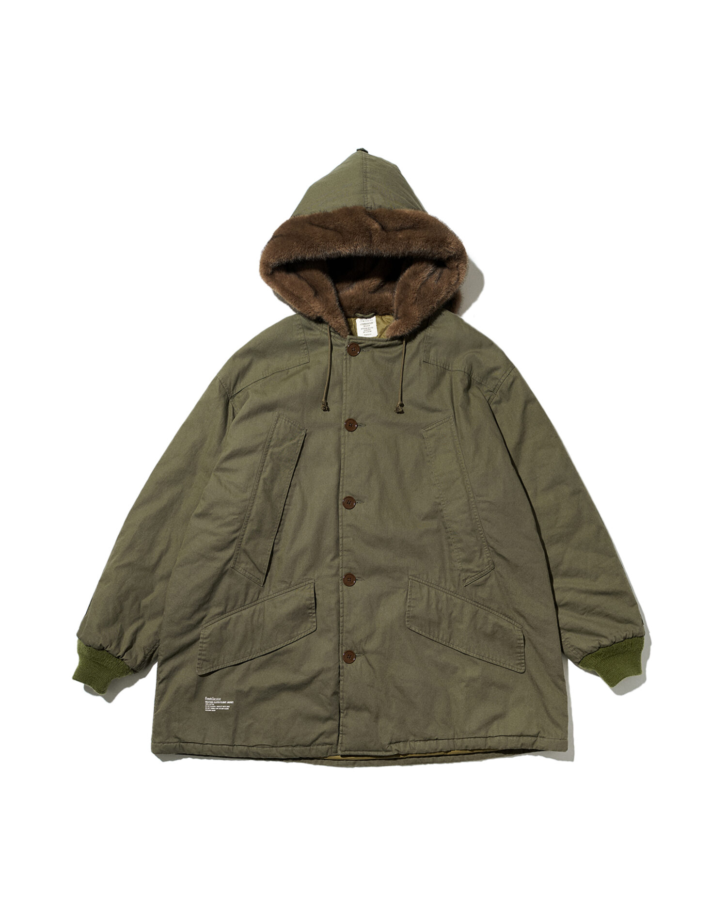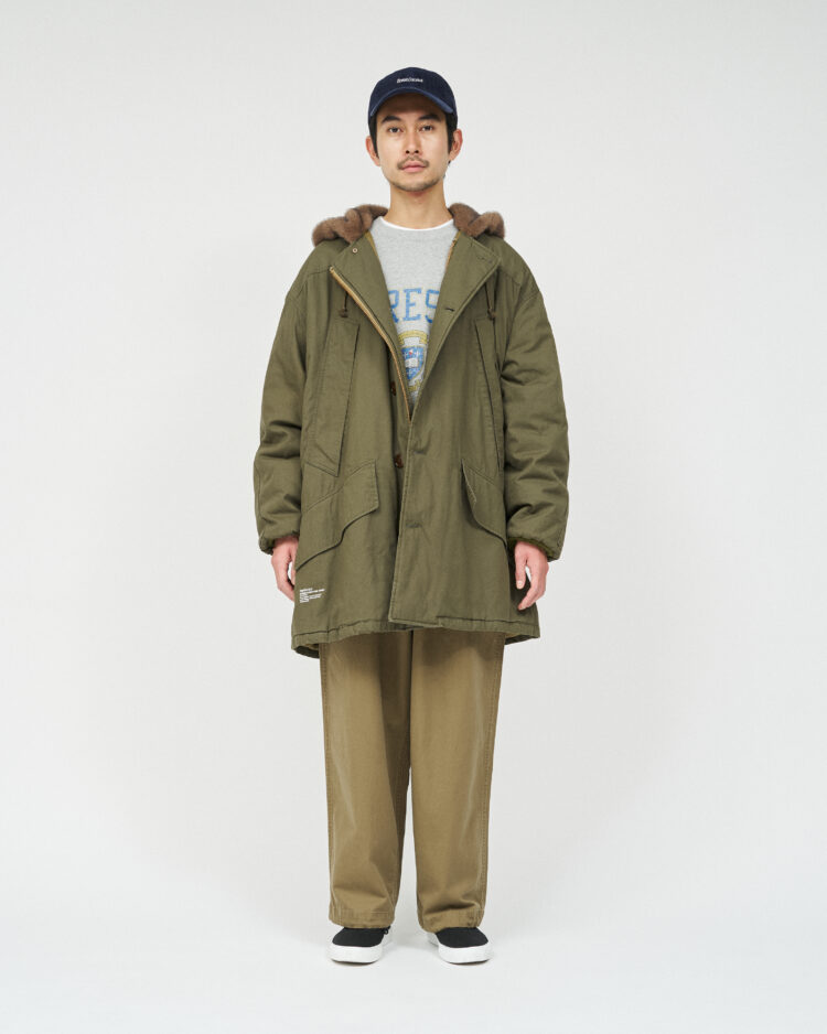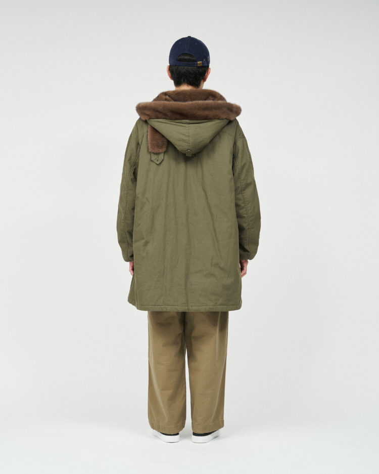 ミリタリーウェアとしてのタフな生地に長く使い込まれた風合いを表現した加工を加え、当時のディティールを再現。