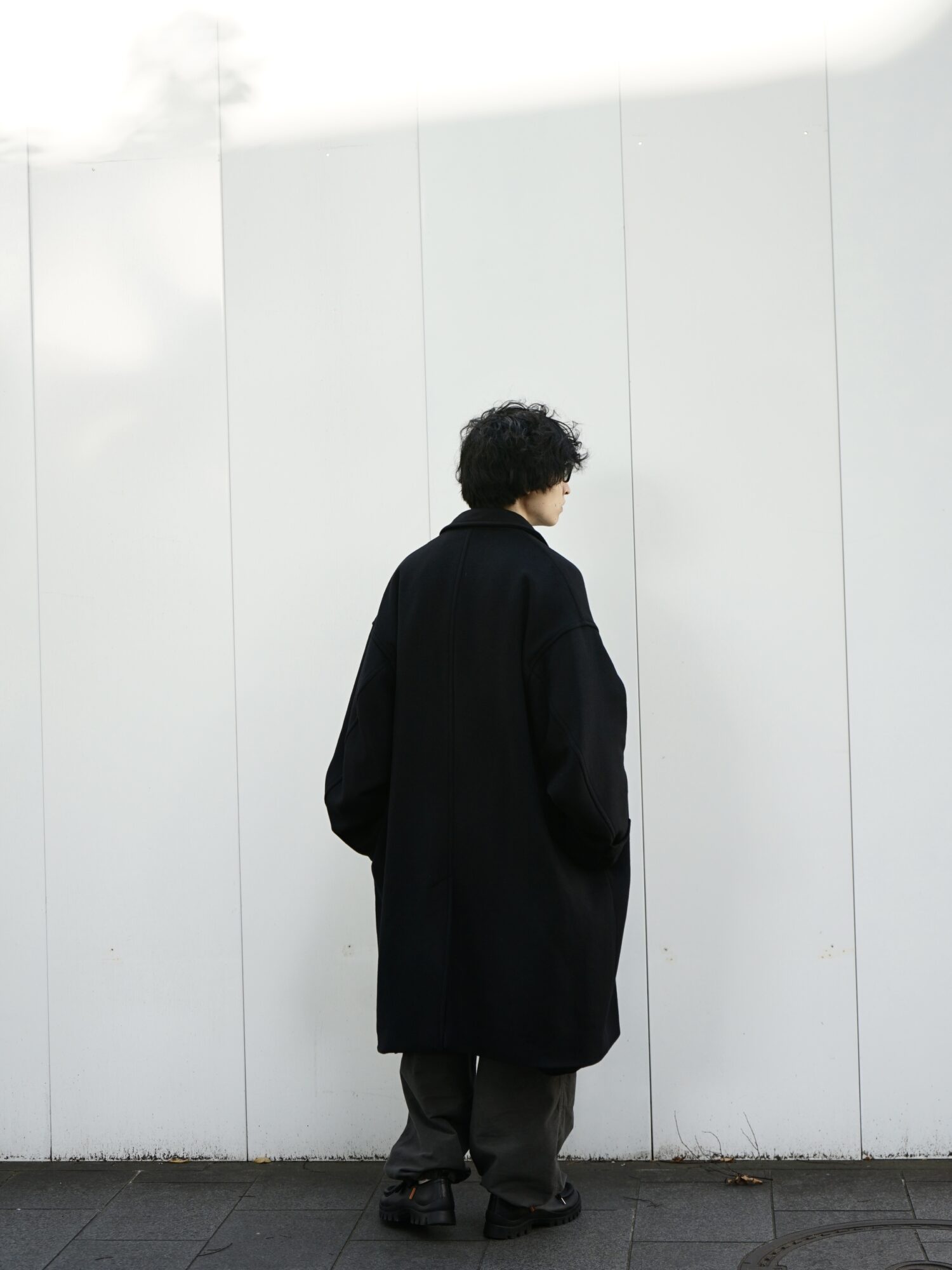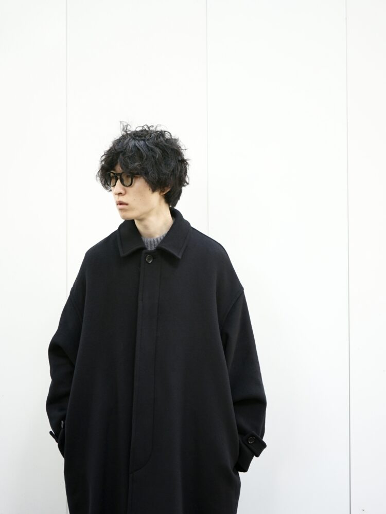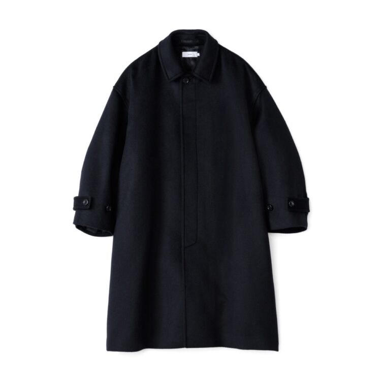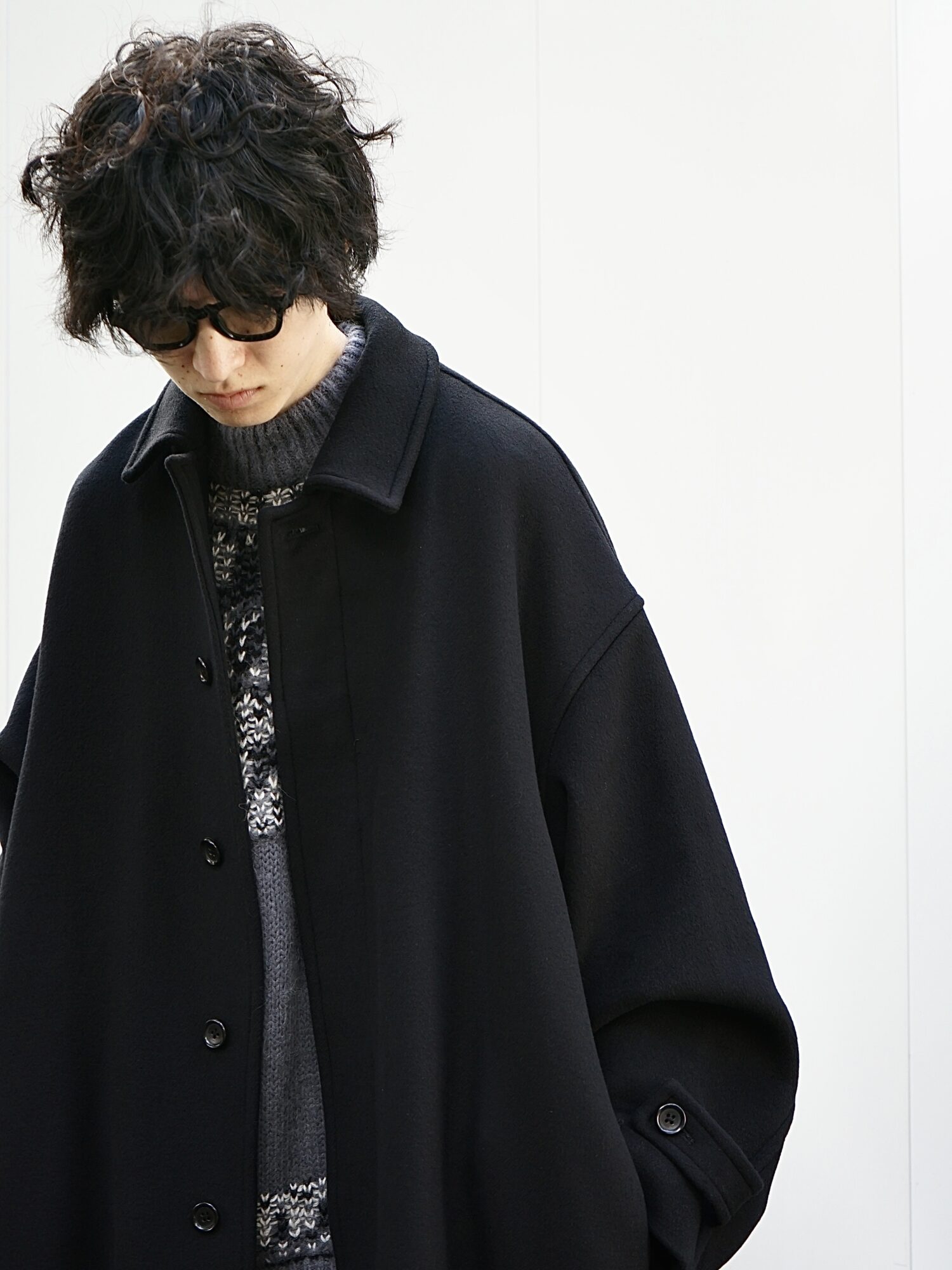 SUPER140’s原料を混紡したダブルメルトンを使用したゆったりとしたオーバーサイズシルエットのステンカラーコート。原料からくる風合いの良さに良さに加えて中糸に水に溶ける糸を混ぜ込むことでふくらみ感がありながら軽く、暖かい空気をため込んでくれる。ショートビーバー仕上げにすることでフラットな見え感でありながらも押し固めないので柔らかくふくらみのある風合いを保っている。