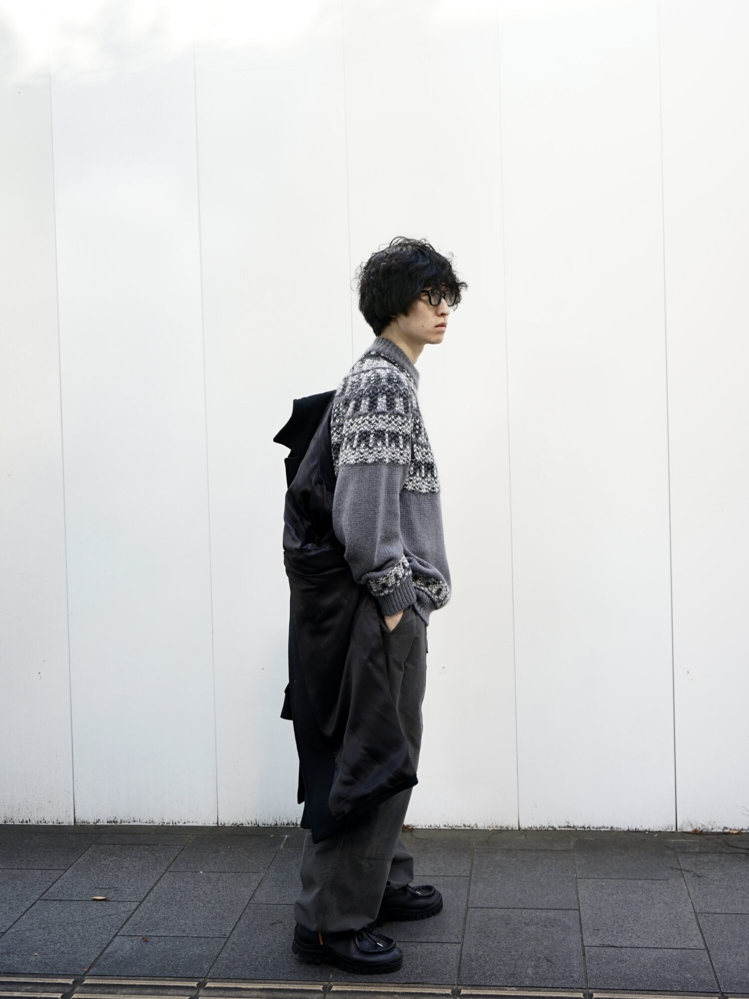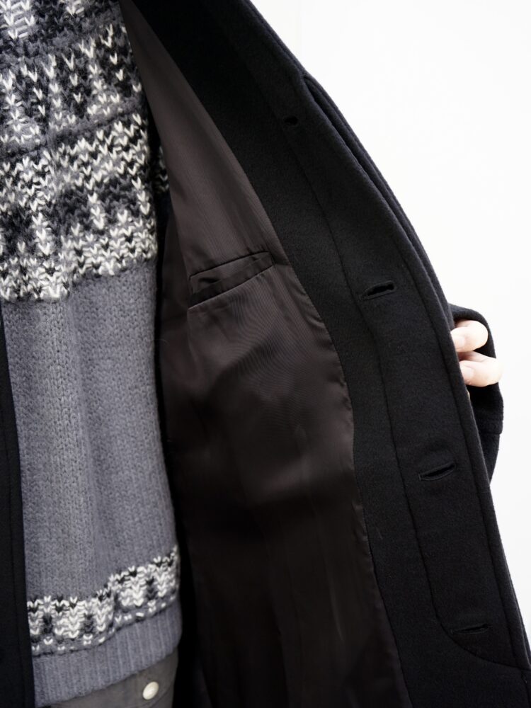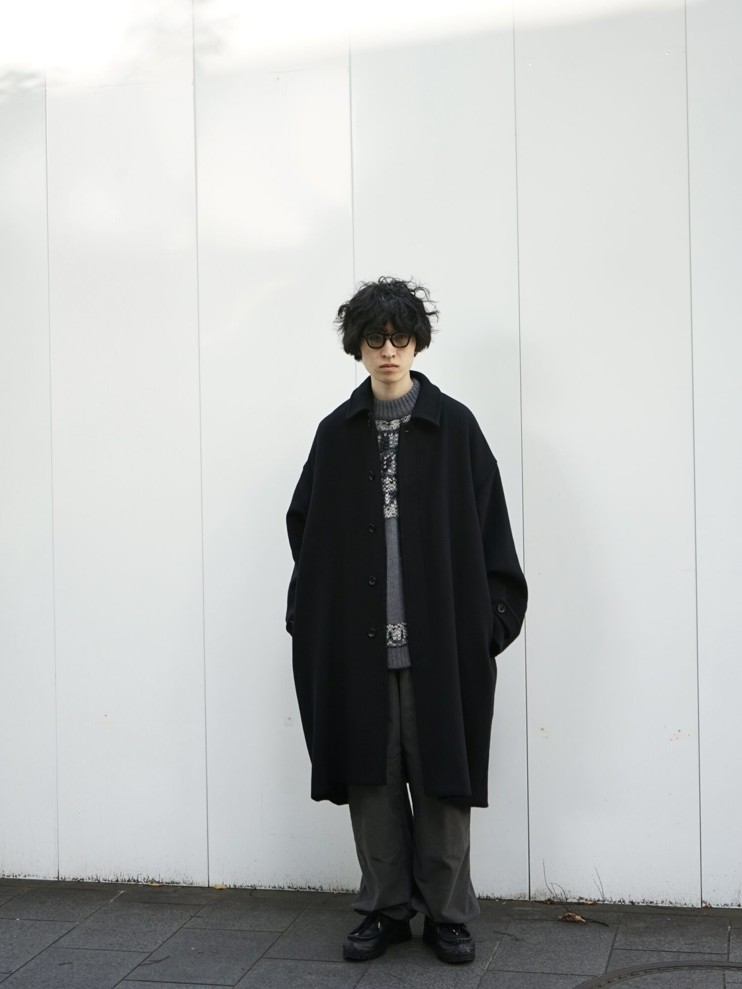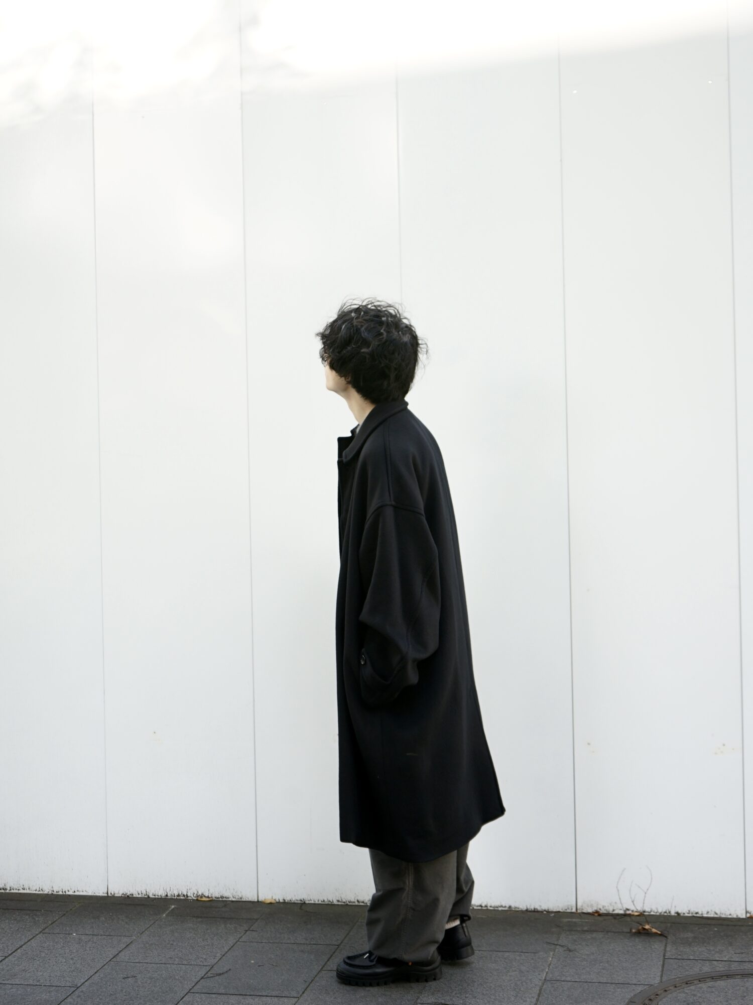 SUPER140’s原料を混紡したダブルメルトンを使用したゆったりとしたオーバーサイズシルエットのステンカラーコート。原料からくる風合いの良さに良さに加えて中糸に水に溶ける糸を混ぜ込むことでふくらみ感がありながら軽く、暖かい空気をため込んでくれる。ショートビーバー仕上げにすることでフラットな見え感でありながらも押し固めないので柔らかくふくらみのある風合いを保っている。