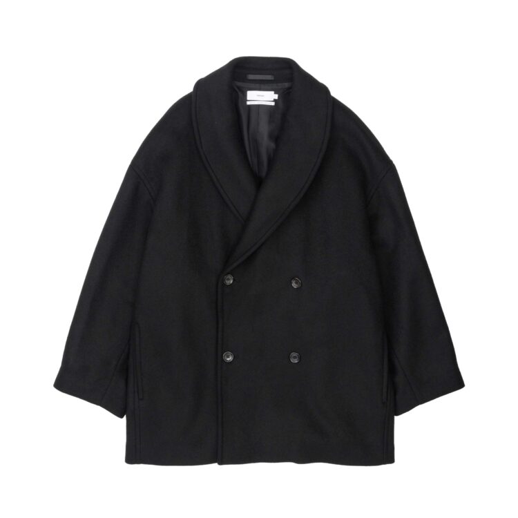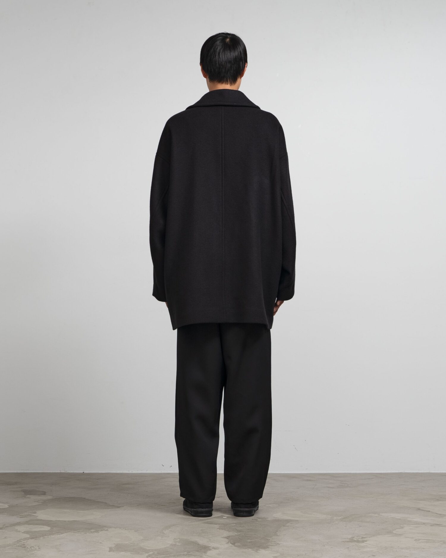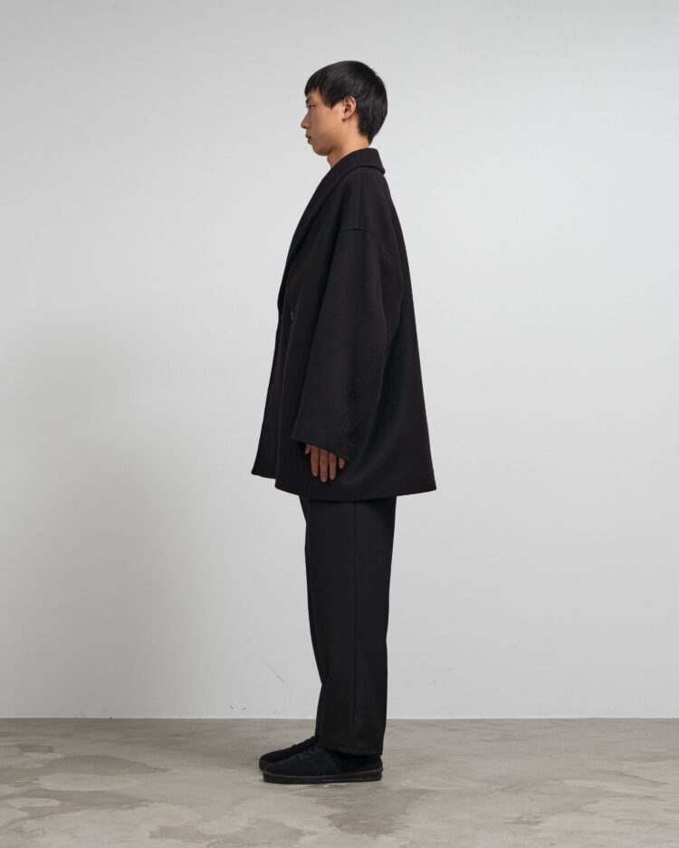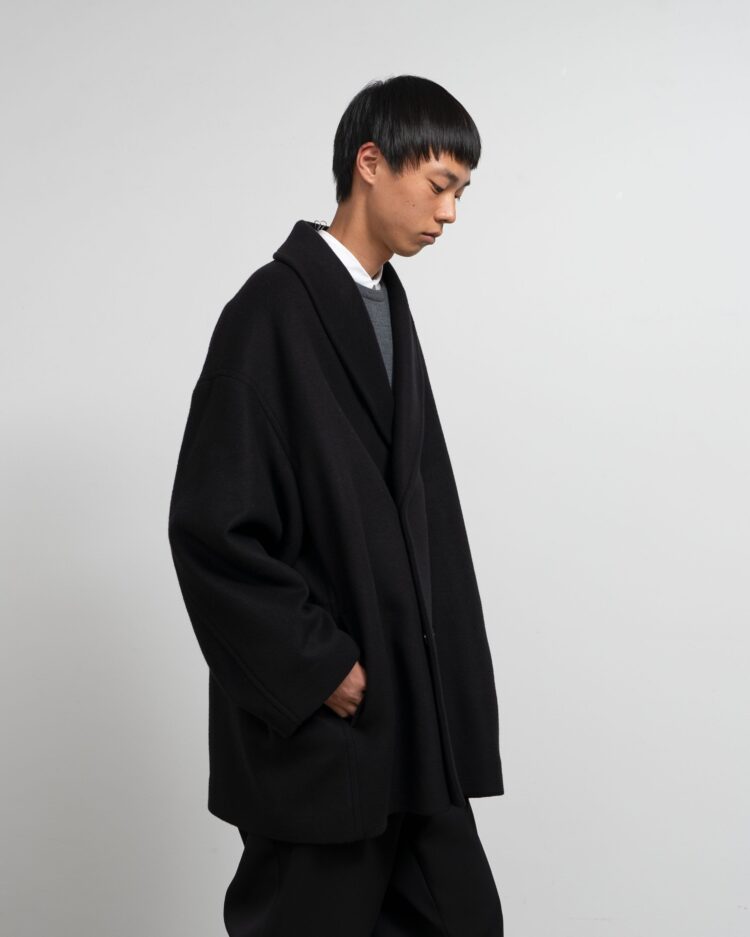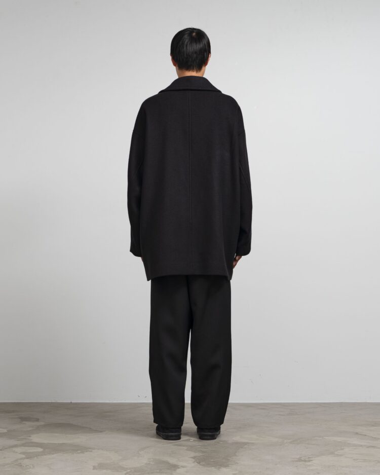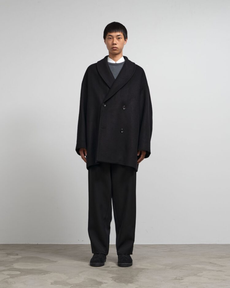 SUPER140’s原料を混紡したダブルメルトンのショールカラーコート。原料からくる風合いの良さに良さに加えて中糸に水に溶ける糸を混ぜ込むことでふくらみ感がありながら軽く、暖かい空気をため込んでくれる。ショートビーバー仕上げにすることでフラットな見え感でありながらも押し固めないので柔らかくふくらみのある風合いを保っている。ミニマルなディテールで着用感は軽くしなやか。長すぎない着丈で幅広い着こなしを可能にする。