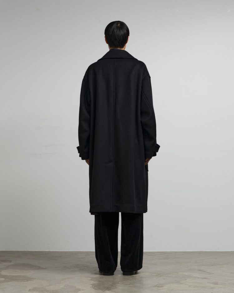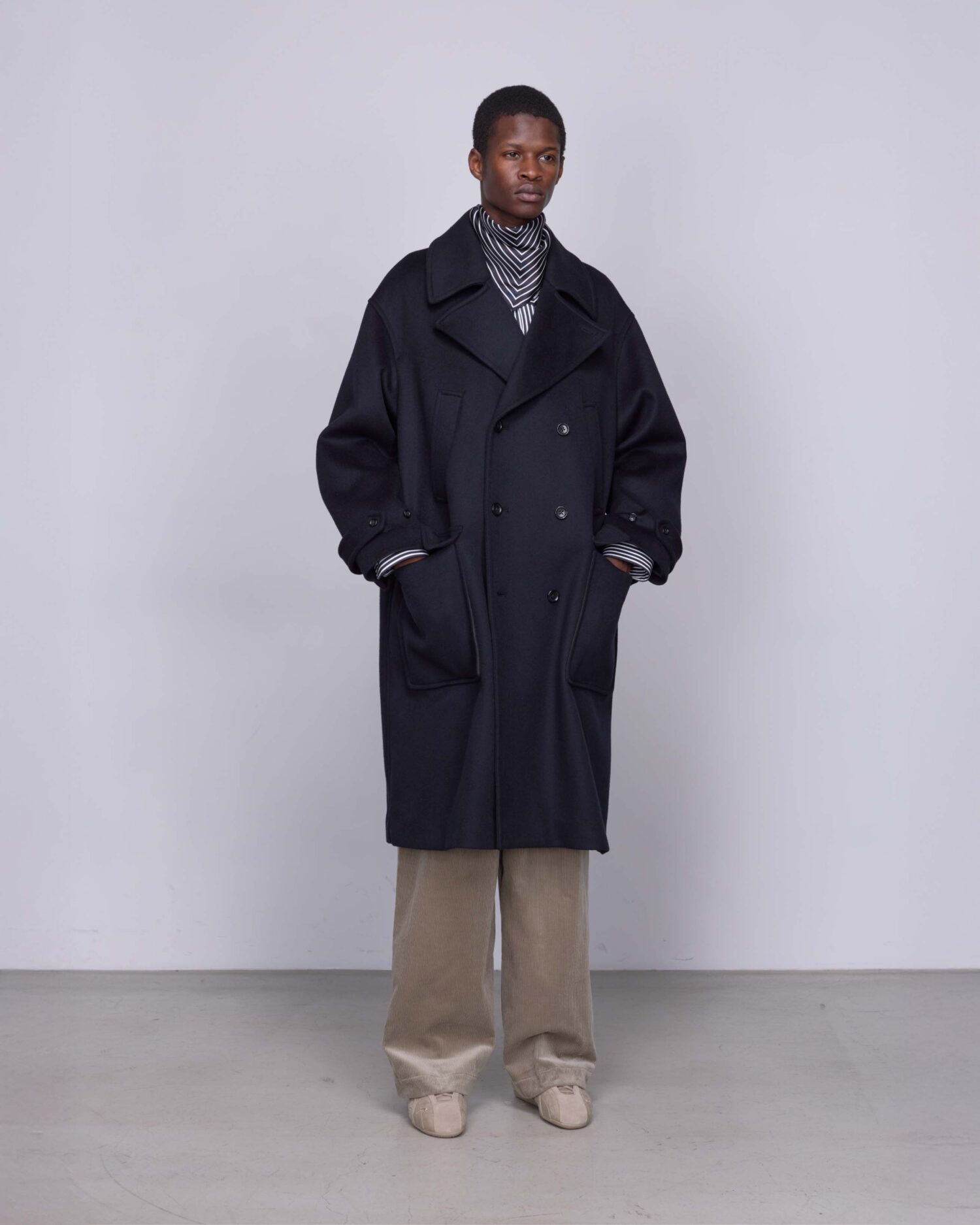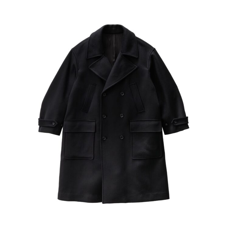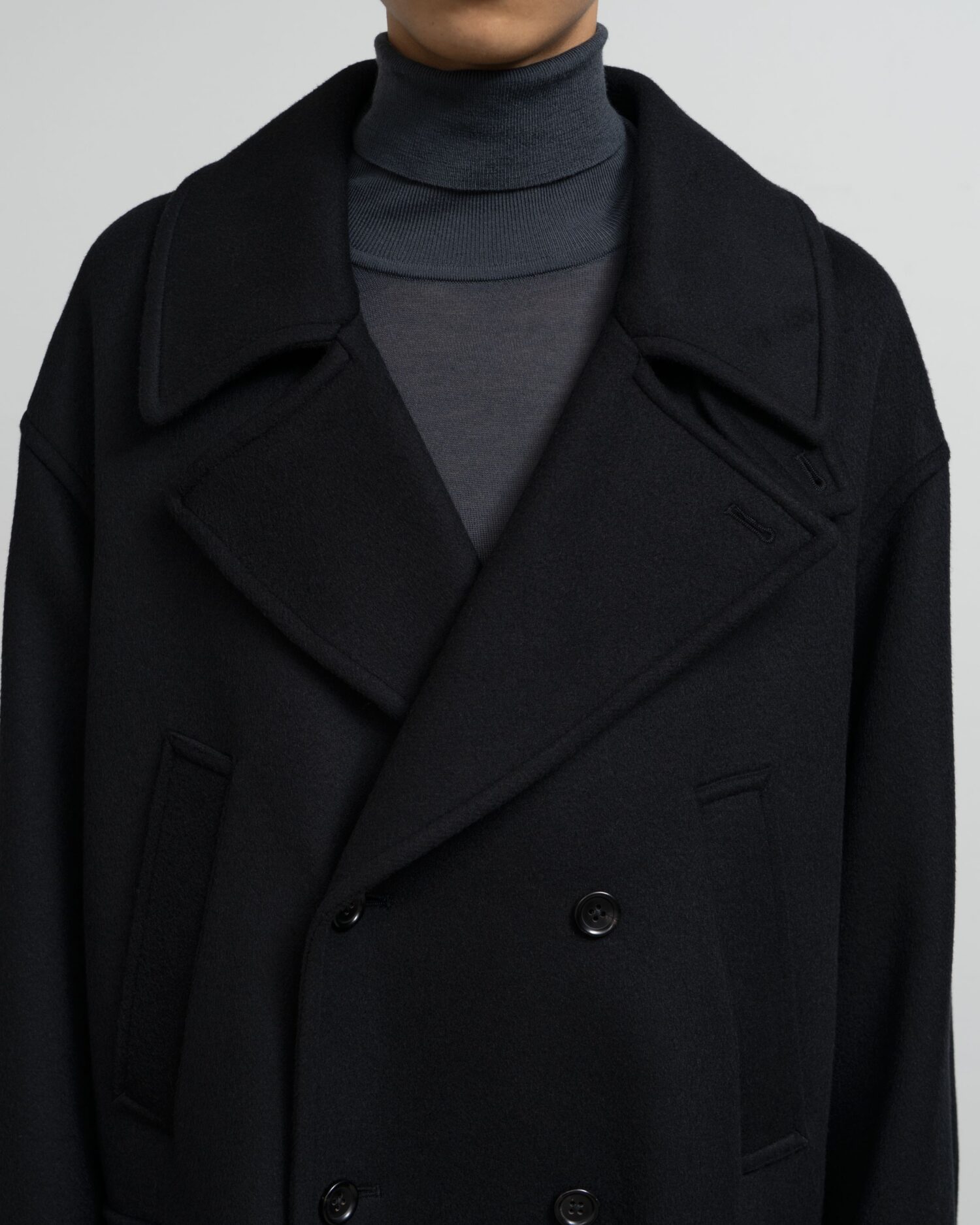 SUPER140’s原料を混紡したダブルメルトンのPコート。原料からくる風合いの良さに良さに加えて中糸に水に溶ける糸を混ぜ込むことでふくらみ感がありながら軽く、暖かい空気をため込んでくれる。ショートビーバー仕上げにすることでフラットな見え感でありながらも押し固めないので柔らかくふくらみのある風合いを保っている。