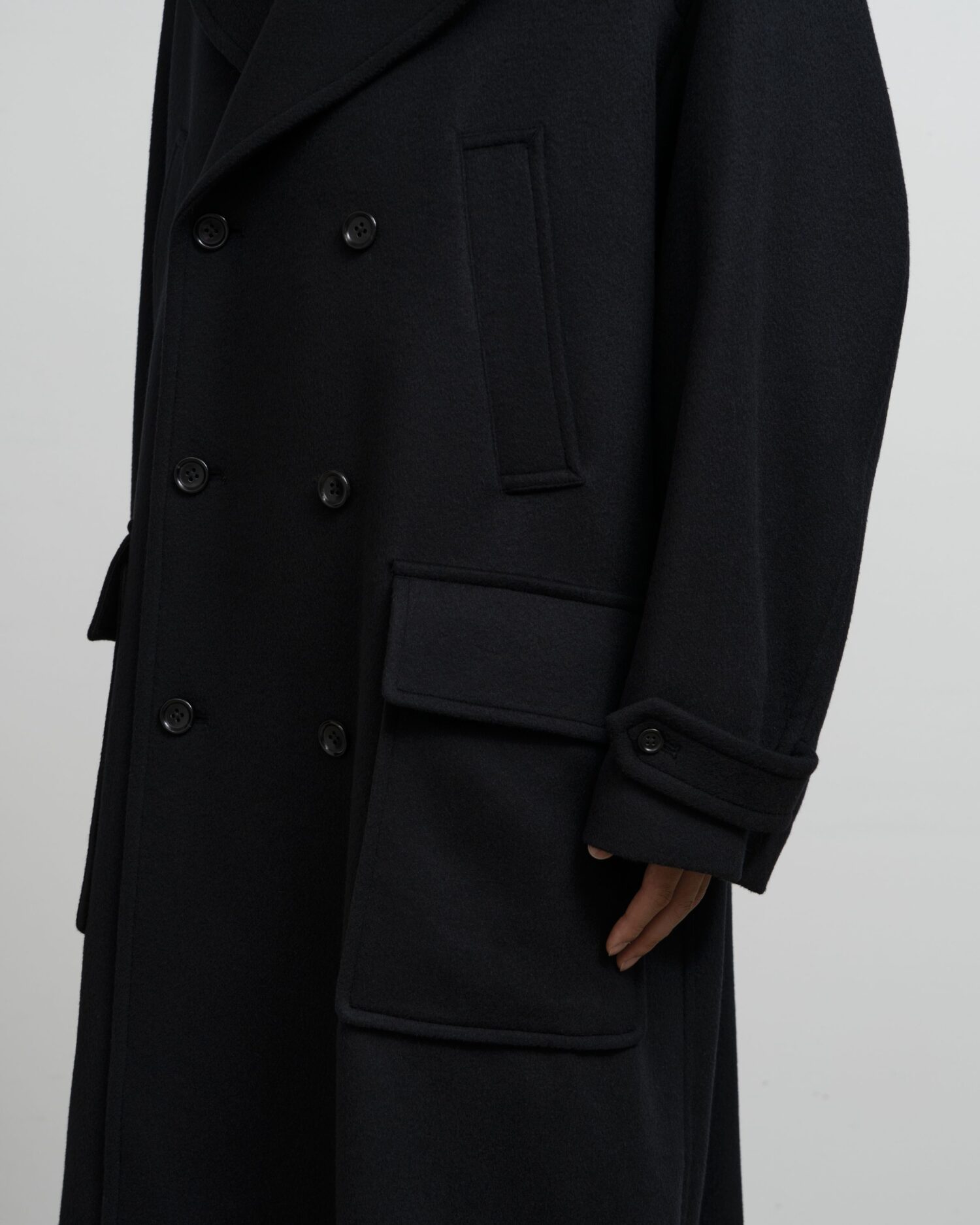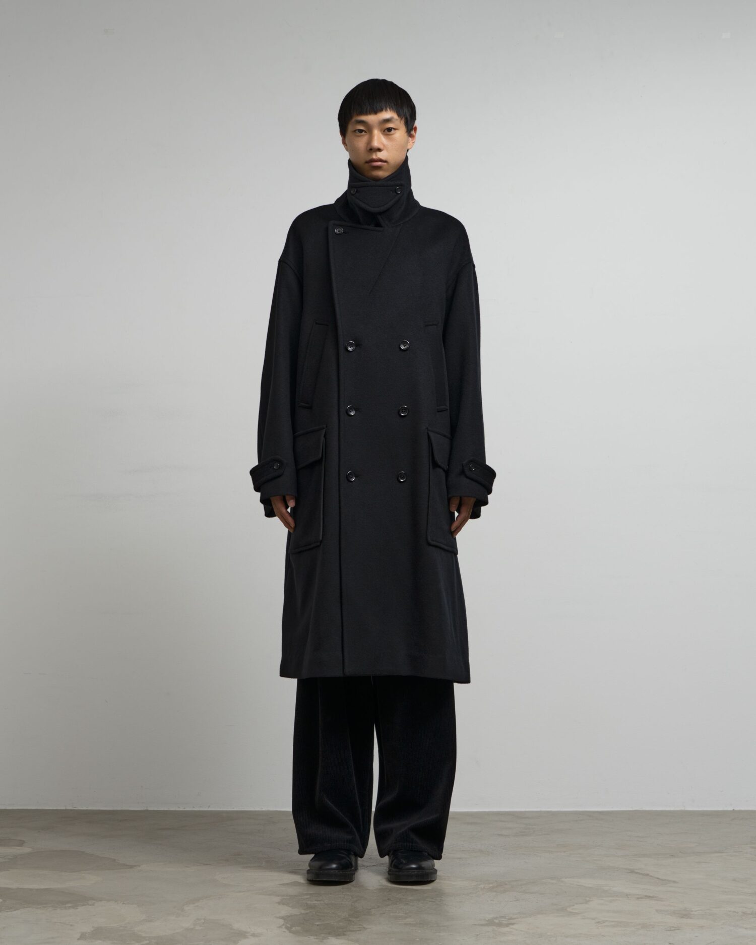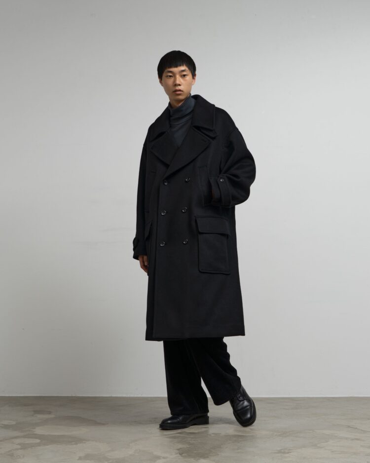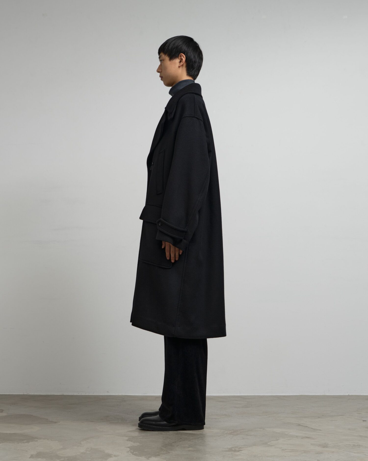 SUPER140’s原料を混紡したダブルメルトンのPコート。原料からくる風合いの良さに良さに加えて中糸に水に溶ける糸を混ぜ込むことでふくらみ感がありながら軽く、暖かい空気をため込んでくれる。ショートビーバー仕上げにすることでフラットな見え感でありながらも押し固めないので柔らかくふくらみのある風合いを保っている。
