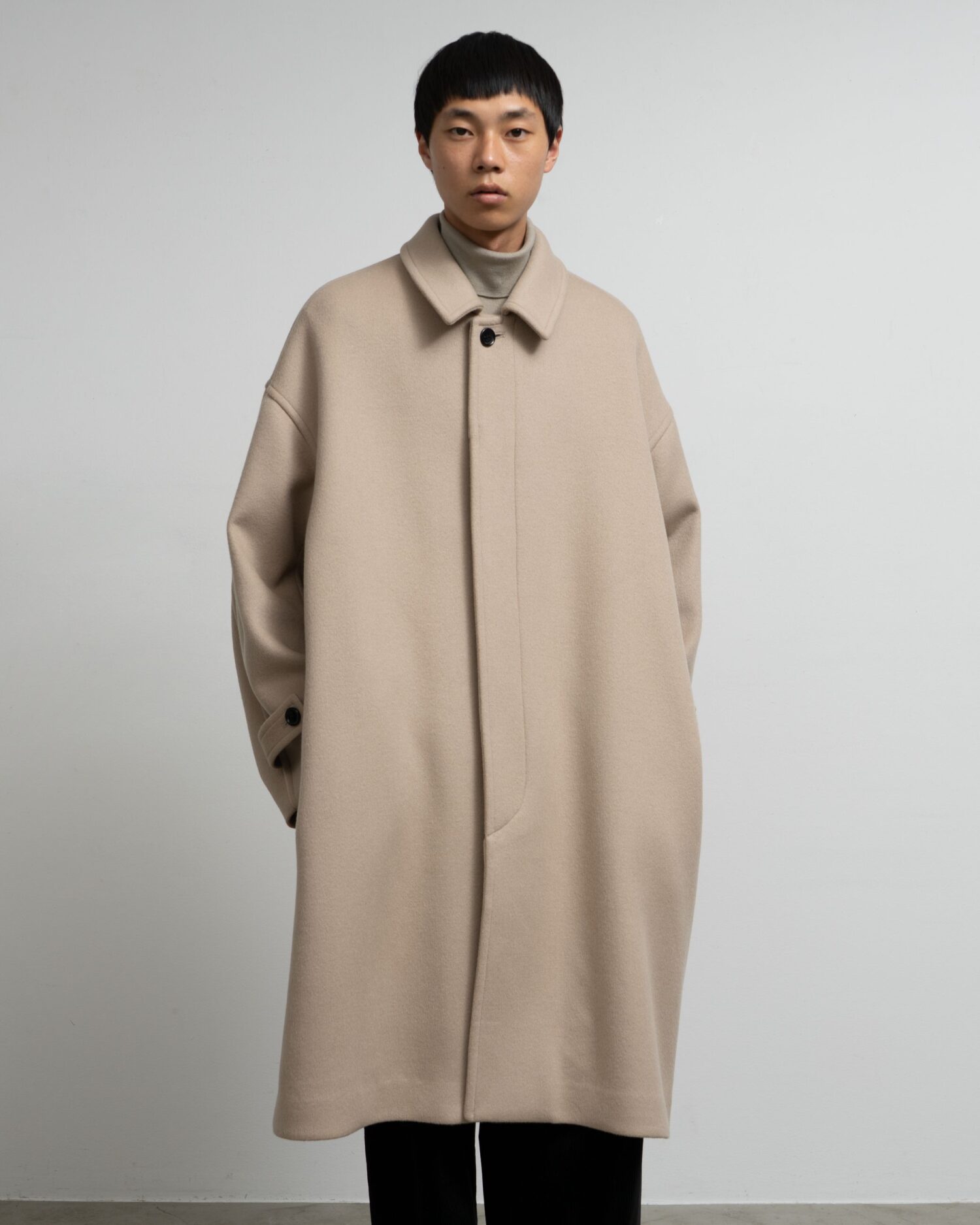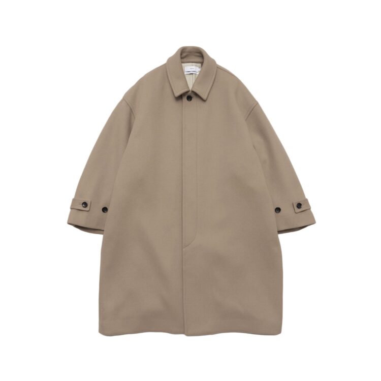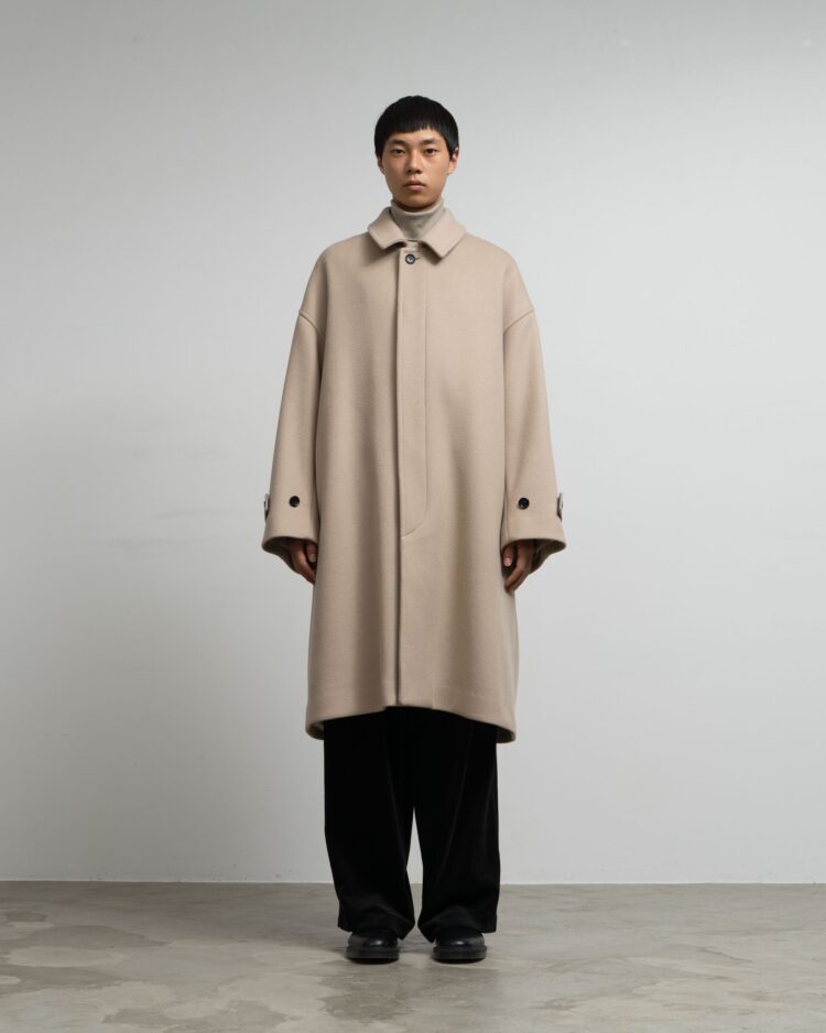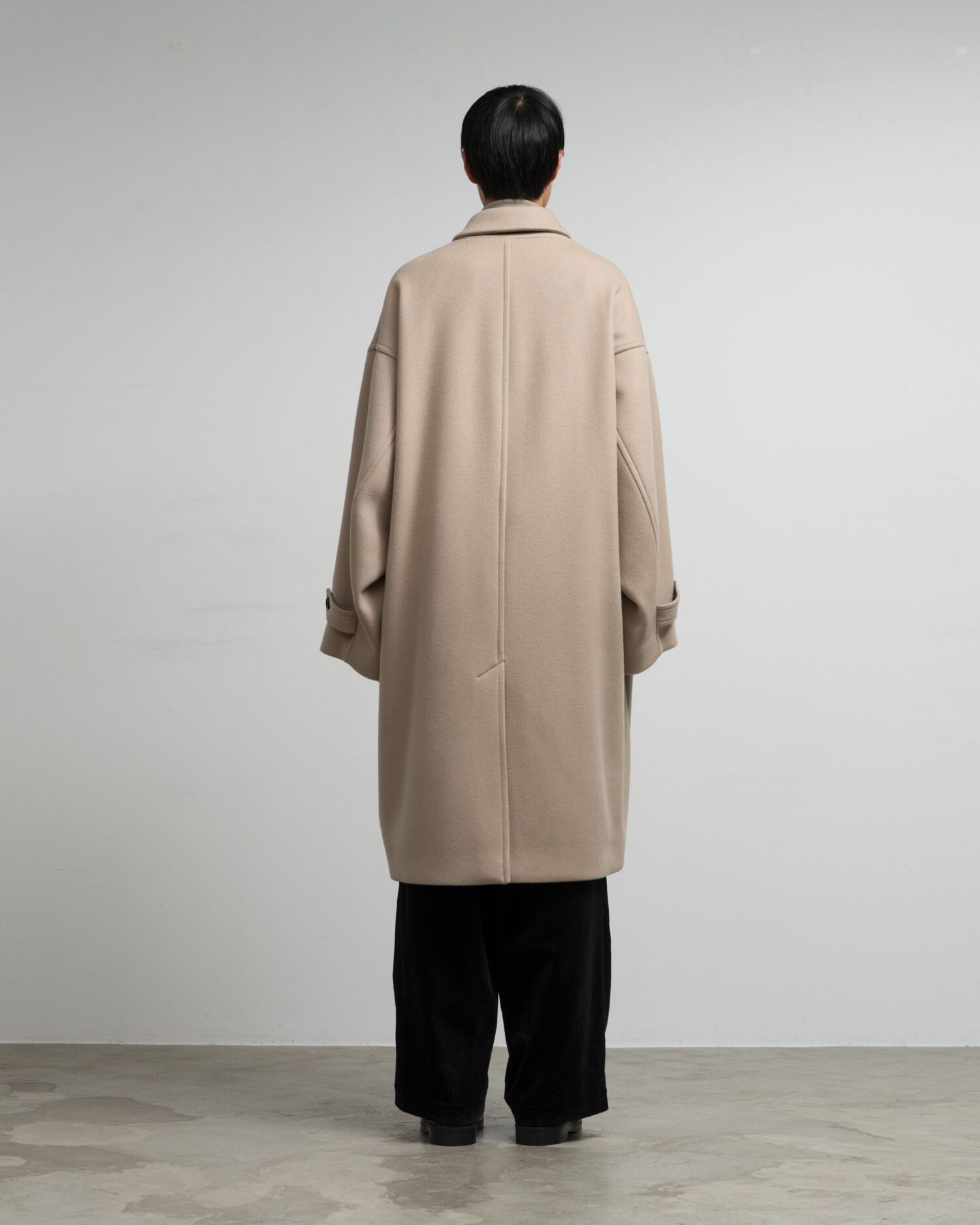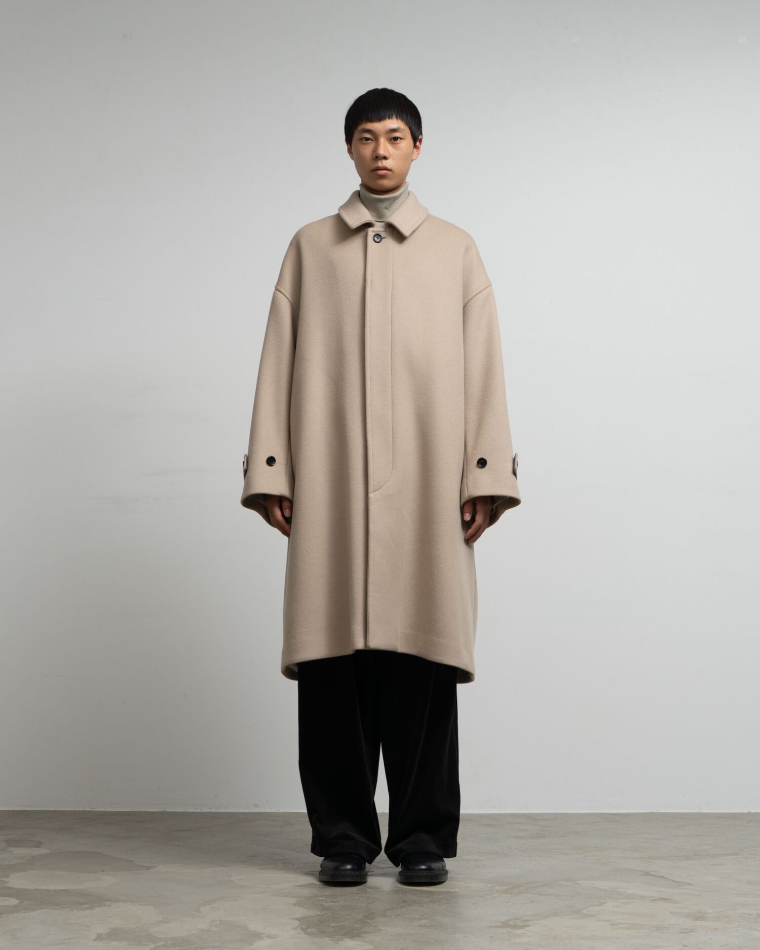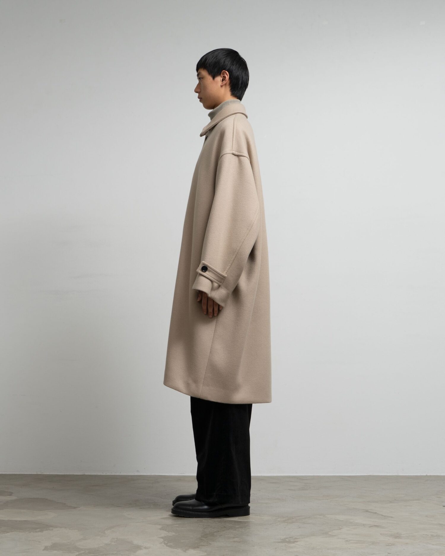 SUPER140’s原料を混紡したダブルメルトンを使用したゆったりとしたオーバーサイズシルエットのステンカラーコート。原料からくる風合いの良さに良さに加えて中糸に水に溶ける糸を混ぜ込むことでふくらみ感がありながら軽く、暖かい空気をため込んでくれる。ショートビーバー仕上げにすることでフラットな見え感でありながらも押し固めないので柔らかくふくらみのある風合いを保っている。