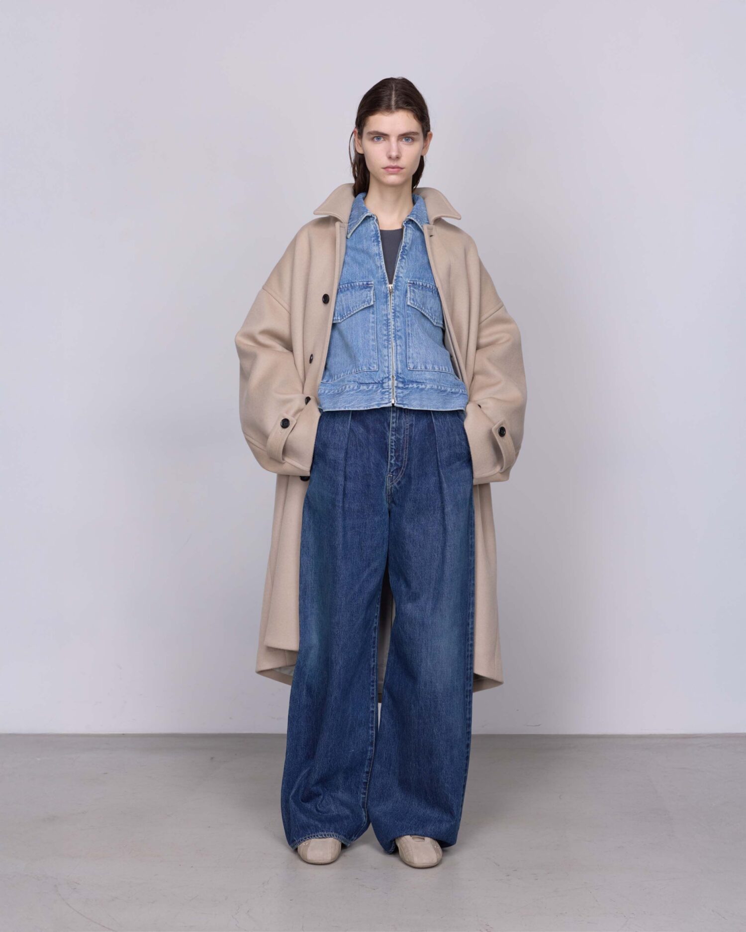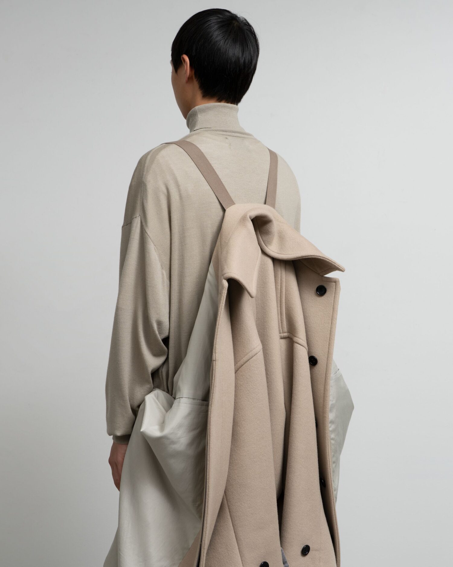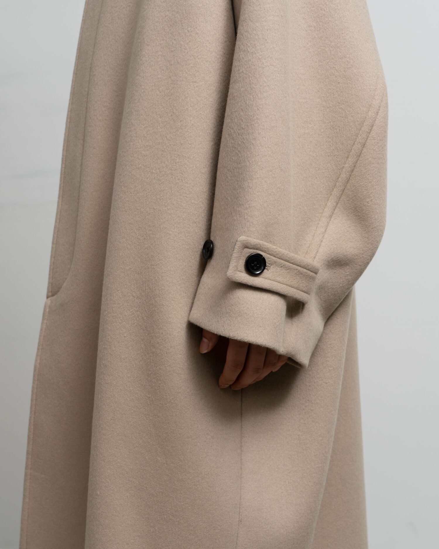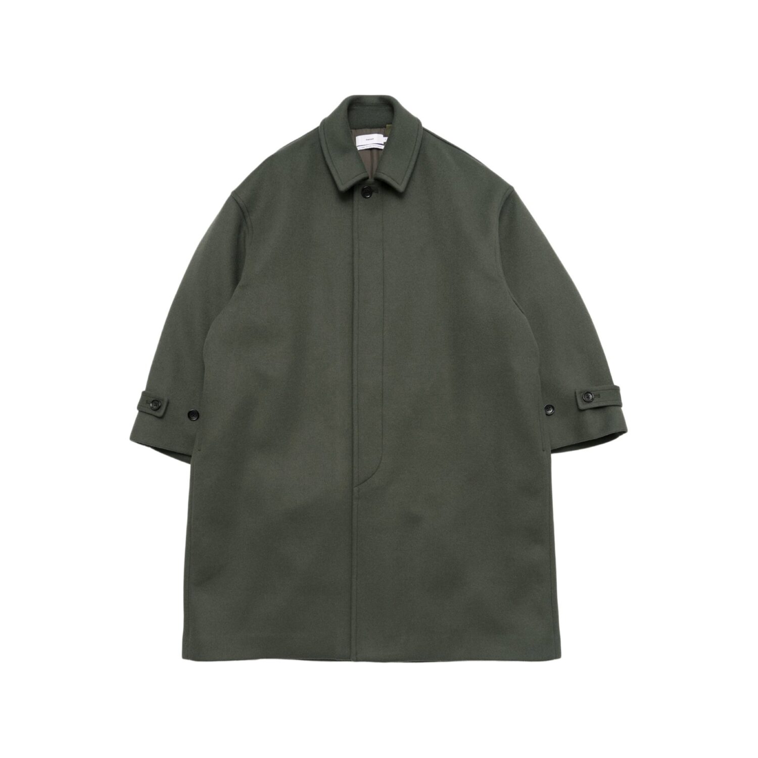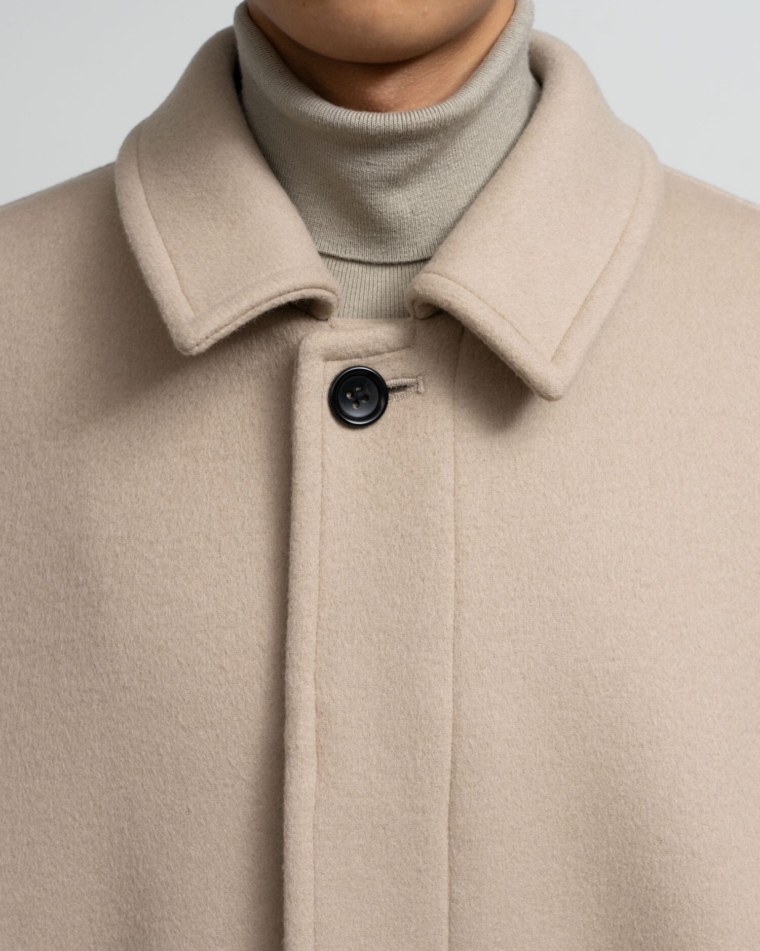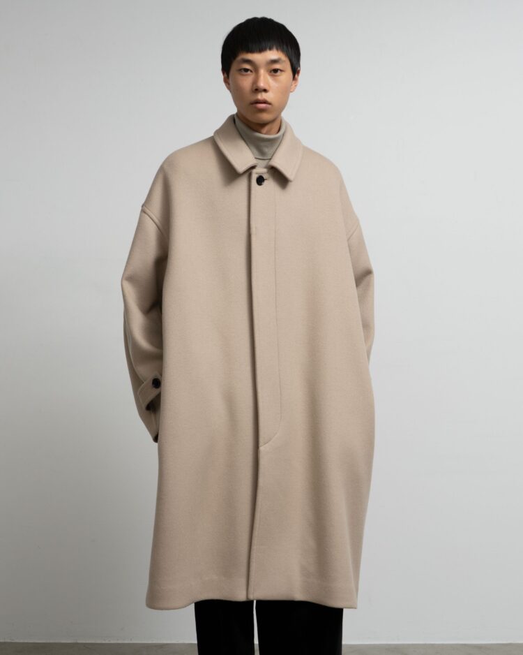 SUPER140’s原料を混紡したダブルメルトンを使用したゆったりとしたオーバーサイズシルエットのステンカラーコート。原料からくる風合いの良さに良さに加えて中糸に水に溶ける糸を混ぜ込むことでふくらみ感がありながら軽く、暖かい空気をため込んでくれる。ショートビーバー仕上げにすることでフラットな見え感でありながらも押し固めないので柔らかくふくらみのある風合いを保っている。