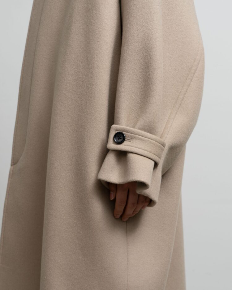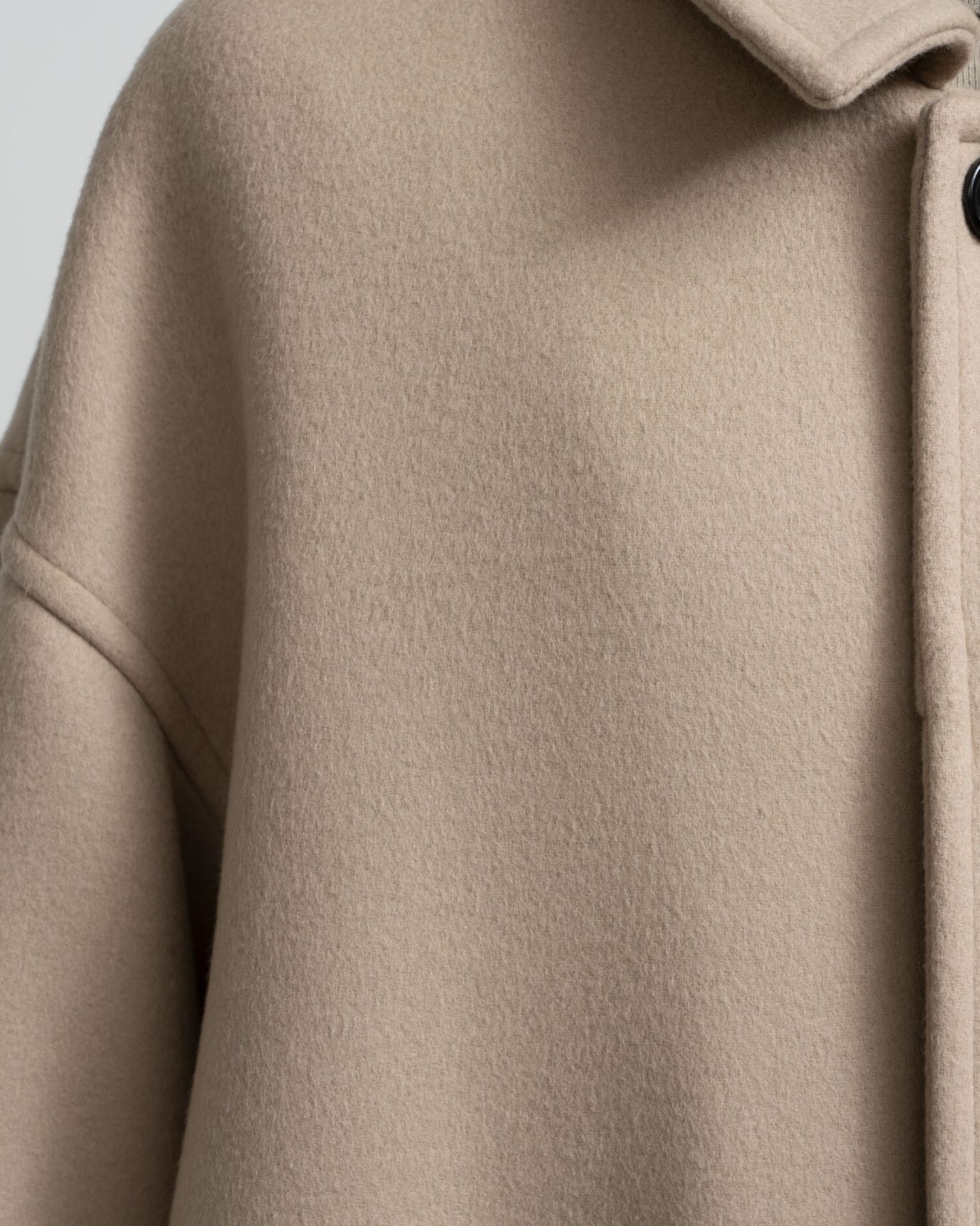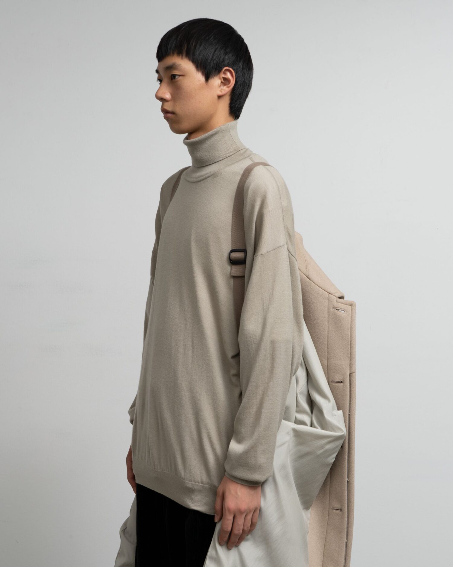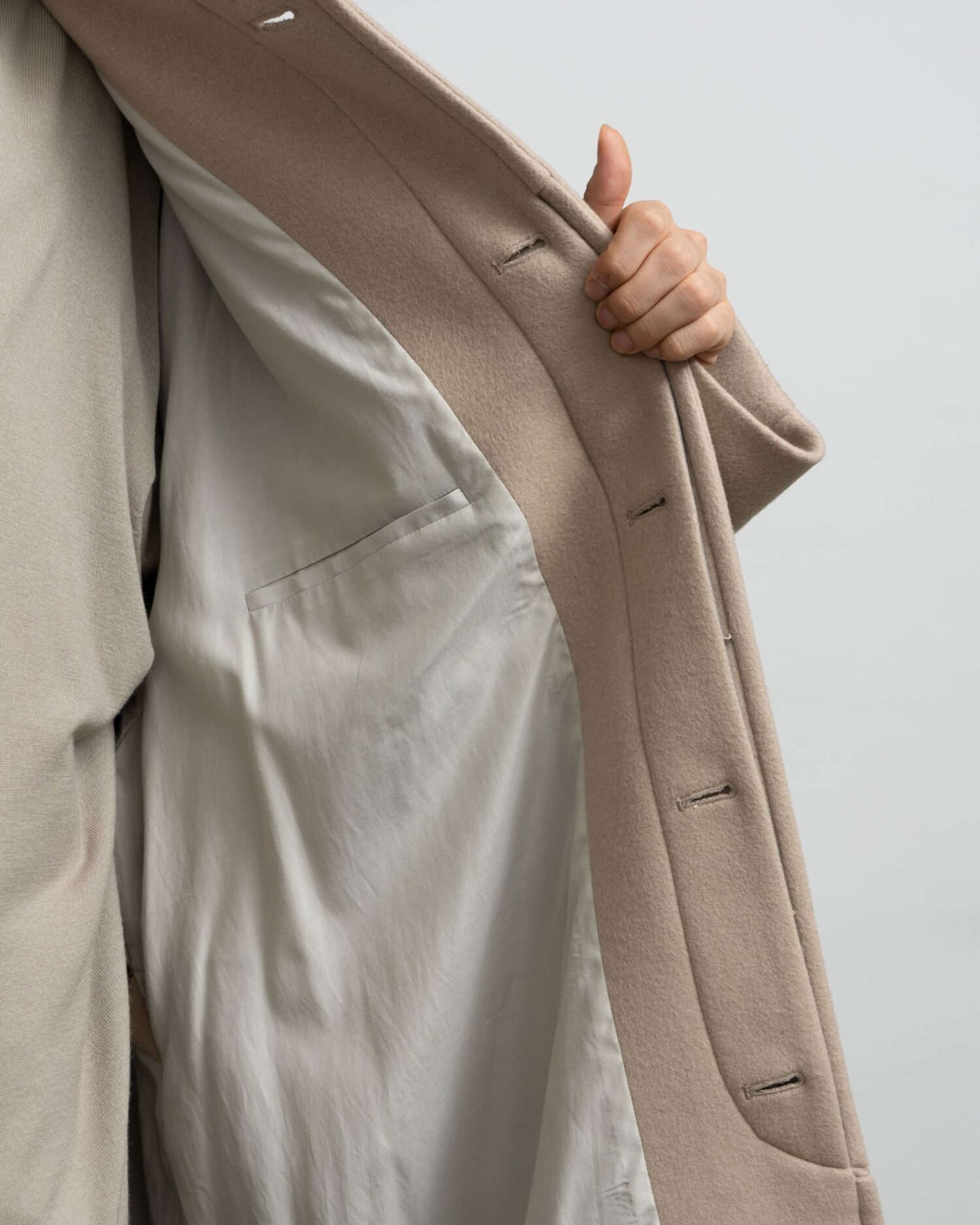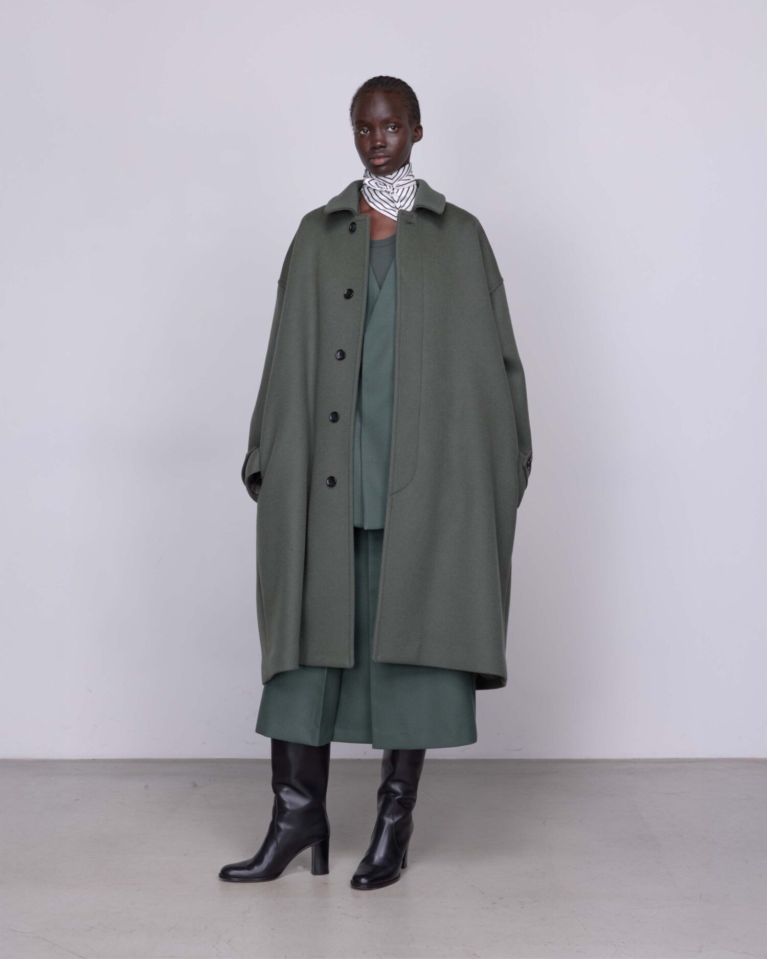 SUPER140’s原料を混紡したダブルメルトンを使用したゆったりとしたオーバーサイズシルエットのステンカラーコート。原料からくる風合いの良さに良さに加えて中糸に水に溶ける糸を混ぜ込むことでふくらみ感がありながら軽く、暖かい空気をため込んでくれる。ショートビーバー仕上げにすることでフラットな見え感でありながらも押し固めないので柔らかくふくらみのある風合いを保っている。