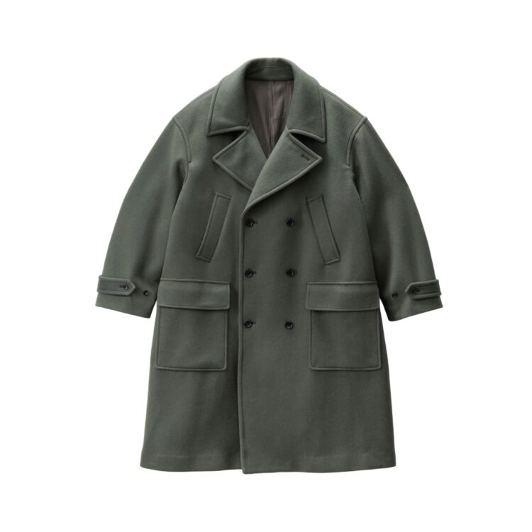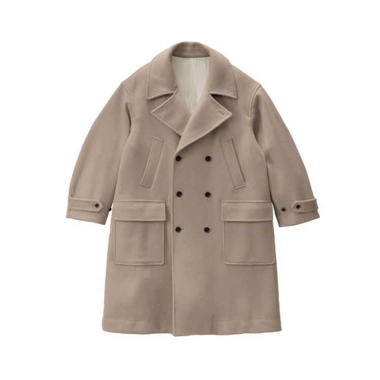 SUPER140’s原料を混紡したダブルメルトンのPコート。原料からくる風合いの良さに良さに加えて中糸に水に溶ける糸を混ぜ込むことでふくらみ感がありながら軽く、暖かい空気をため込んでくれる。ショートビーバー仕上げにすることでフラットな見え感でありながらも押し固めないので柔らかくふくらみのある風合いを保っている。