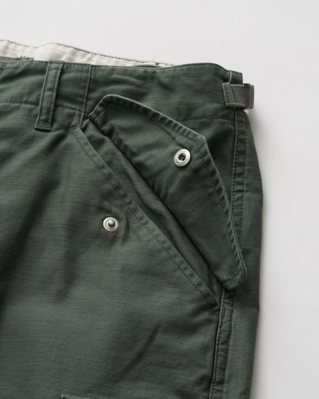 ウエストのサイドアジャスターをゴムでつなぎ合わせる事により腰廻の伸縮性が増し、快適な着心地。裾にドローコードを設けてありシルエットが可能。