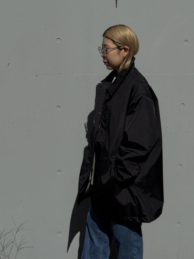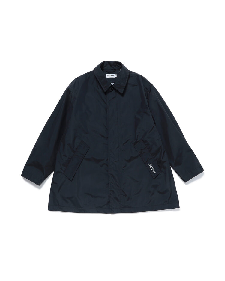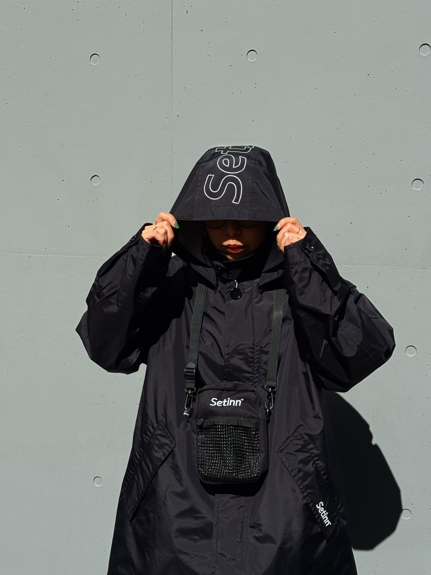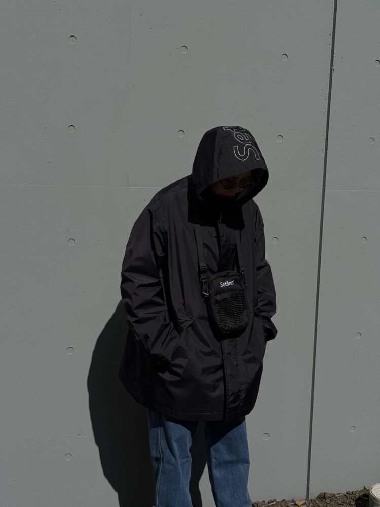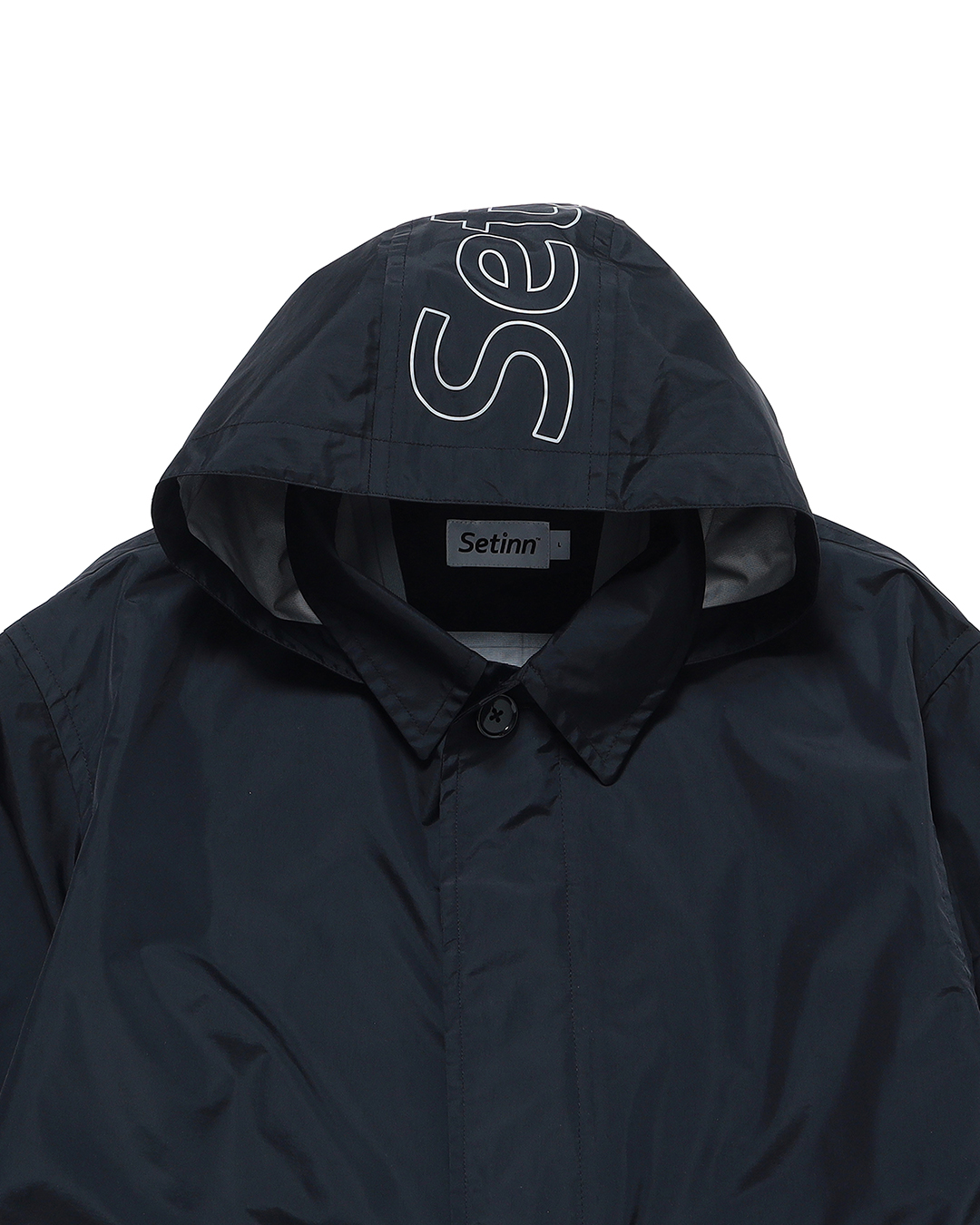 撥水性のある高機能素材を使用した、ミドル丈のコートです。フード部分は取り外し可能で大胆にブランドロゴをリフレクタープリントしています。左のポケット口には反射糸で施されたロゴの刺繍がアクセントになります。