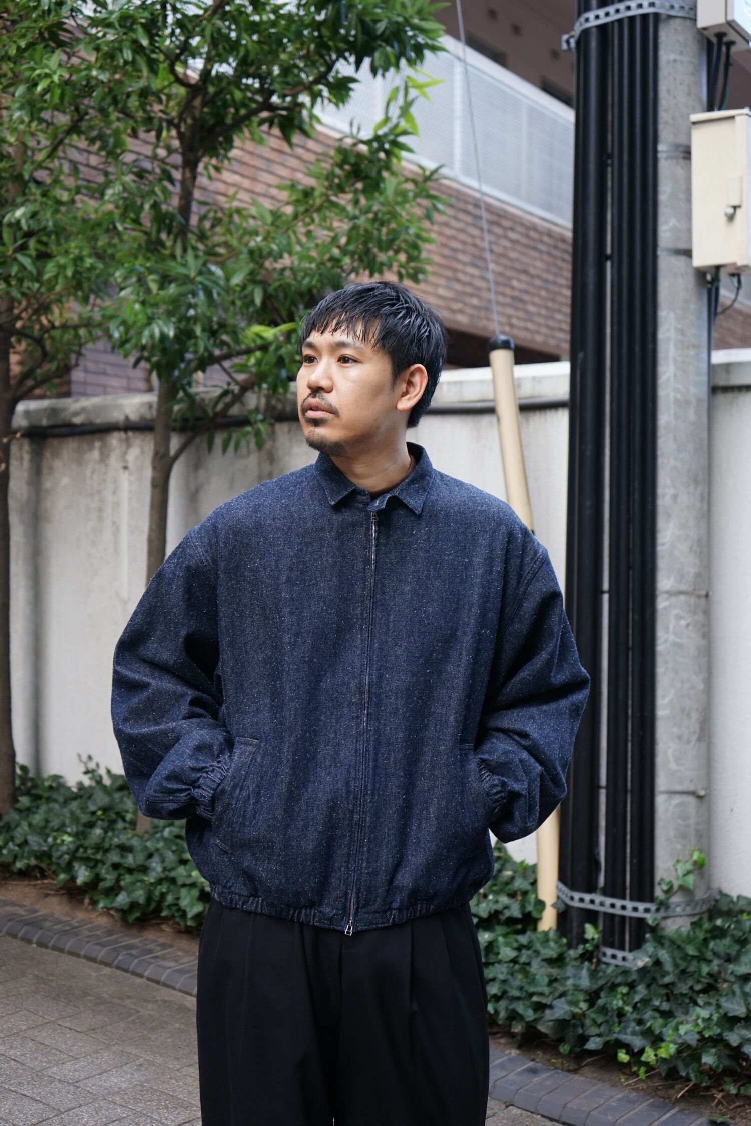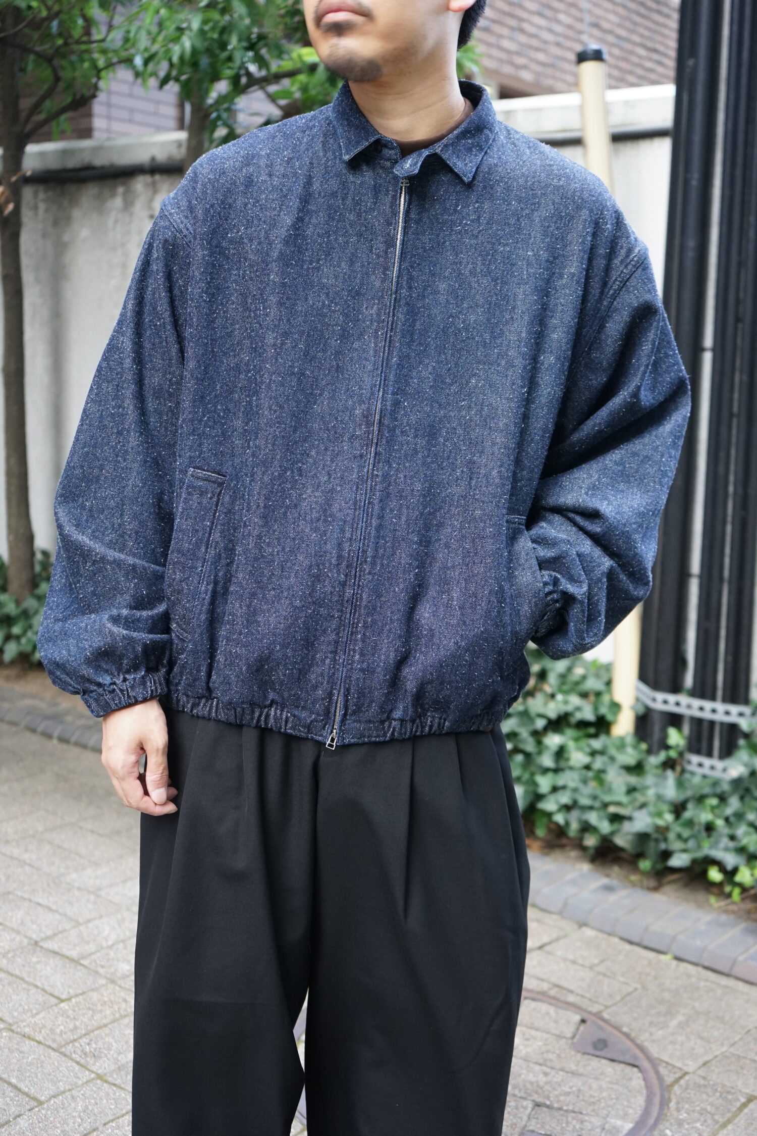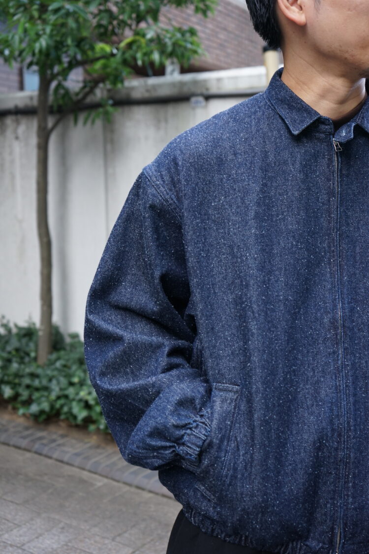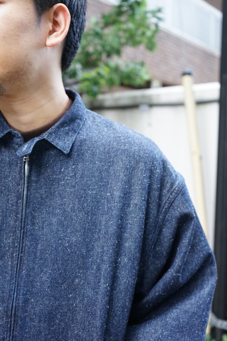 コットンとシルクノイルのデニム生地を使用したスイングトップ。ゆったりとした身幅と肩幅、裾と袖はゴムを入れていて、全体的に丸くソフトなシルエット。