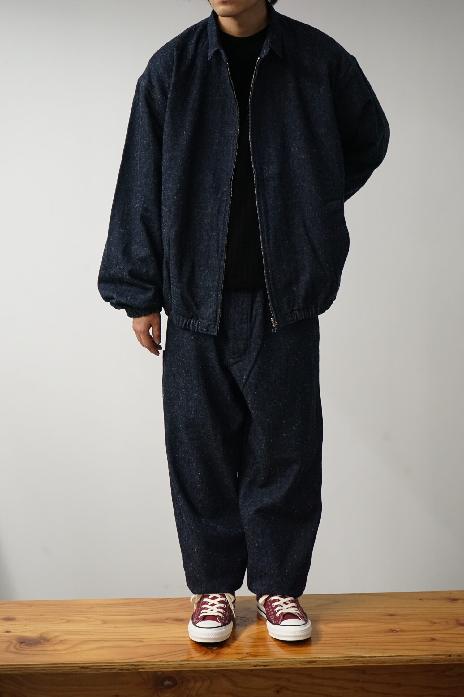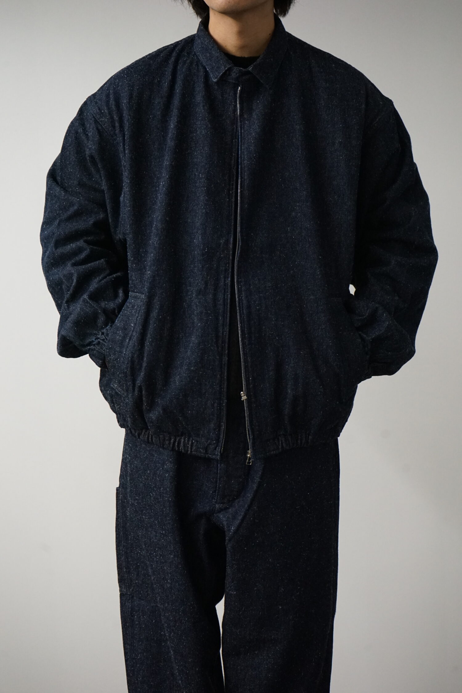 コットンとシルクノイルのデニム生地を使用したスイングトップ。ゆったりとした身幅と肩幅、裾と袖はゴムを入れていて、全体的に丸くソフトなシルエット。