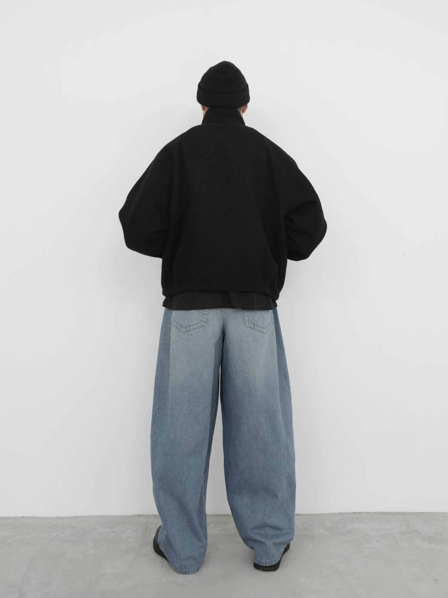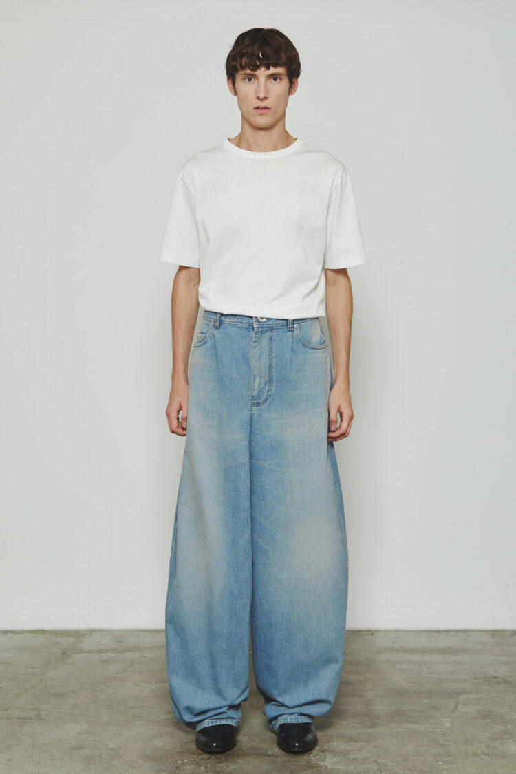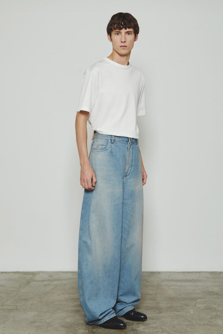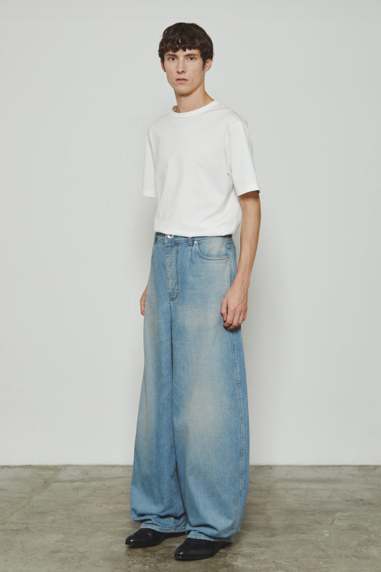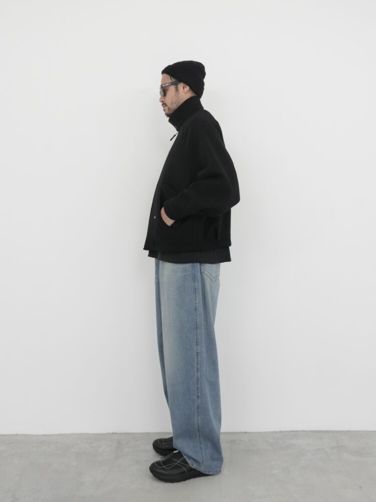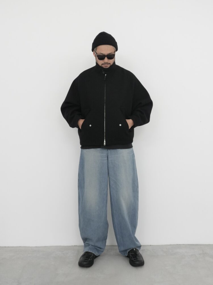 ヒップから裾にかけてやや丸みのあるデザインとなっており、ワタリが非常にワイドな寸法で、裾までカーブを描きながらヒップ周りの曲線がダイナミックで立体感のあるシルエットを生み出しています。