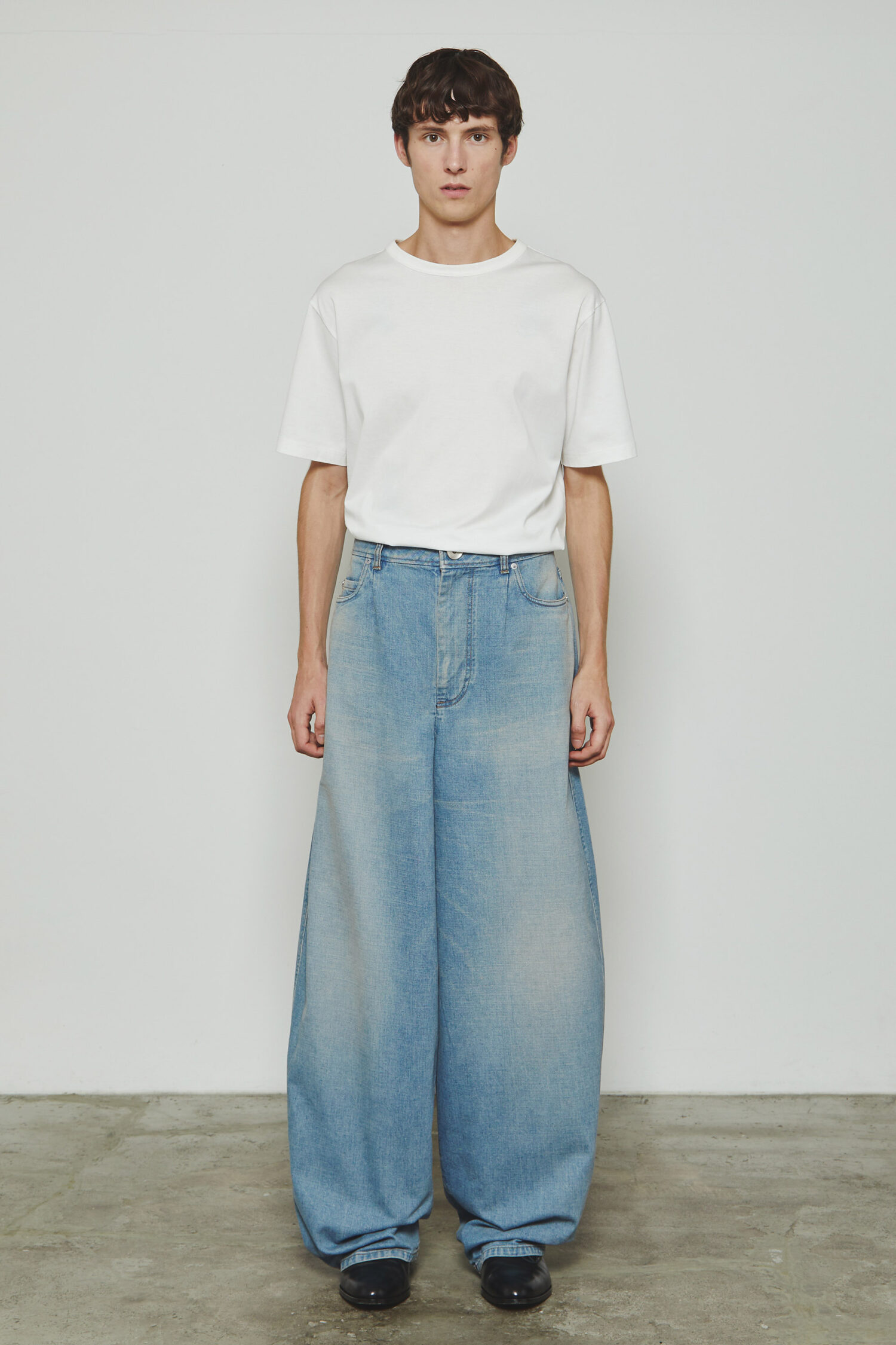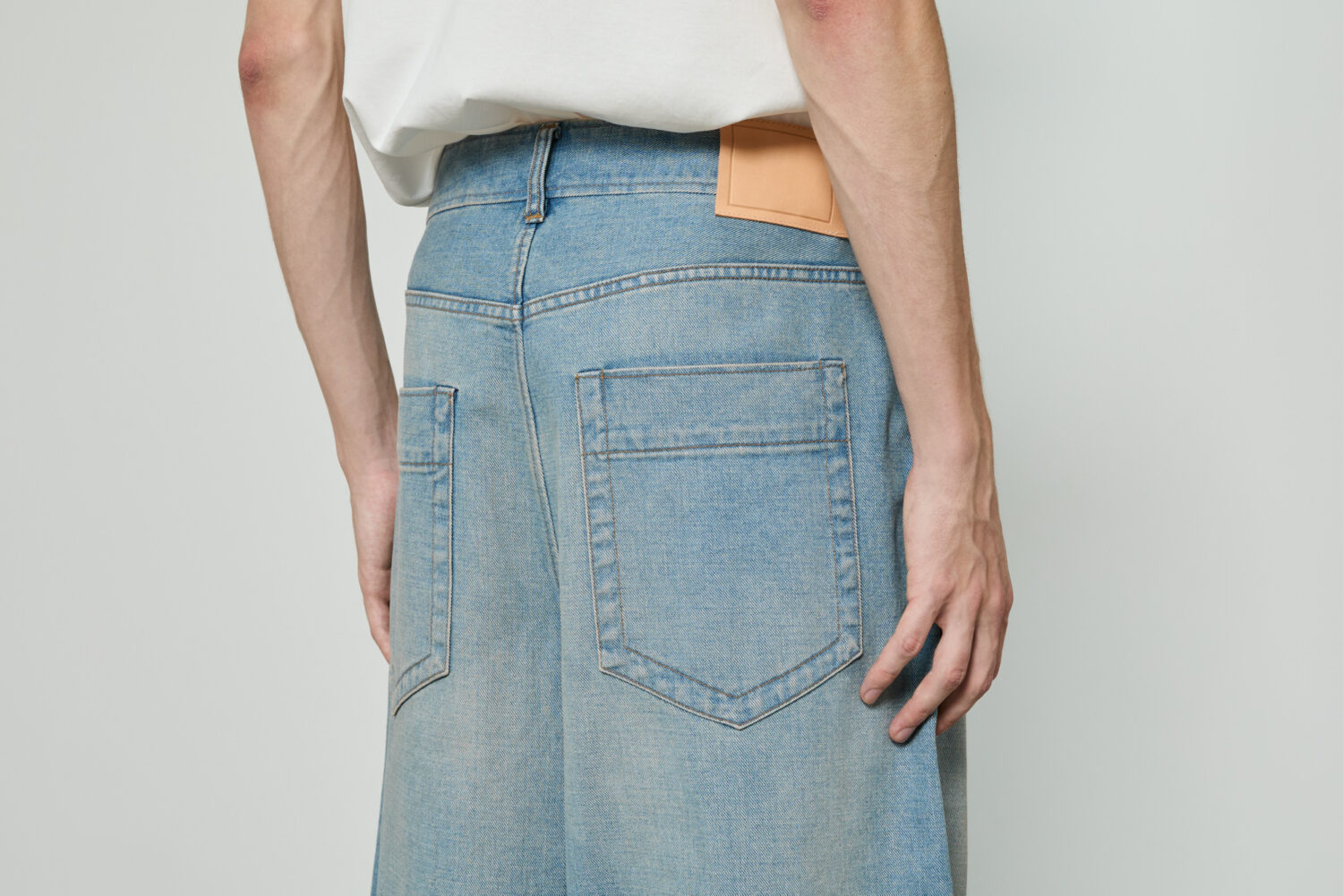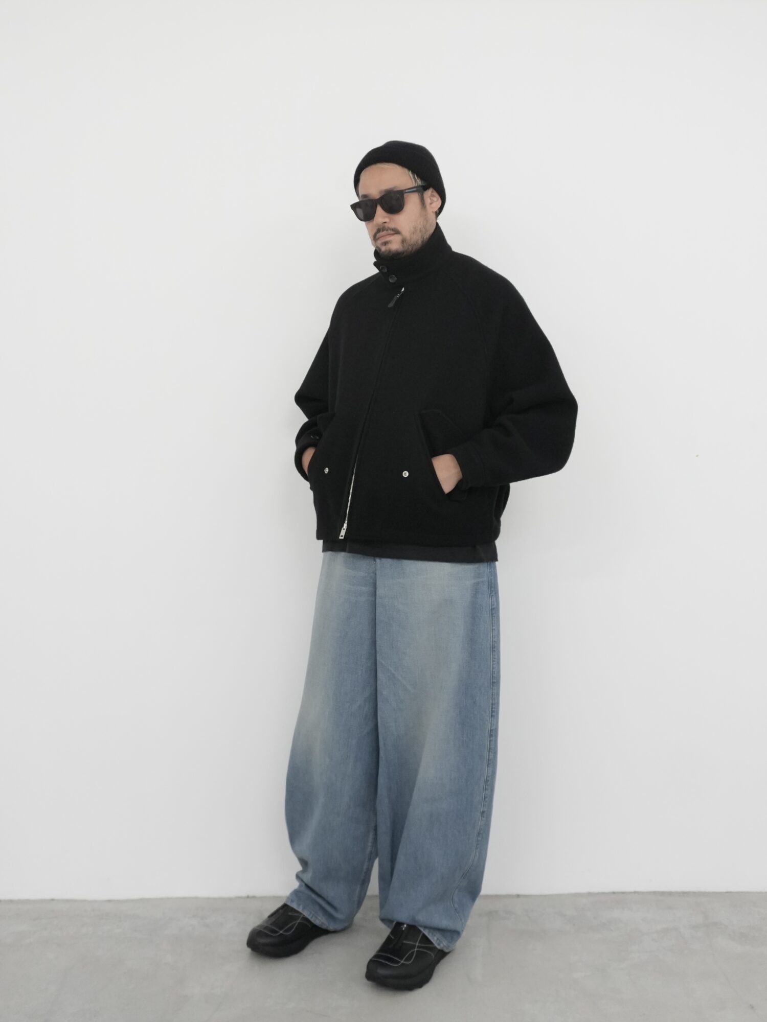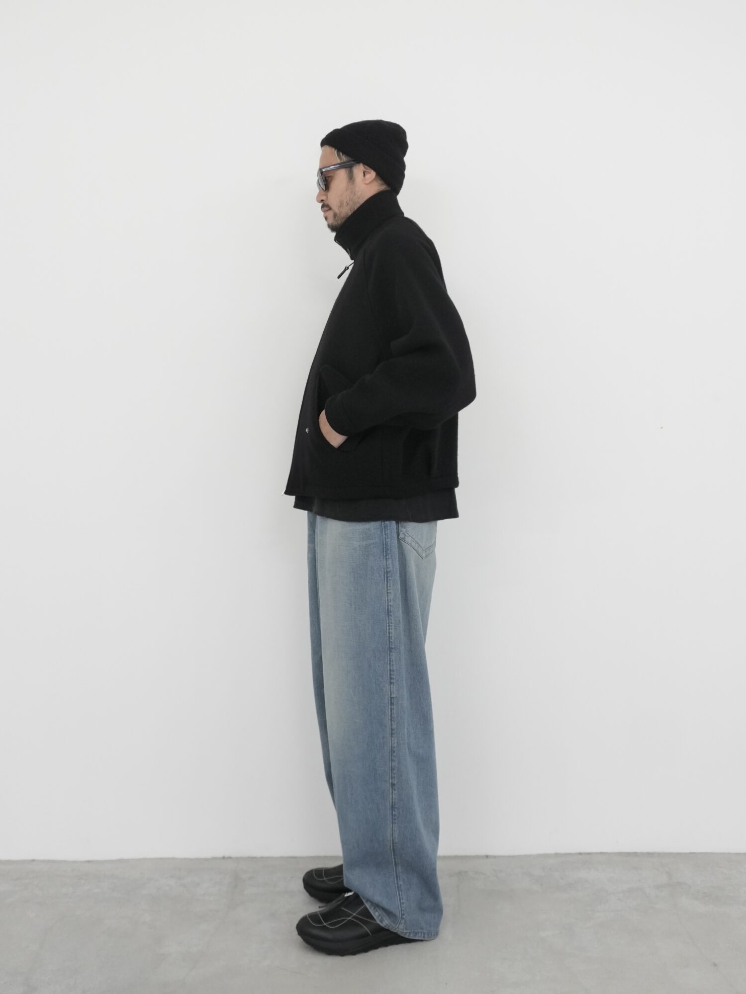 ヒップから裾にかけてやや丸みのあるデザインとなっており、ワタリが非常にワイドな寸法で、裾までカーブを描きながらヒップ周りの曲線がダイナミックで立体感のあるシルエットを生み出しています。