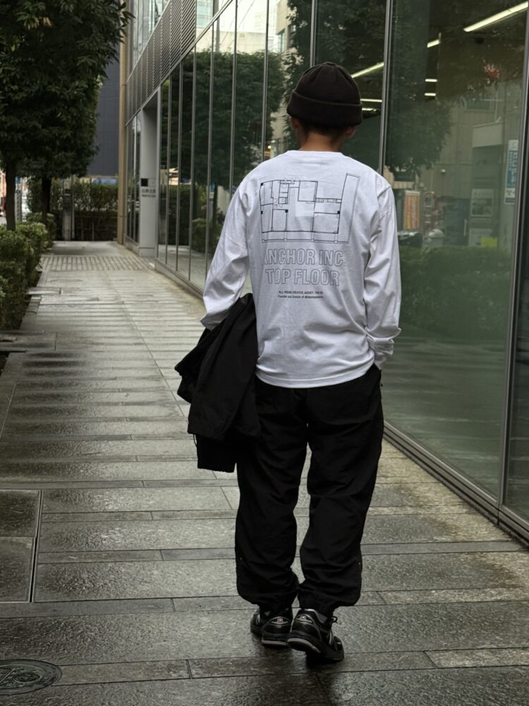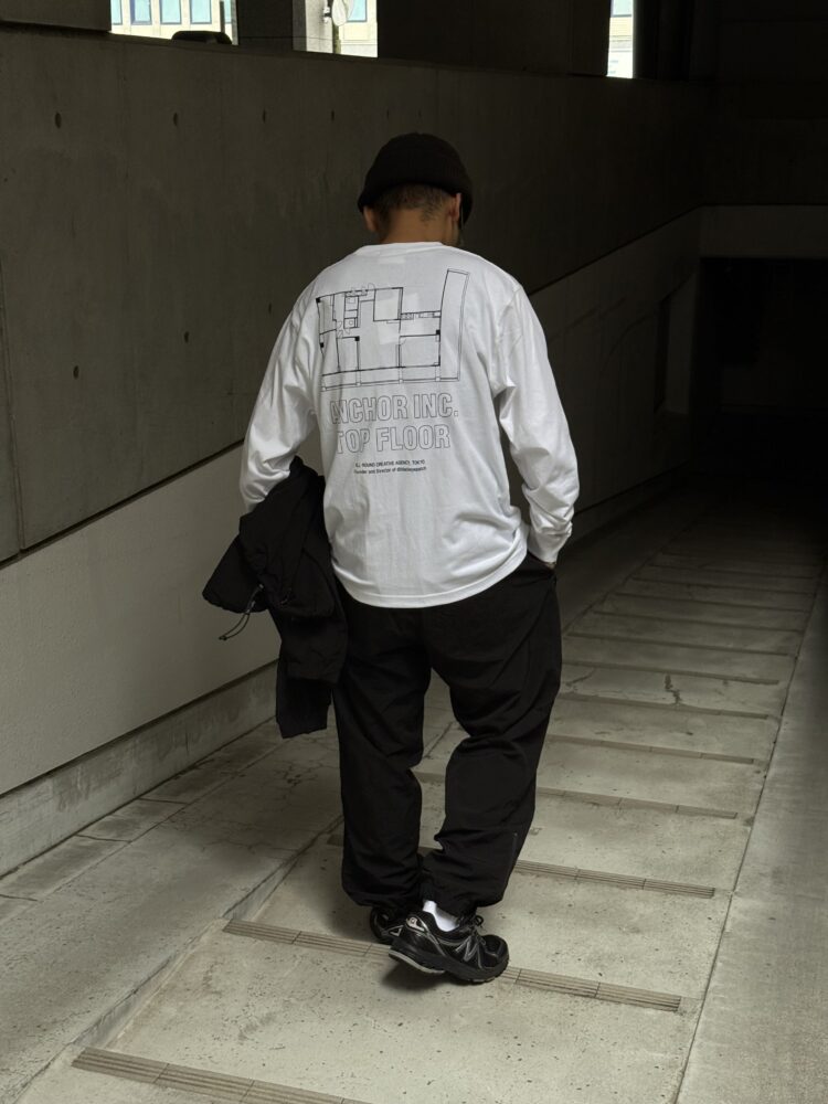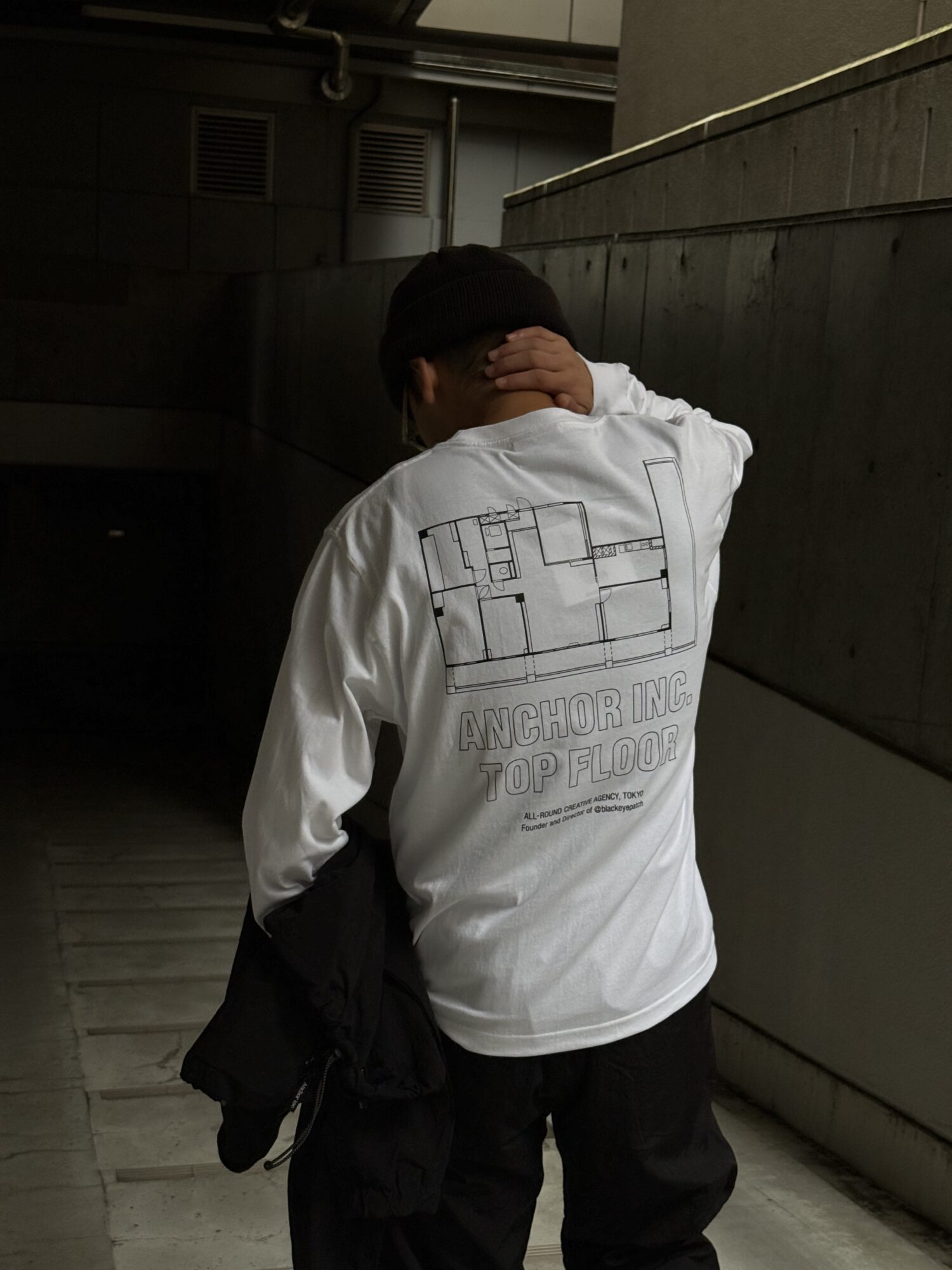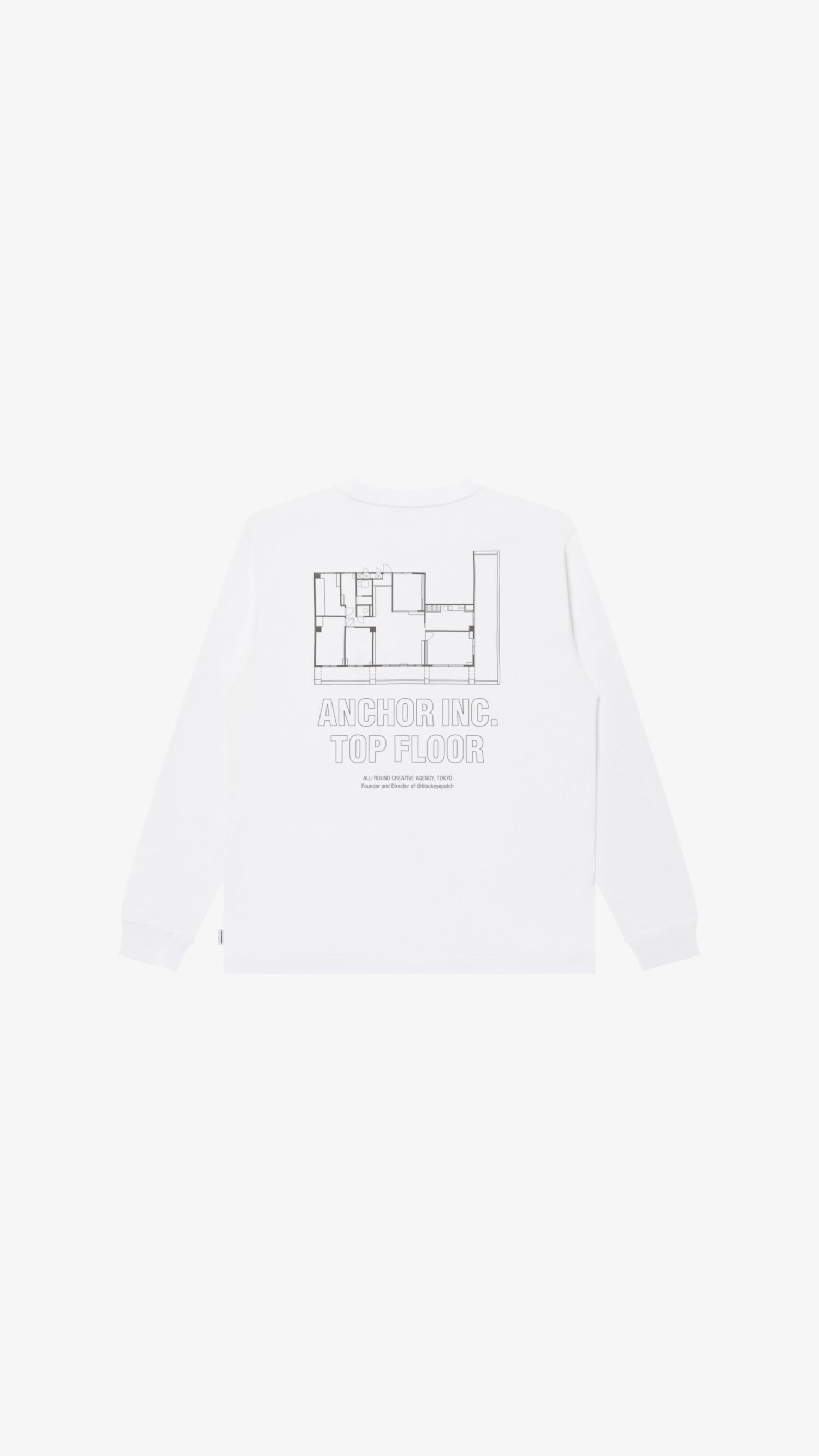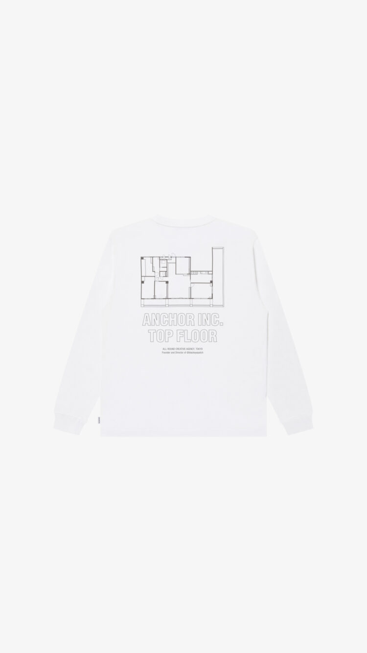 アンカーオフィスの図面をデザインをプリントで落とし込んだL/S T シャツ。 ボディは 8.5oz のオリジナルボディ。