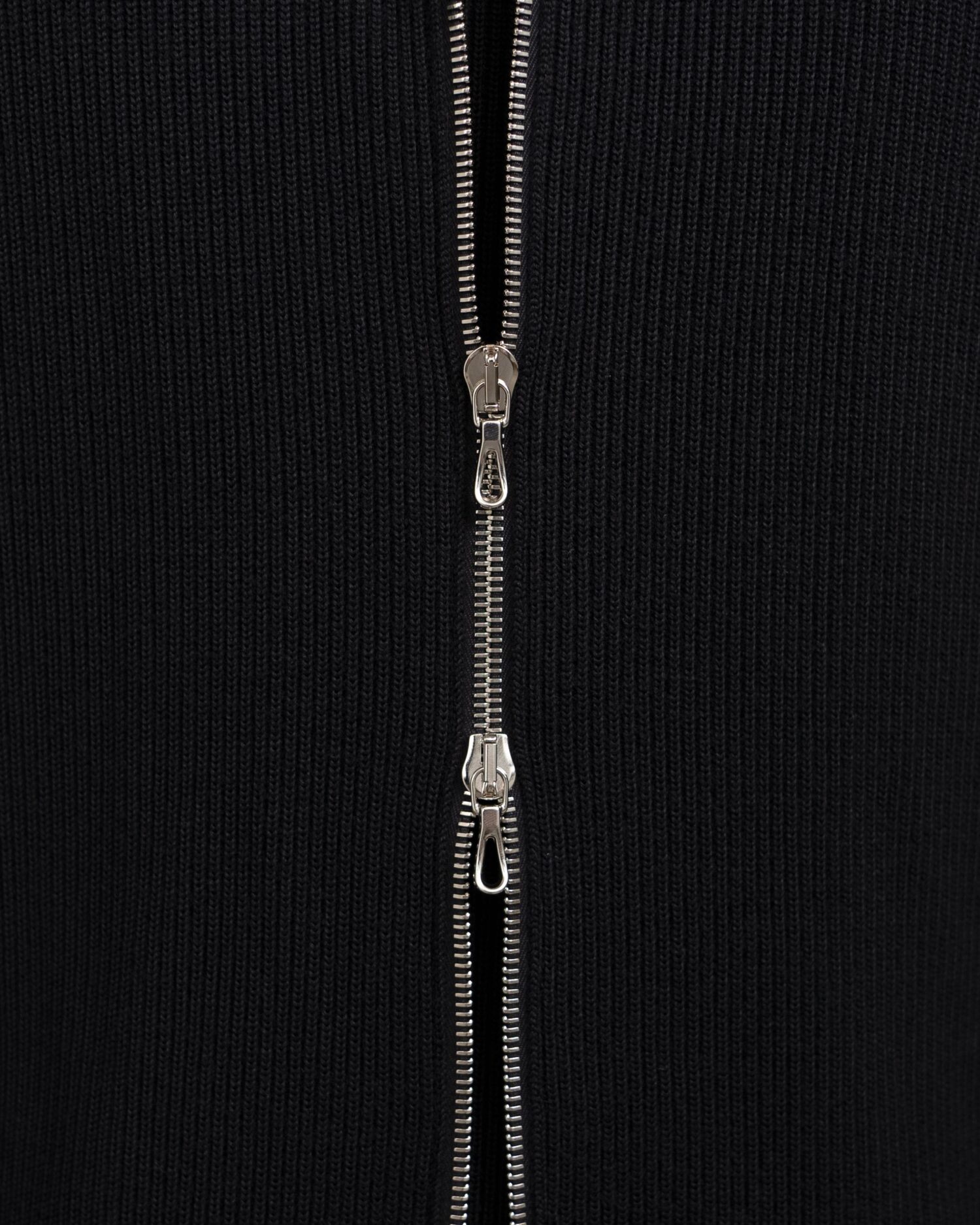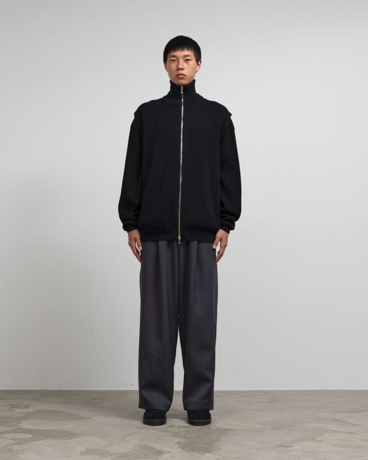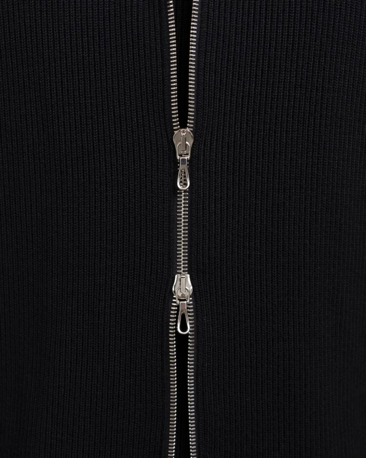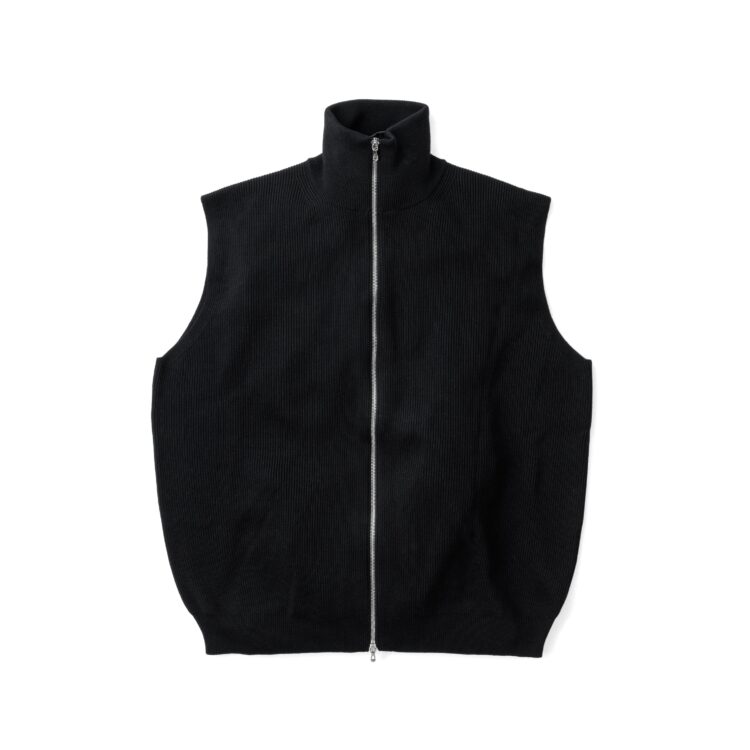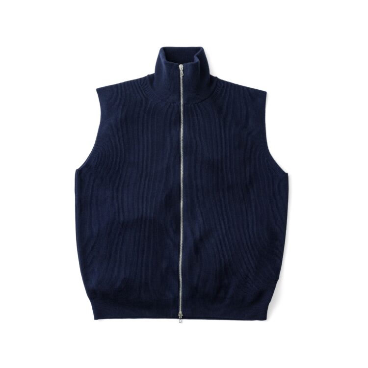 非常に細かく上質で艶やかなメリノウールを使用して、限界まで度詰めに編み立てたミドルゲージニット。ドライバーズニットをベースにしたニットベスト。レイヤリングに最適でフロントに配したダブルジップが着こなしの幅を広げてくれる。