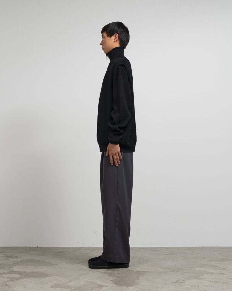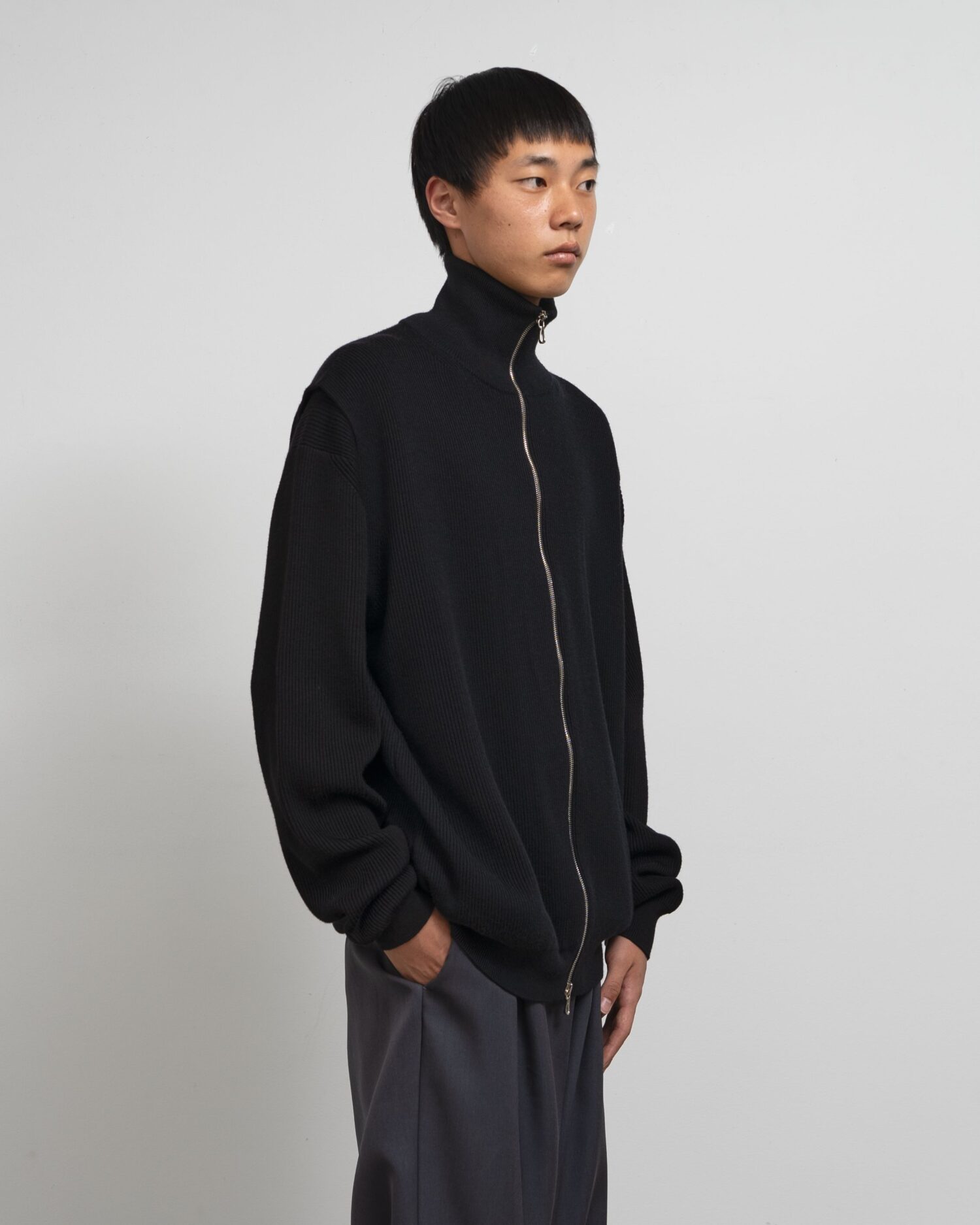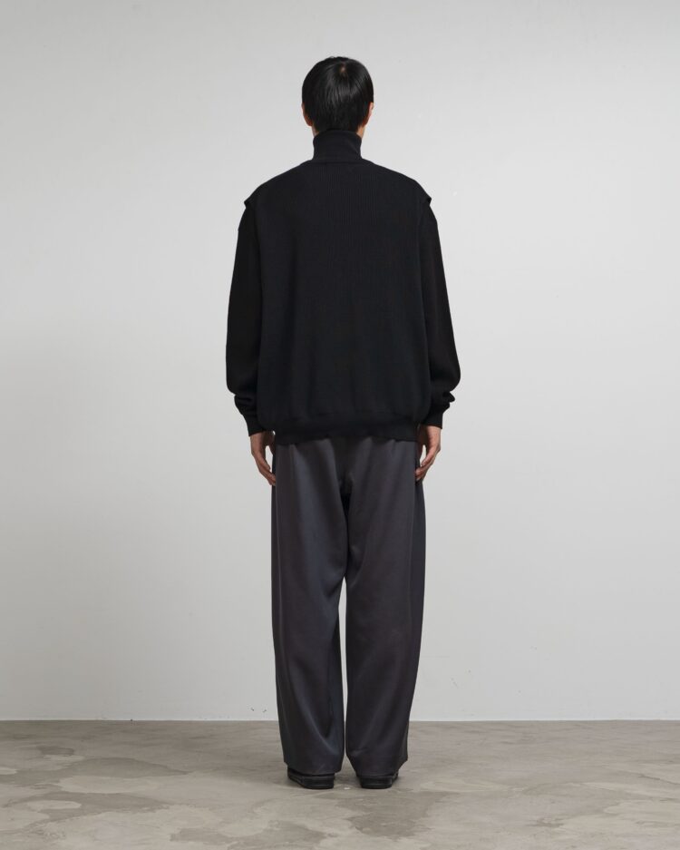 非常に細かく上質で艶やかなメリノウールを使用して、限界まで度詰めに編み立てたミドルゲージニット。ドライバーズニットをベースにしたニットベスト。レイヤリングに最適でフロントに配したダブルジップが着こなしの幅を広げてくれる。