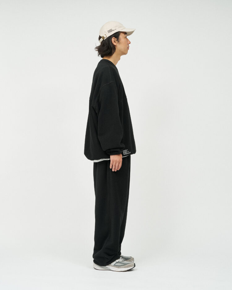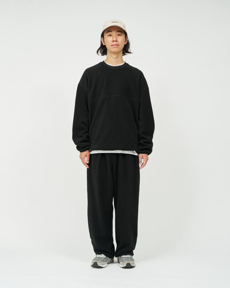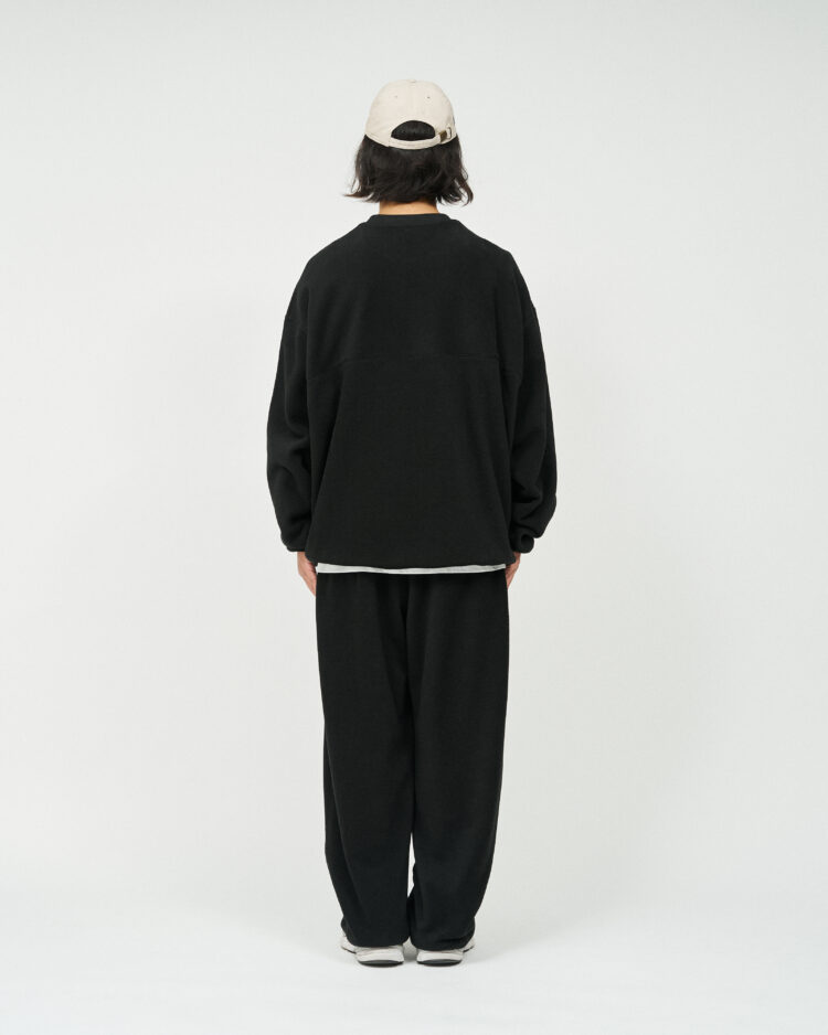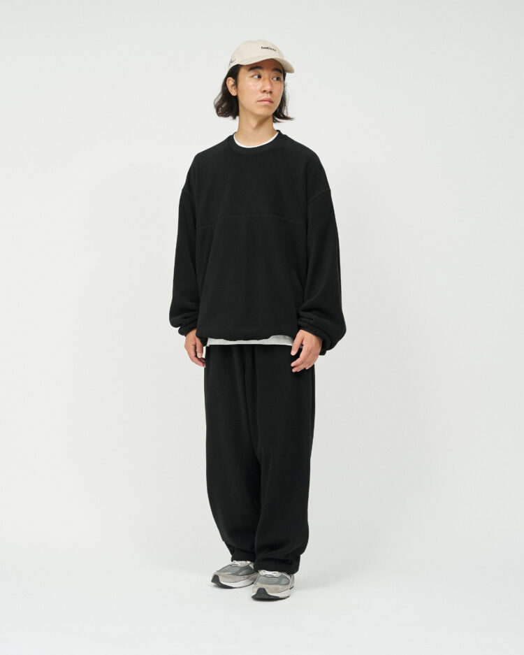 ソフトなマイクロフリース素材で作られたリラックスフィットのプルオーバー。柔らかくクッションのような感触で快適な着心地を提供。裾口と袖口にはストレッチパイピングが施され、丸みを帯びたシルエットで心地よいフィット感を実現。