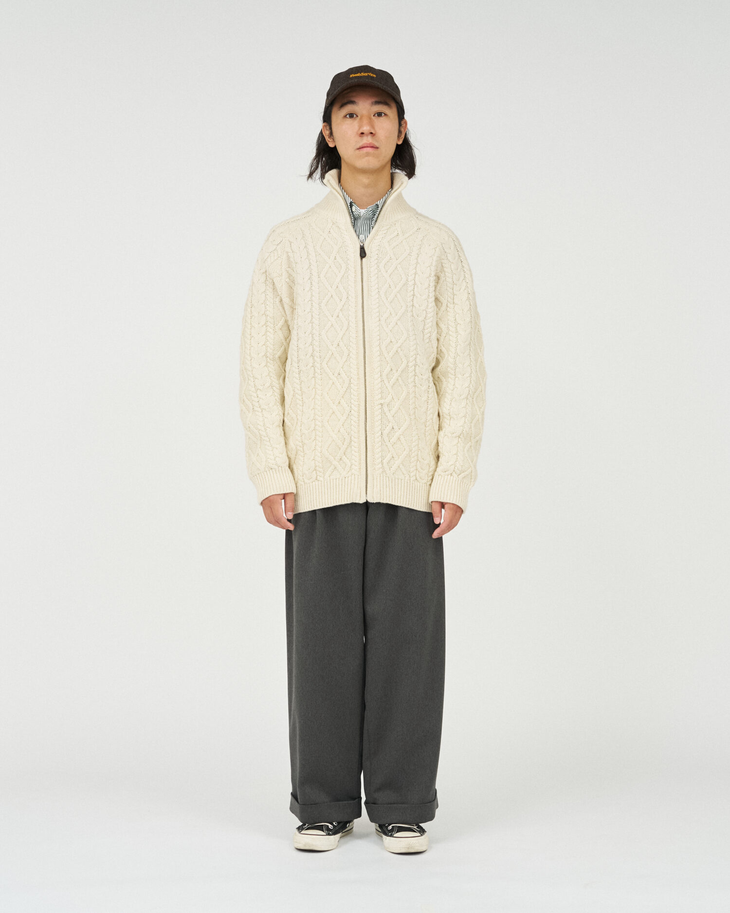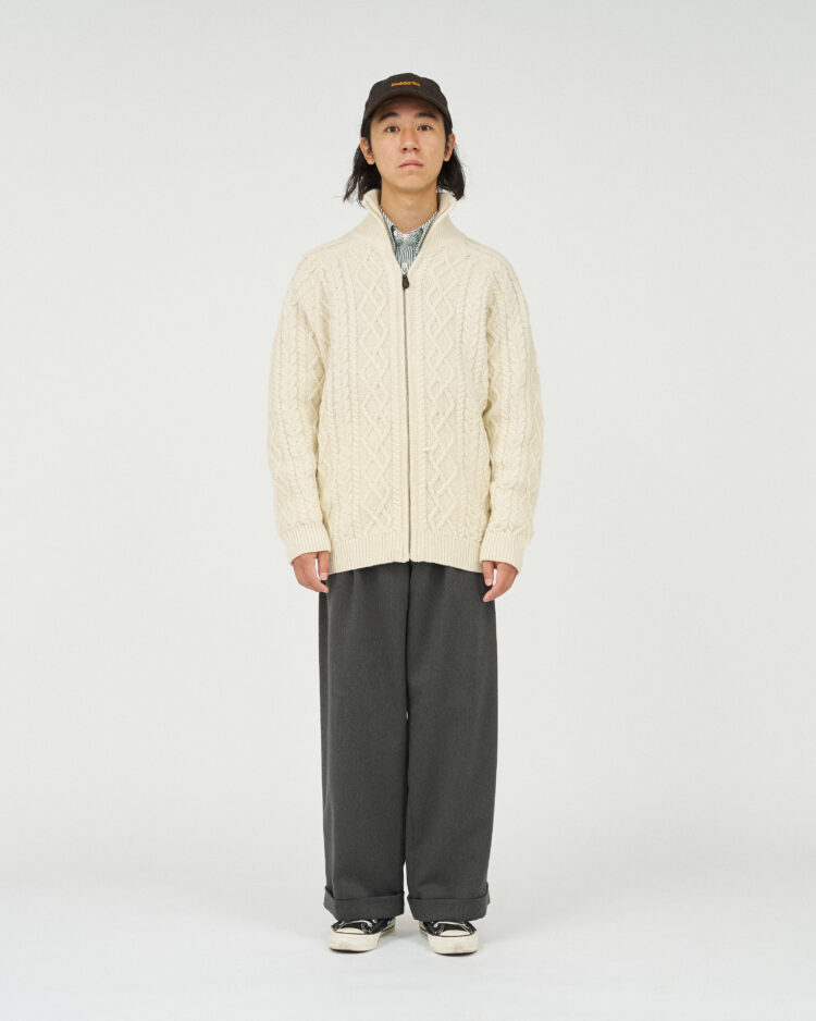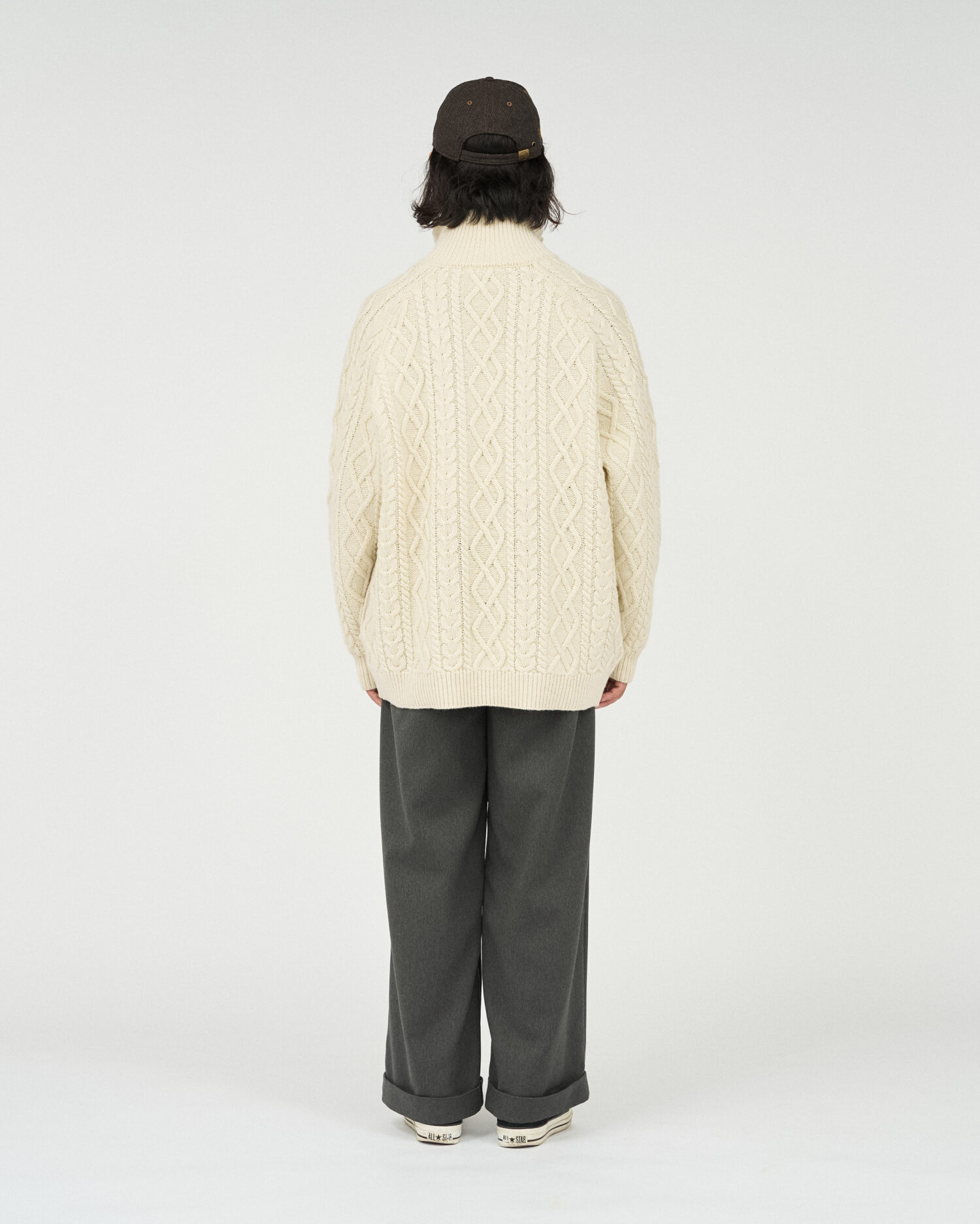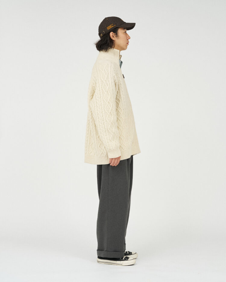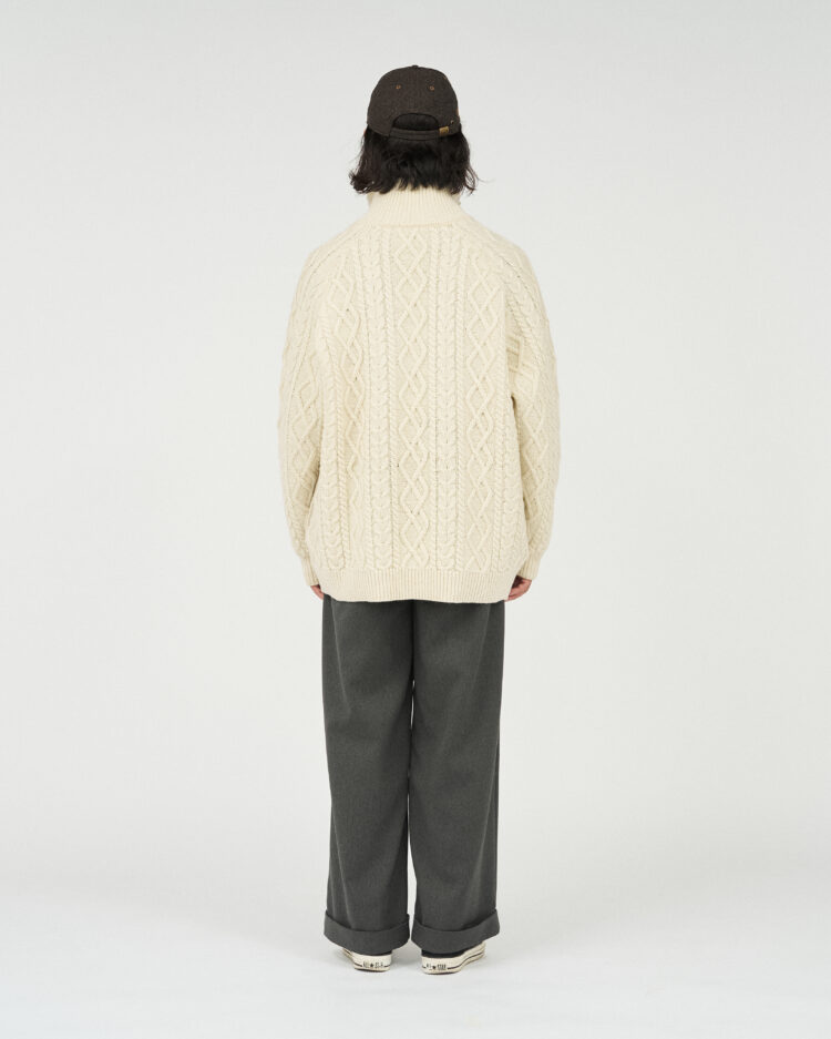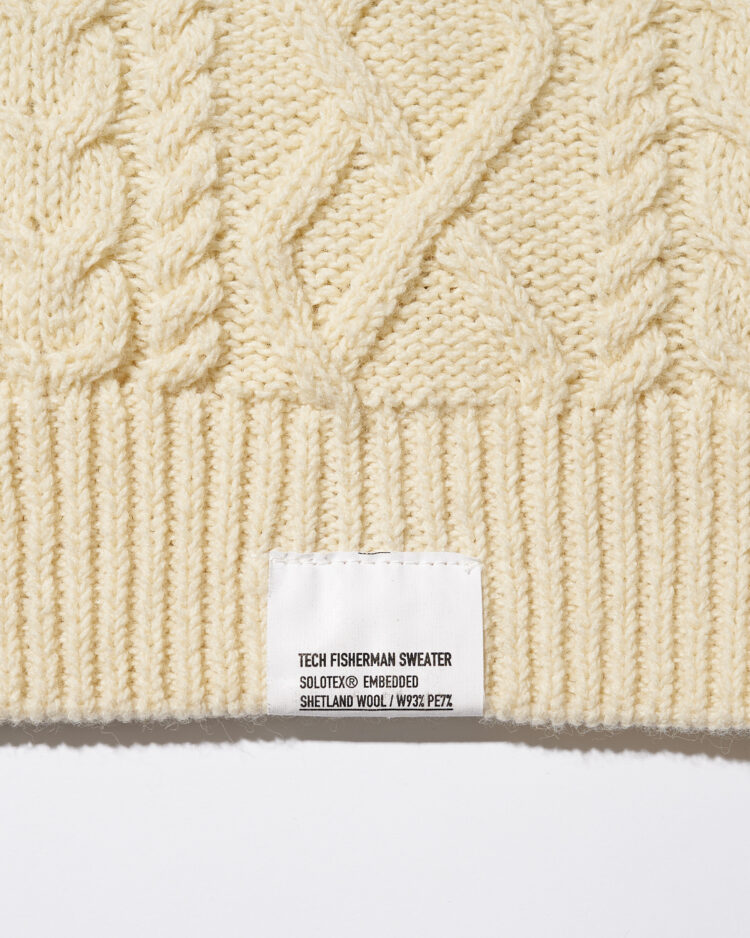 伝統的なアラン編のフィッシャーマンセーターを現代的にアップデート。伸縮性や形態安定性に優れたSOLOTEX糸にシェットランドウールをカバーリングしたハイブリットな一着。