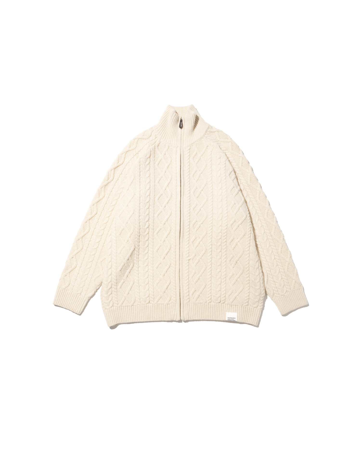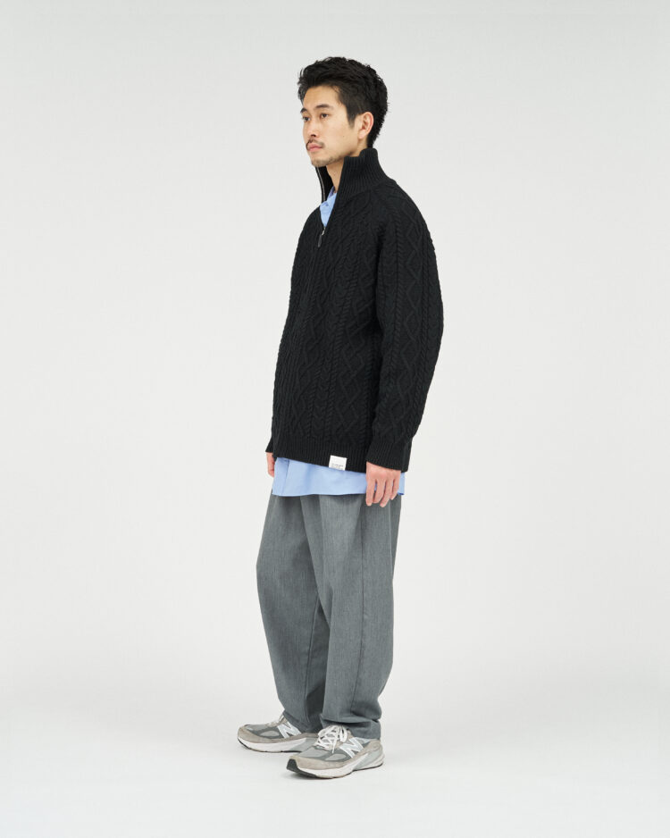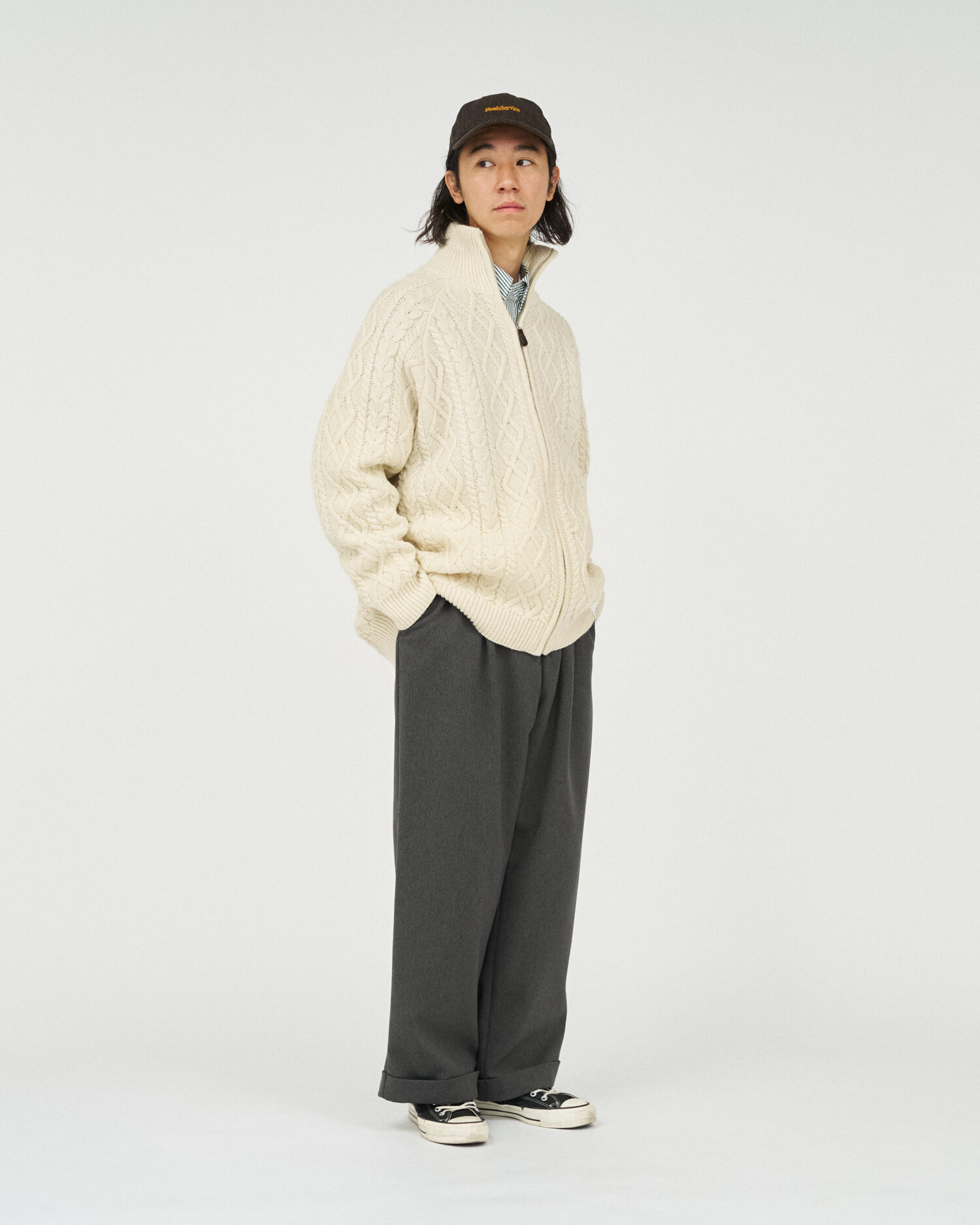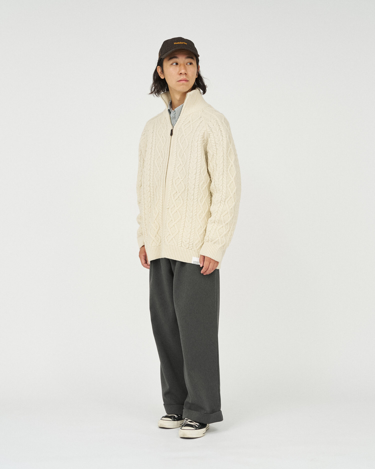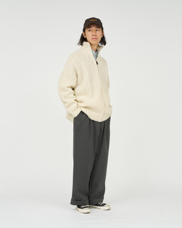 伝統的なアラン編のフィッシャーマンセーターを現代的にアップデート。伸縮性や形態安定性に優れたSOLOTEX糸にシェットランドウールをカバーリングしたハイブリットな一着。