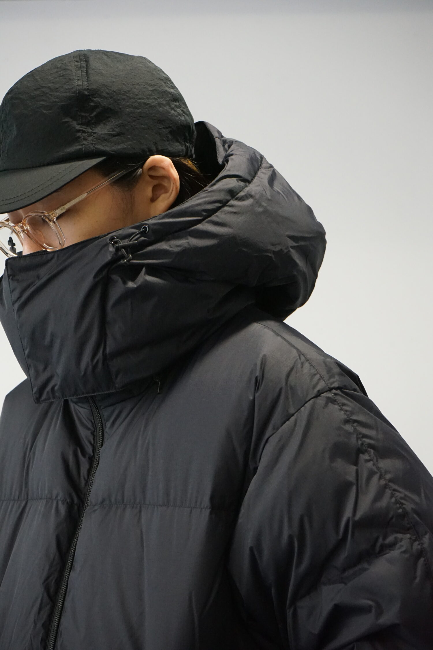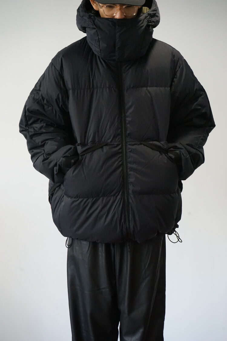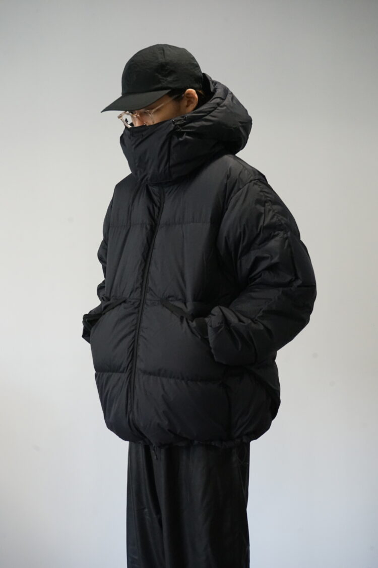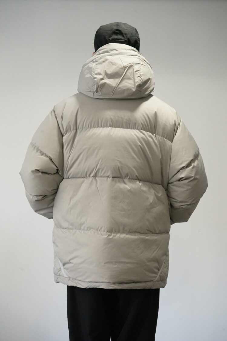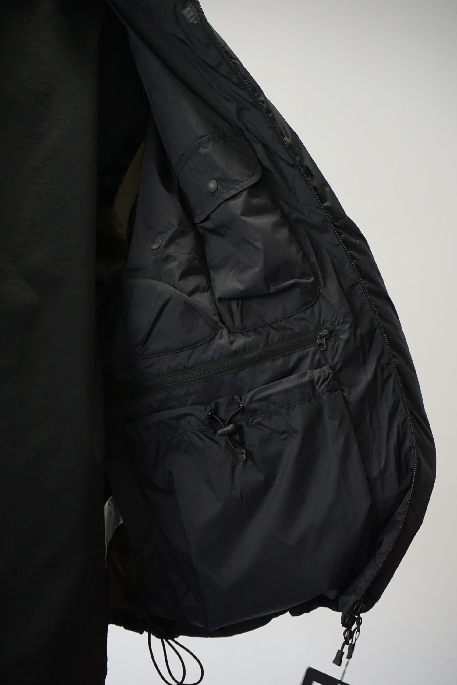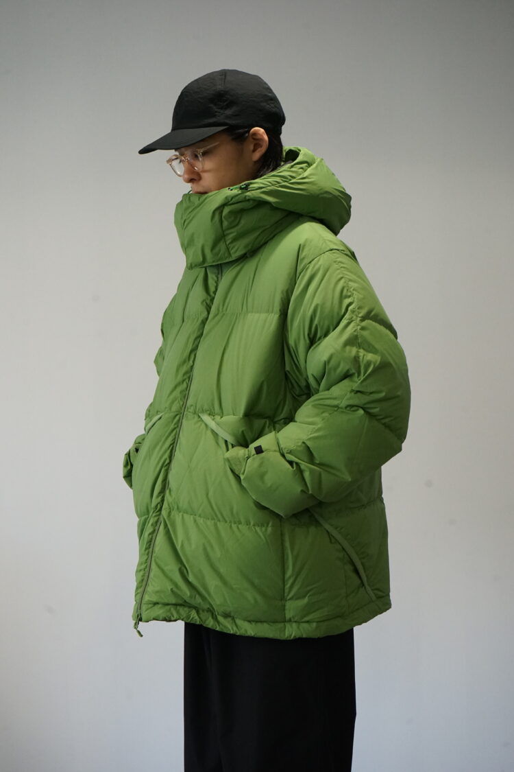 寝袋のような膨らみが特徴のダウンジャケット。シンプルに横ステッチで表現されたベーシックなデザインだが、ハンティングジャケットからインスピレーションを受けデザインしたフロントからサイドにかけて大きくデザインしたフラップポケットが最大の特徴。中には仕切られた2つのポケットが配されている。内側に大小様々なポケットワークを施し、タックルケース、ルアーケース、モバイルなどを収納出来るようデザイン。見た目以上に収納力の高いダウンドジャケット。ミリタリーのディテールでもある前振りの袖がデザインアクセント、アクションプリーツを加え、袖口も調整出来るようにデザイン。釣りの際の可動域を広げ、袖口のもたつきも解消したデザイン。取り外し可能なフードも付属。