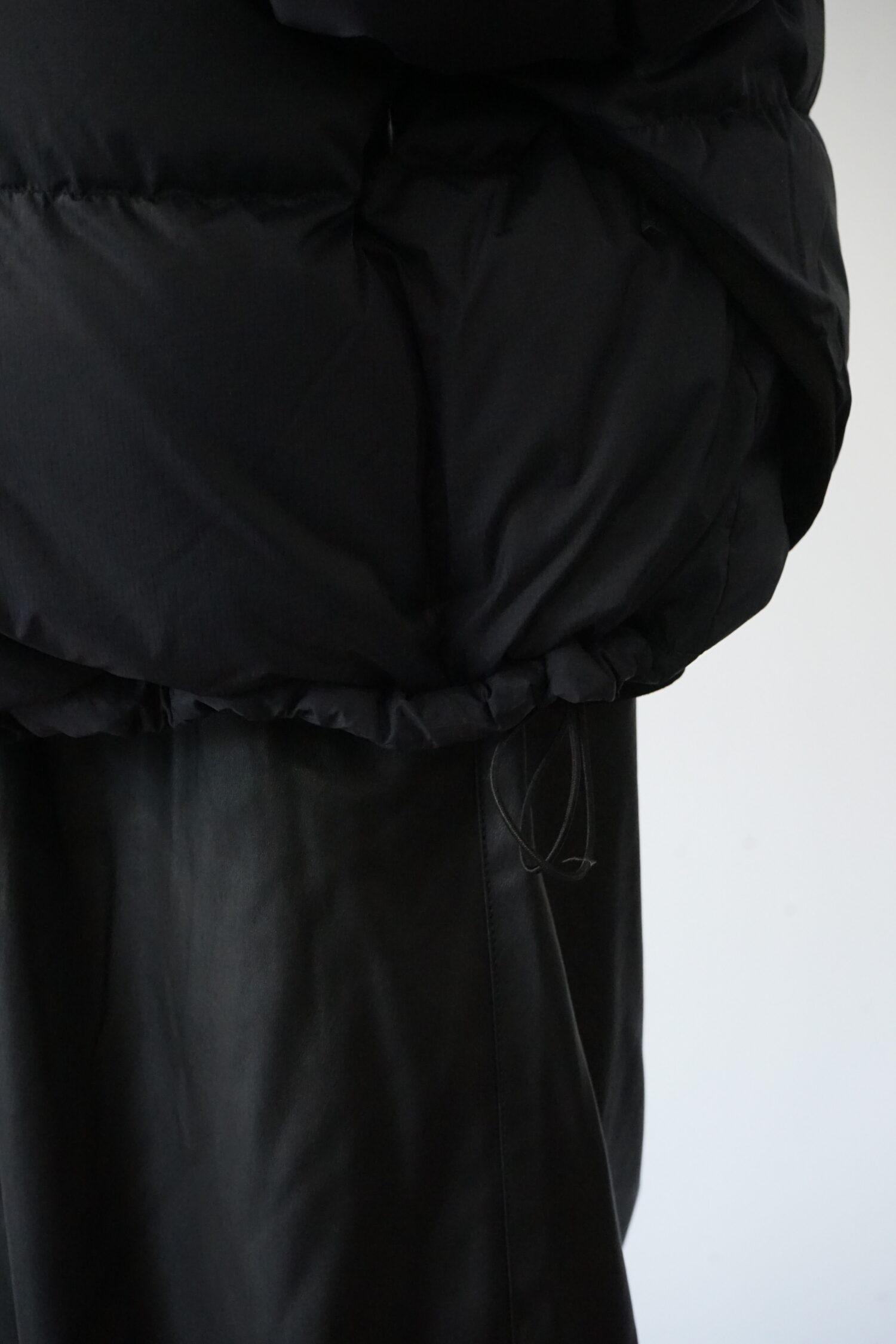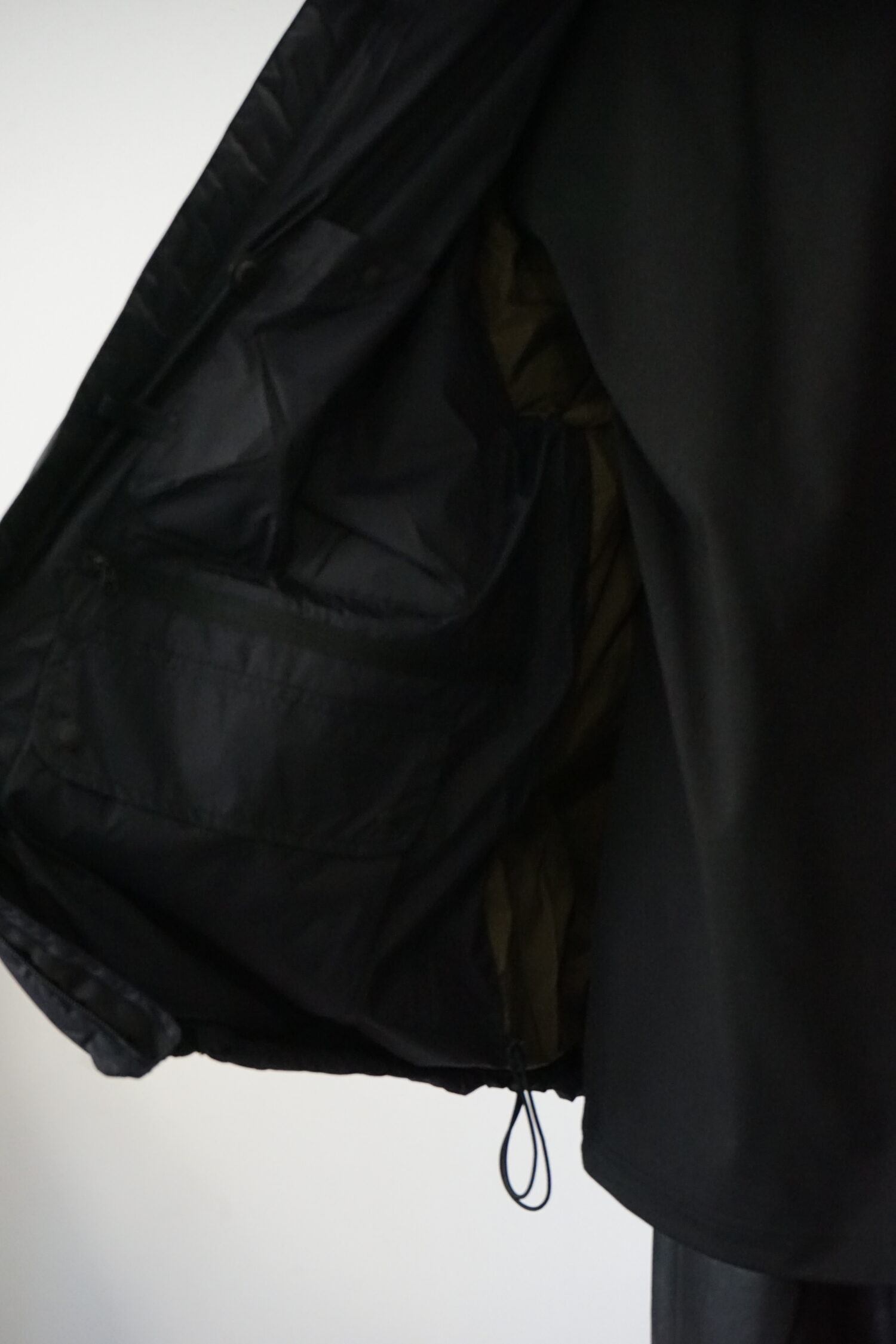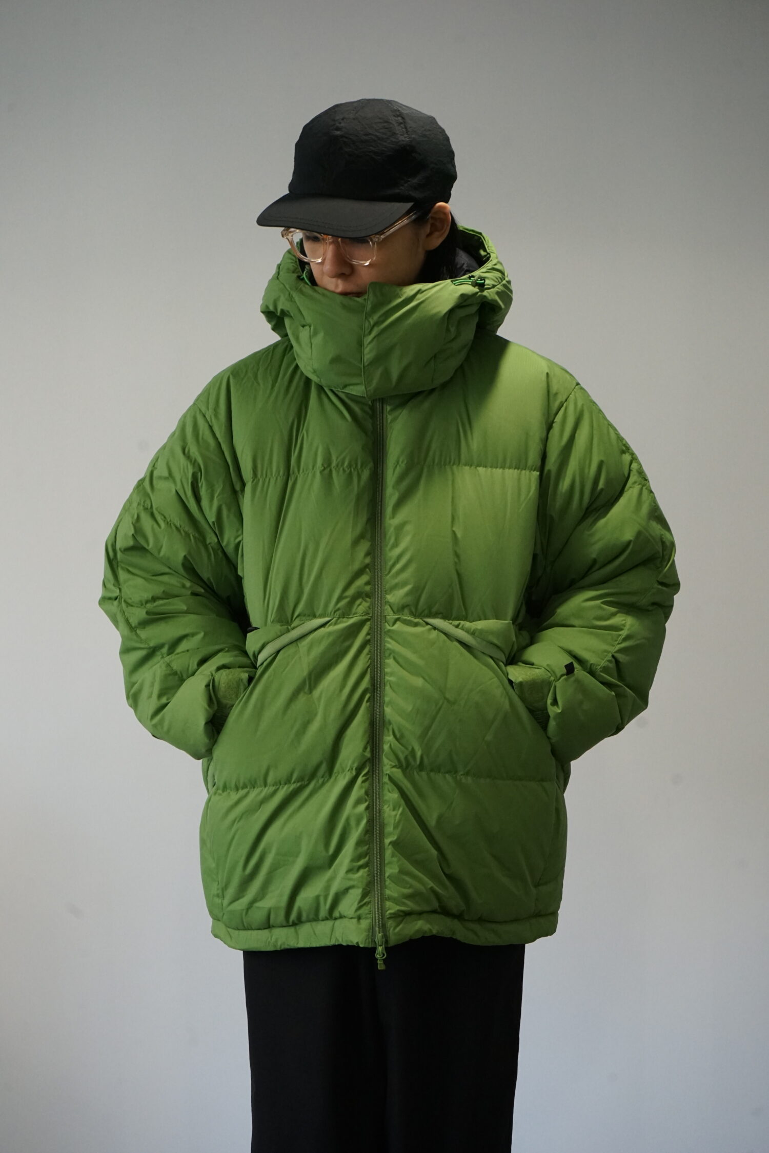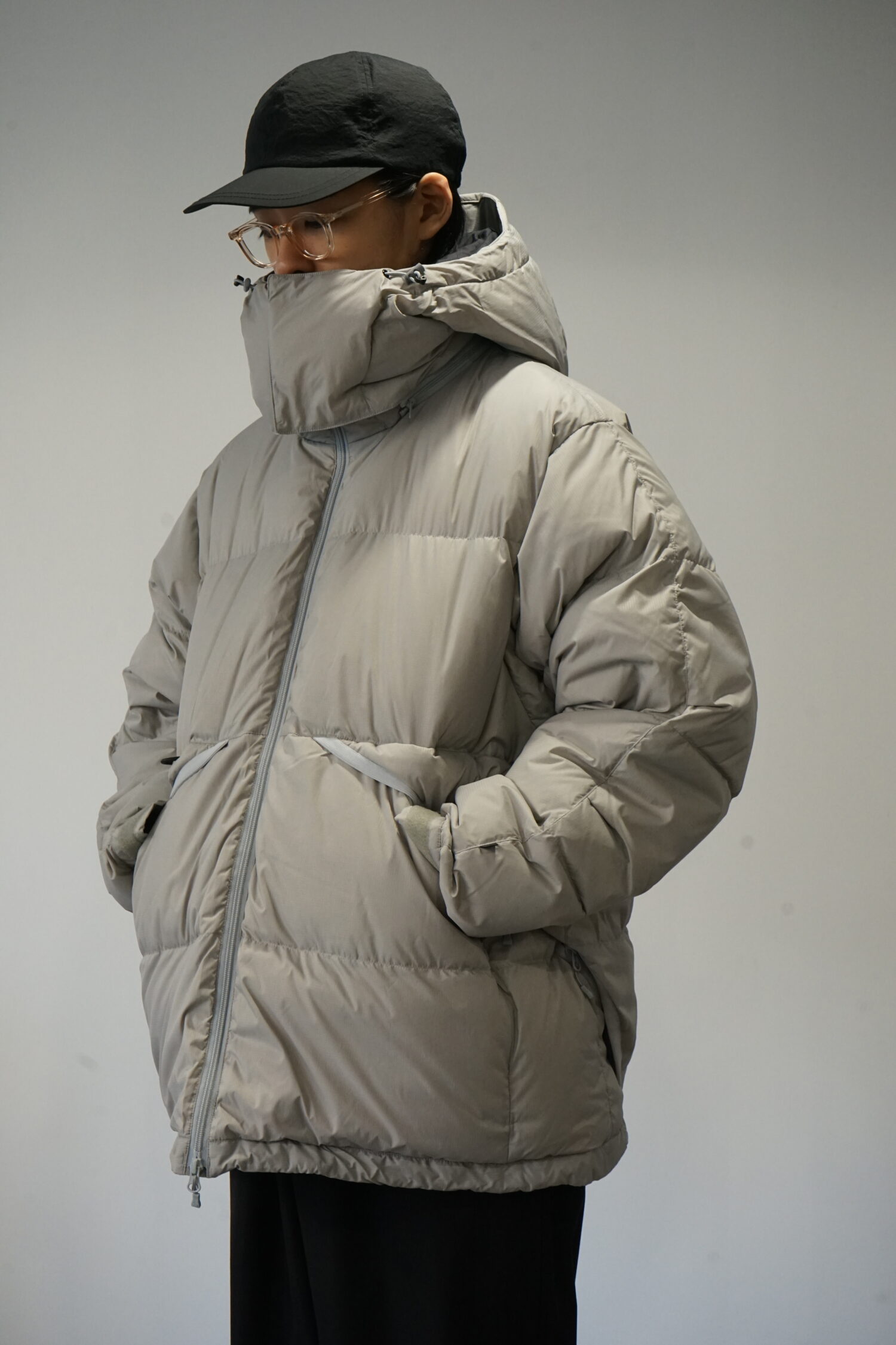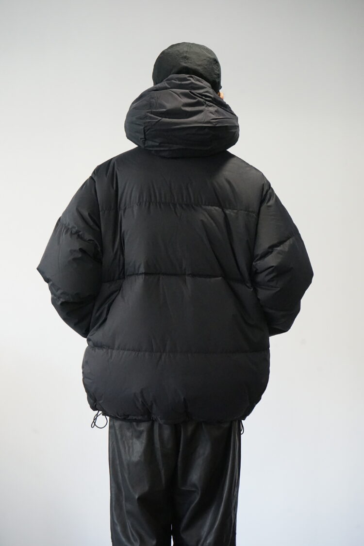 寝袋のような膨らみが特徴のダウンジャケット。シンプルに横ステッチで表現されたベーシックなデザインだが、ハンティングジャケットからインスピレーションを受けデザインしたフロントからサイドにかけて大きくデザインしたフラップポケットが最大の特徴。中には仕切られた2つのポケットが配されている。内側に大小様々なポケットワークを施し、タックルケース、ルアーケース、モバイルなどを収納出来るようデザイン。見た目以上に収納力の高いダウンドジャケット。ミリタリーのディテールでもある前振りの袖がデザインアクセント、アクションプリーツを加え、袖口も調整出来るようにデザイン。釣りの際の可動域を広げ、袖口のもたつきも解消したデザイン。取り外し可能なフードも付属。