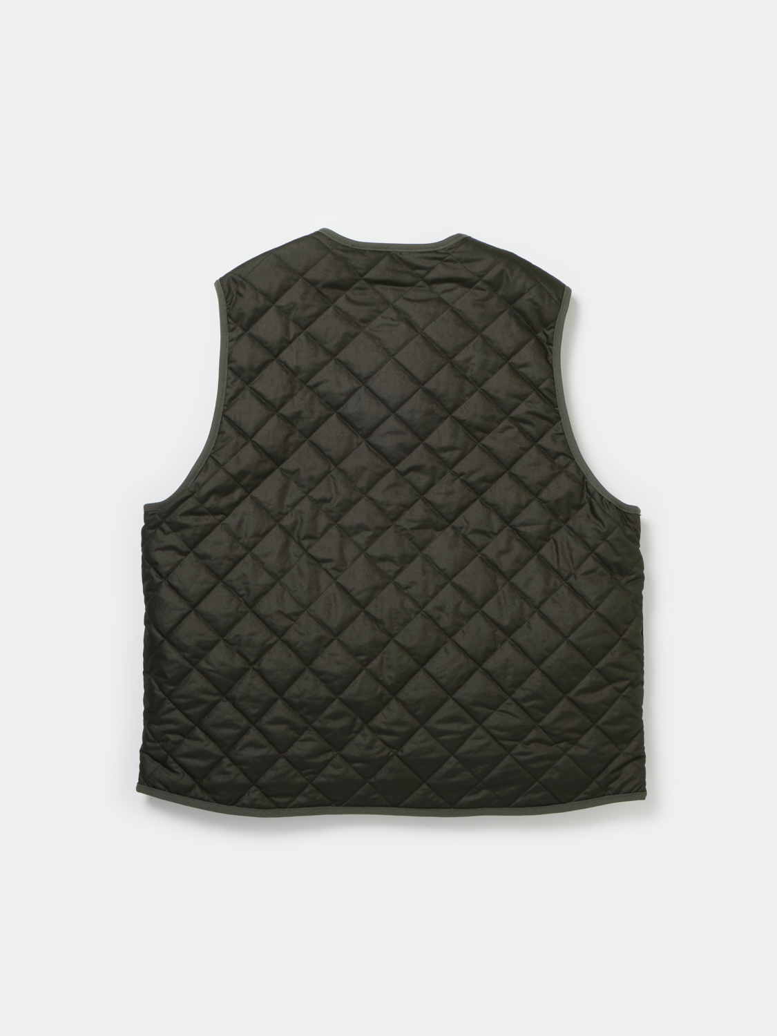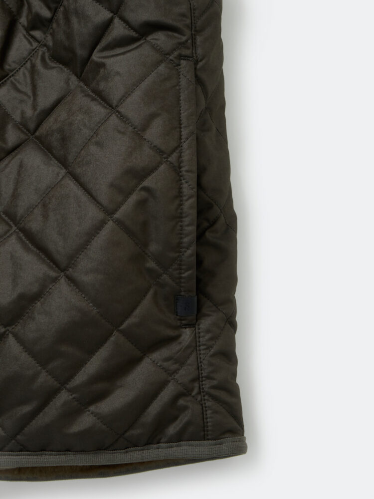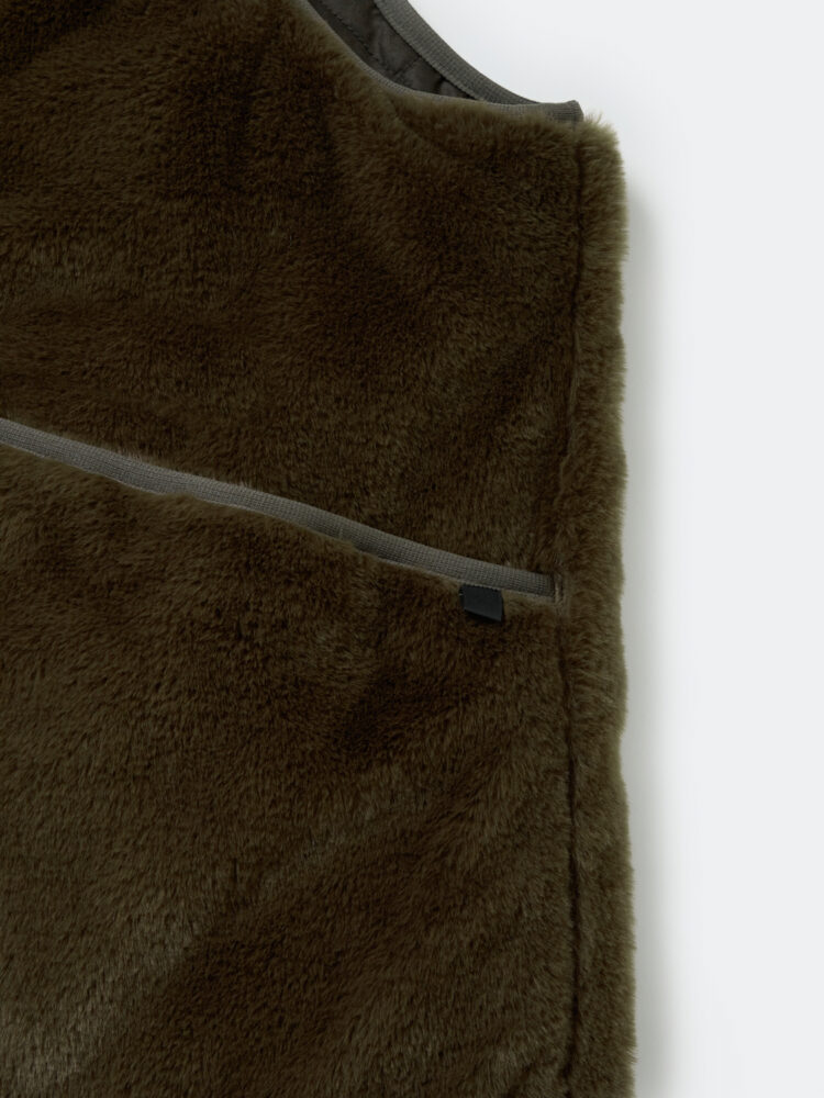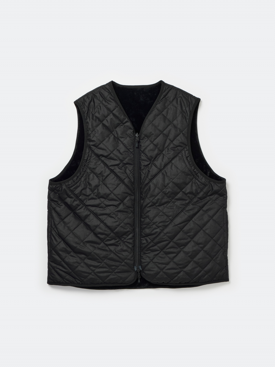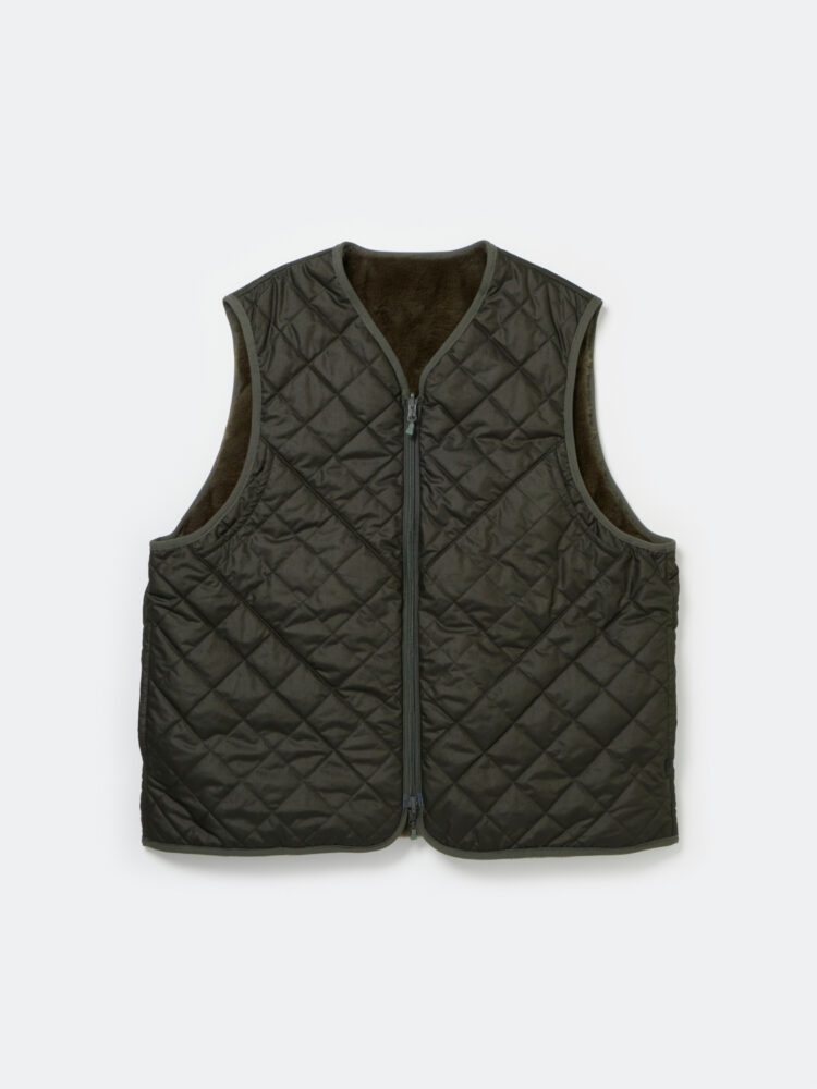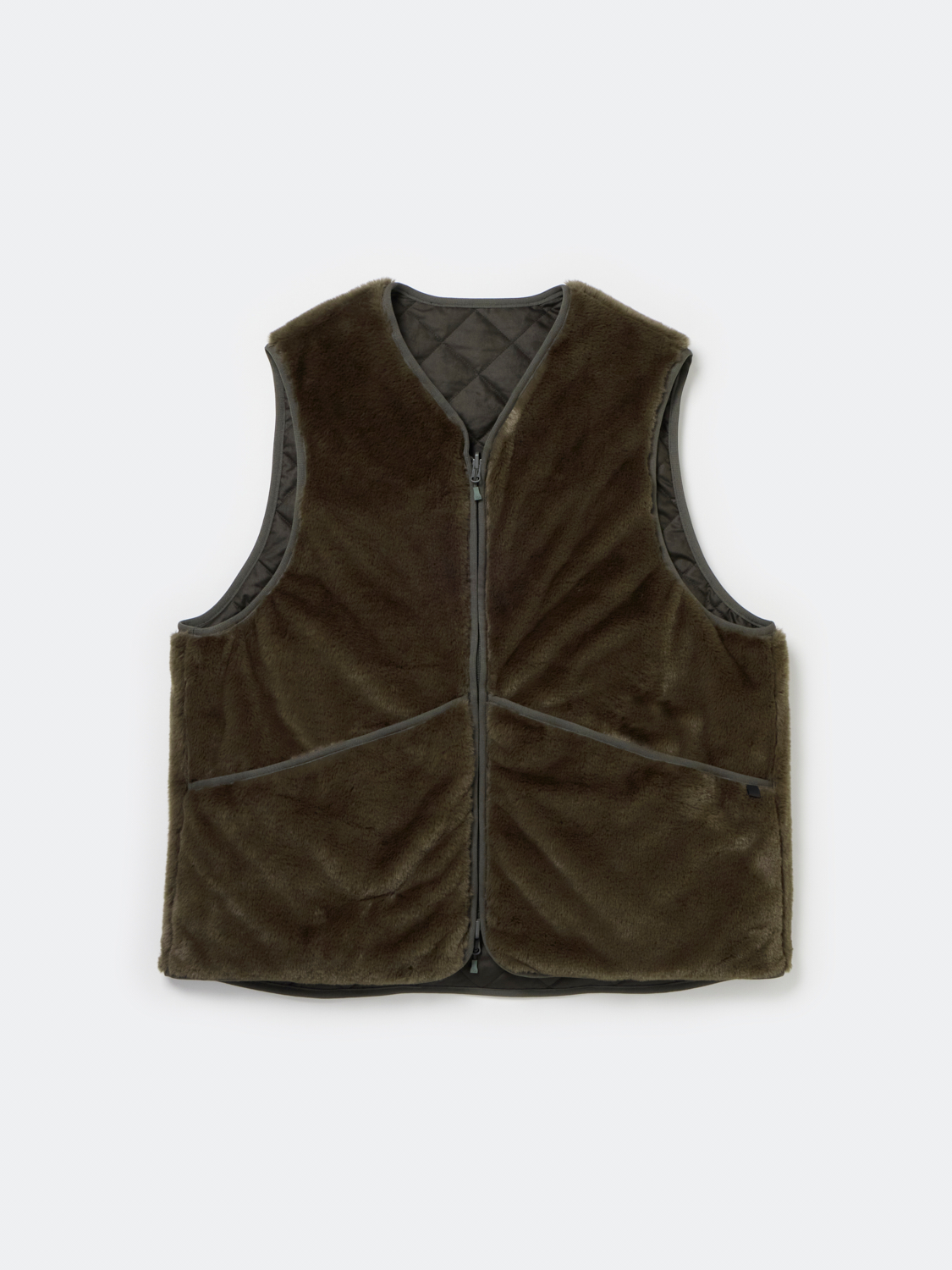 ヨーロッパのハンティングライナーよりインスピレーションを受け作成したリバーシブルベスト。片側は、毛足の長いフェイクファーを使用。もう片側は菱形キルティングを採用したブリティッシュ感溢れるアイテム。キルティングサイドのポケットは、菱形のキルトのデザインを上手く利用したハンドウォーマーポケットとなり、シンプルなデザインを害さない仕様。