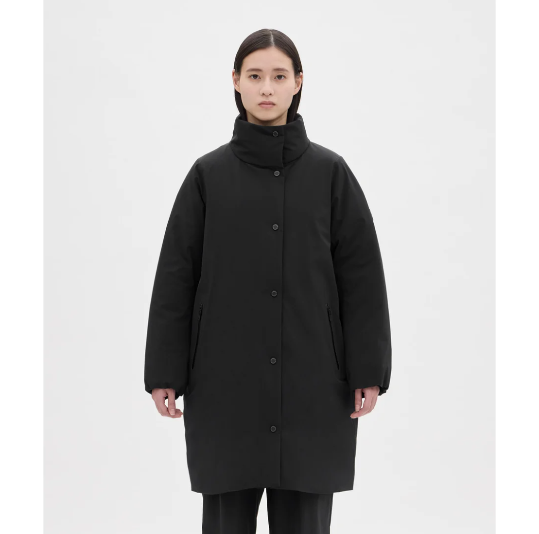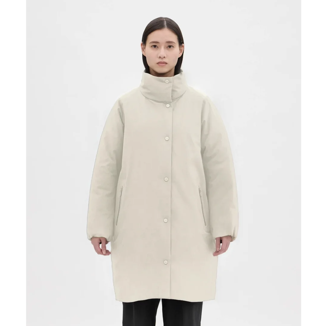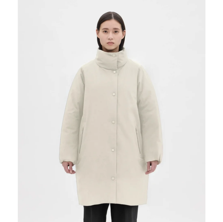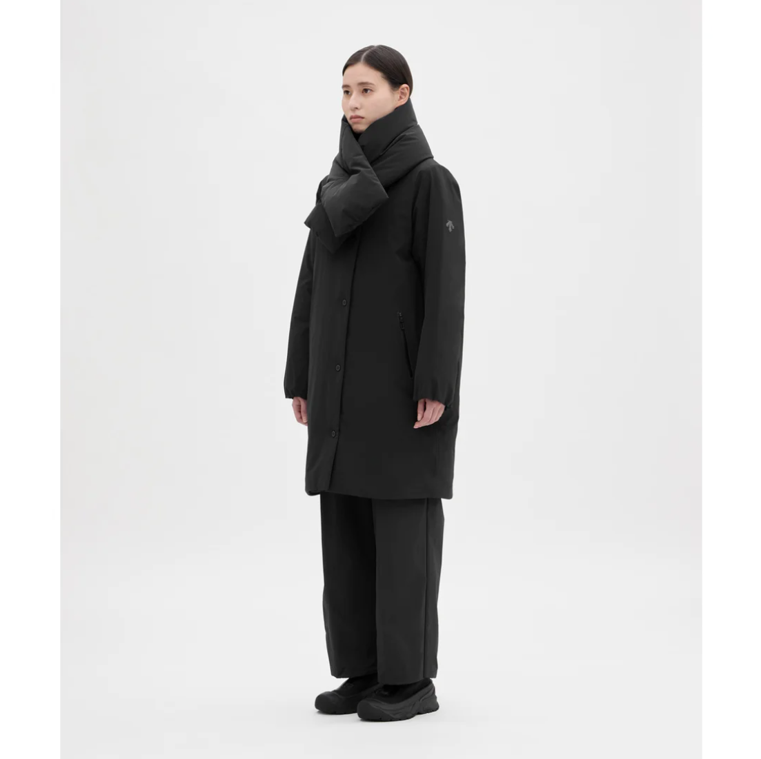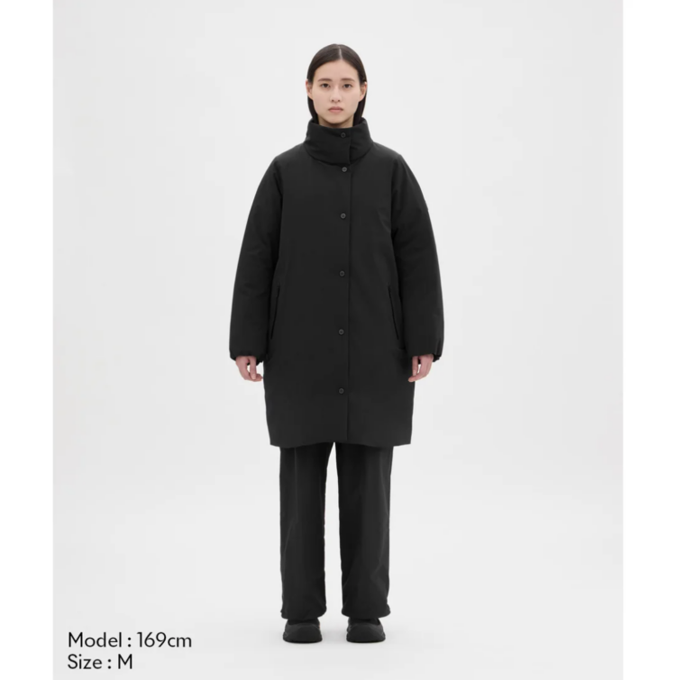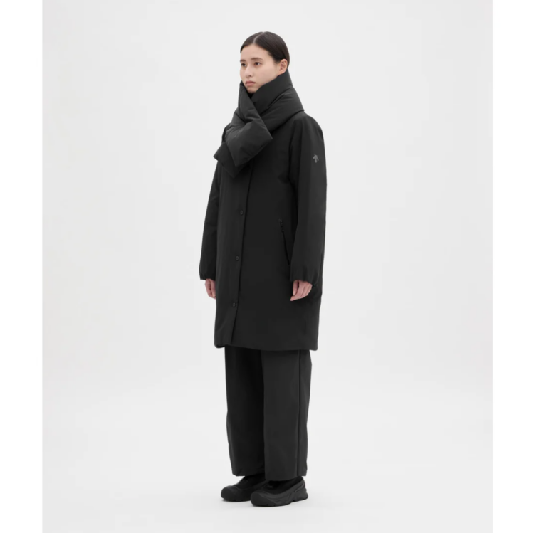 高いウォータープルーフ性能はそのままに、熱接着ノンキルト加工やその他ディテールを全て製品の内側に潜め、より都会的でミニマルなデザインを実現したシリーズ。さりげない丸みのあるコクーンシルエットが女性らしいモダンなバランスを実現。ミドルレングスでスカートにもパンツにも合わせやすい汎用性の高い丈感が特徴的。充填するダウンの密度を従来モデルの約70%に抑え、日常生活での快適性を追求した軽量モデル。表地には防水透湿性に優れるDERMIZAX® FLEXILE MATTE 4WAY STRETCHを、中生地には光を熱へと変換し積極的な保温性能を発揮するHEAT NAVI®/ヒートナビを採用。同素材のダウンマフラーを備え、ビジネスからカジュアルまで幅広いシーンで着用可能。さらに「DOWNPASS」認証を取得したトレーサブルダウンを使用しシリアルナンバーによる厳正な管理を行うことで全ての羽毛の調達過程を追跡することが可能。
