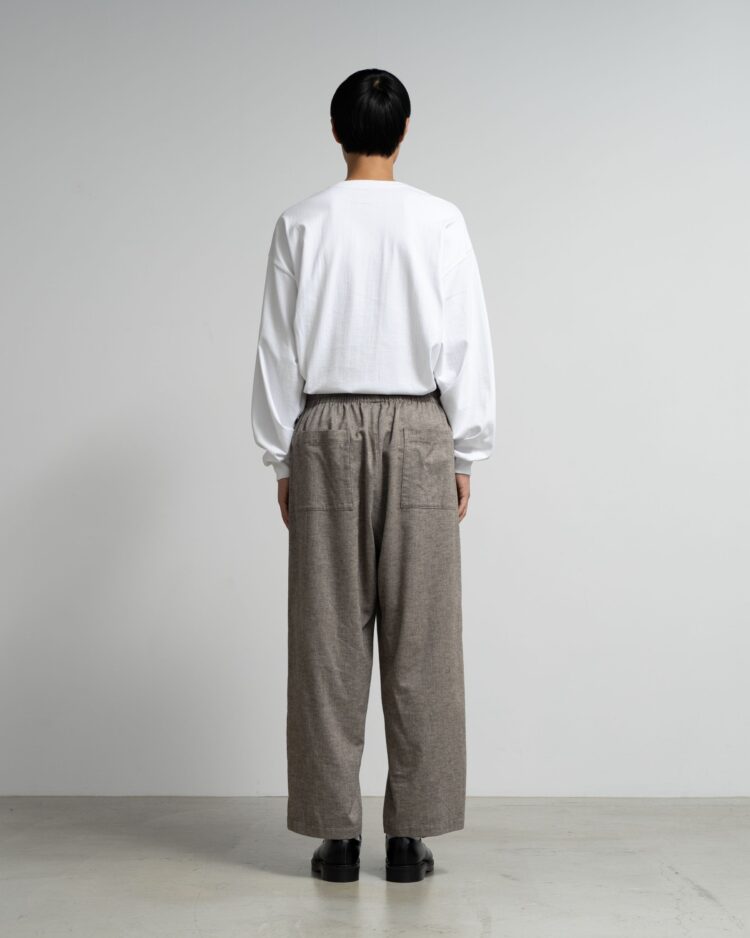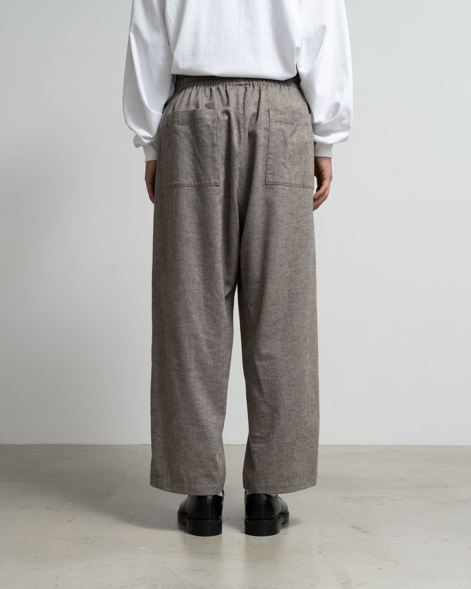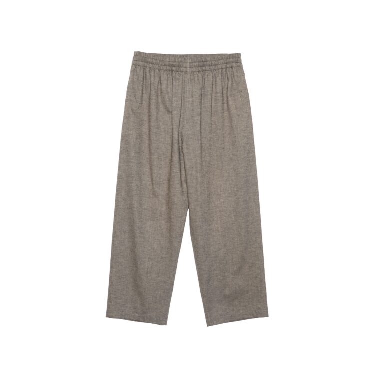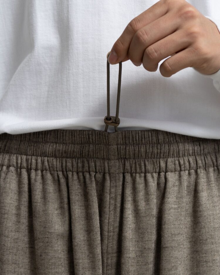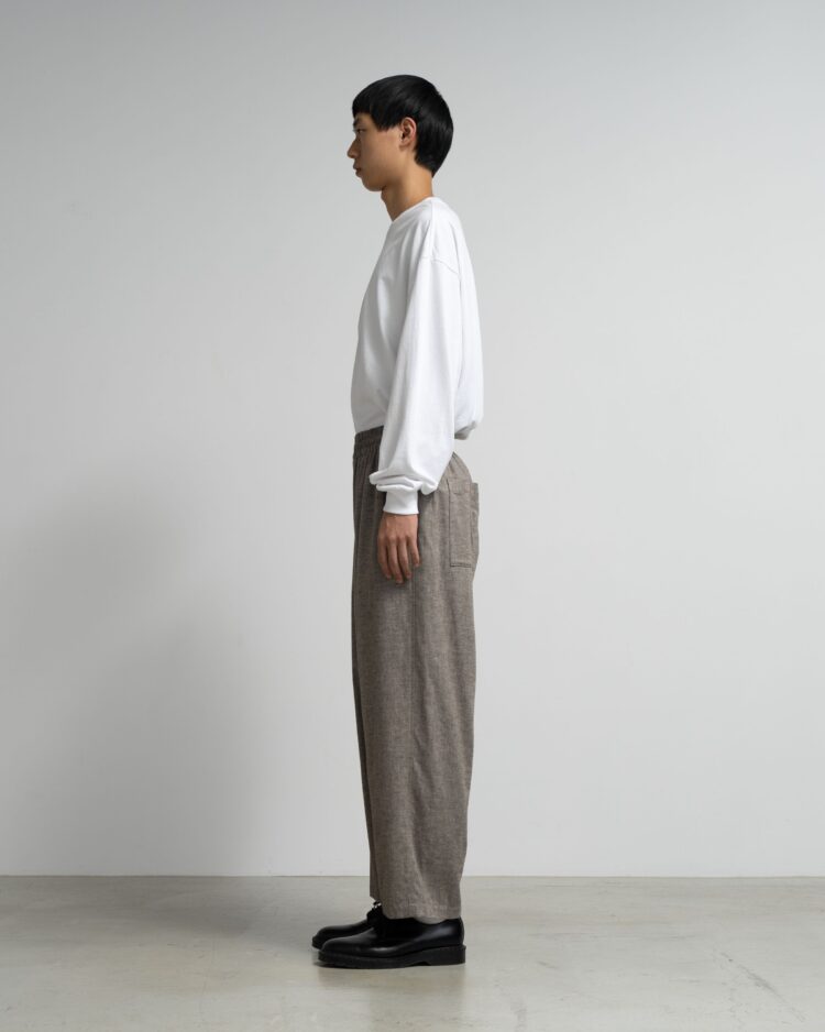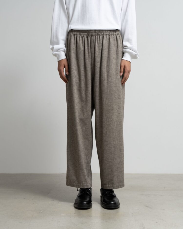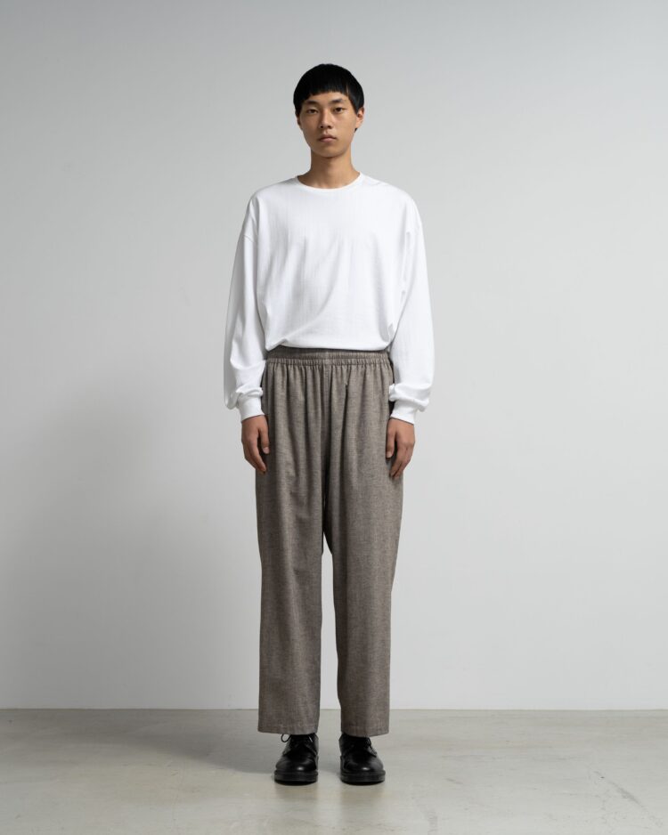スペイン・バルセロナに拠点を持つSIDOGRAS(シドグラス)社の上質で繊細なコットンを用いたフランネルを使用。品のある柔らかい肌触りと温かみのある起毛感が魅力。ウエストゴムでシンプルなパターン構成のスリーピングパンツ。ゆとりのある腰回りで、裾にかけテーパードさせたリラックス感のあるシルエット。