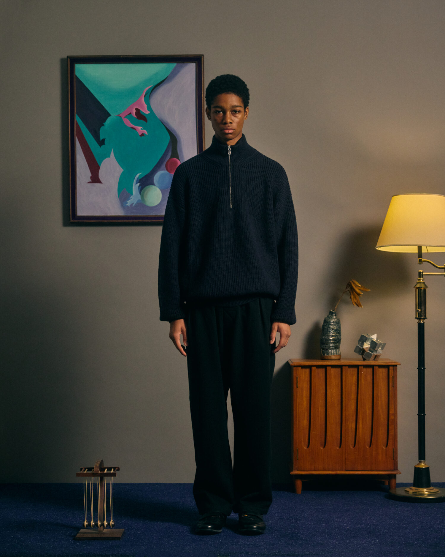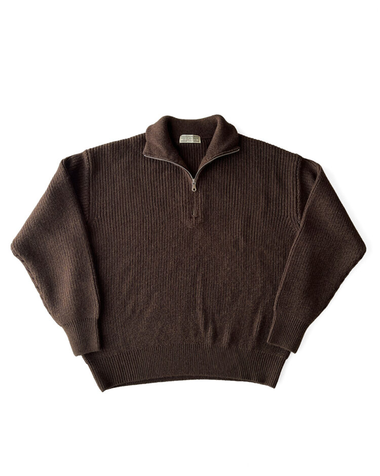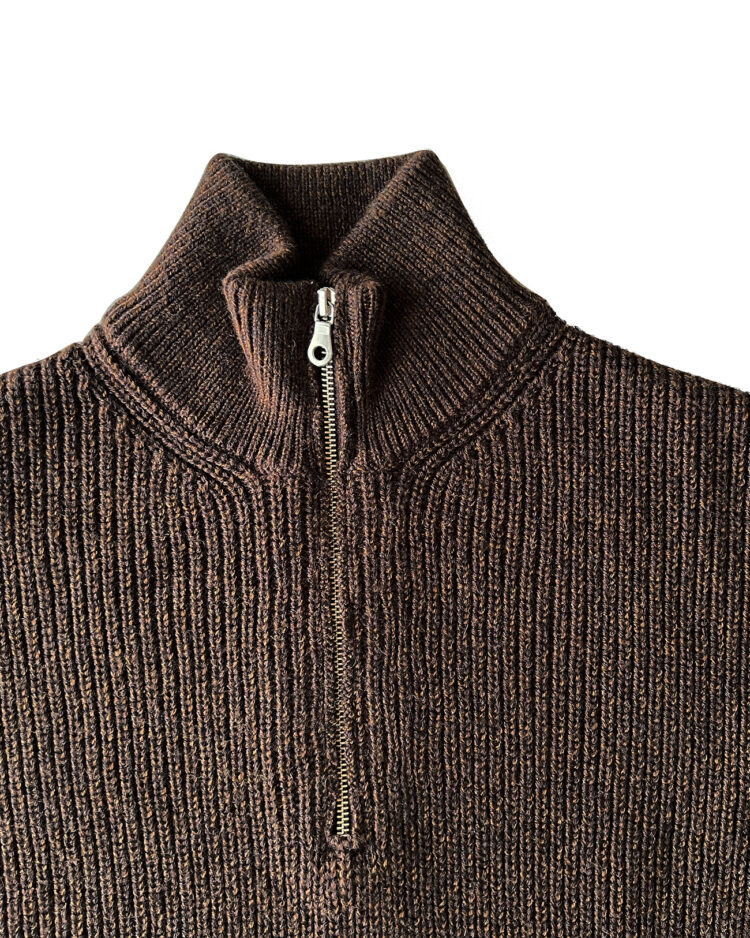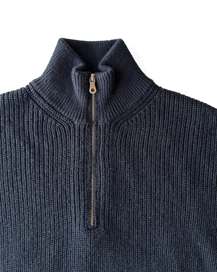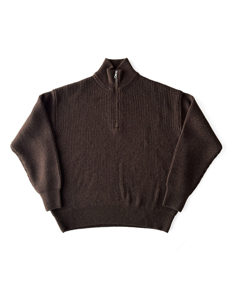 ウールアクリル素材でミドルゲージのハーフジップニット。 衿は折り返しての着用も可能。 カジュアルになり過ぎないスマートなシルエット。