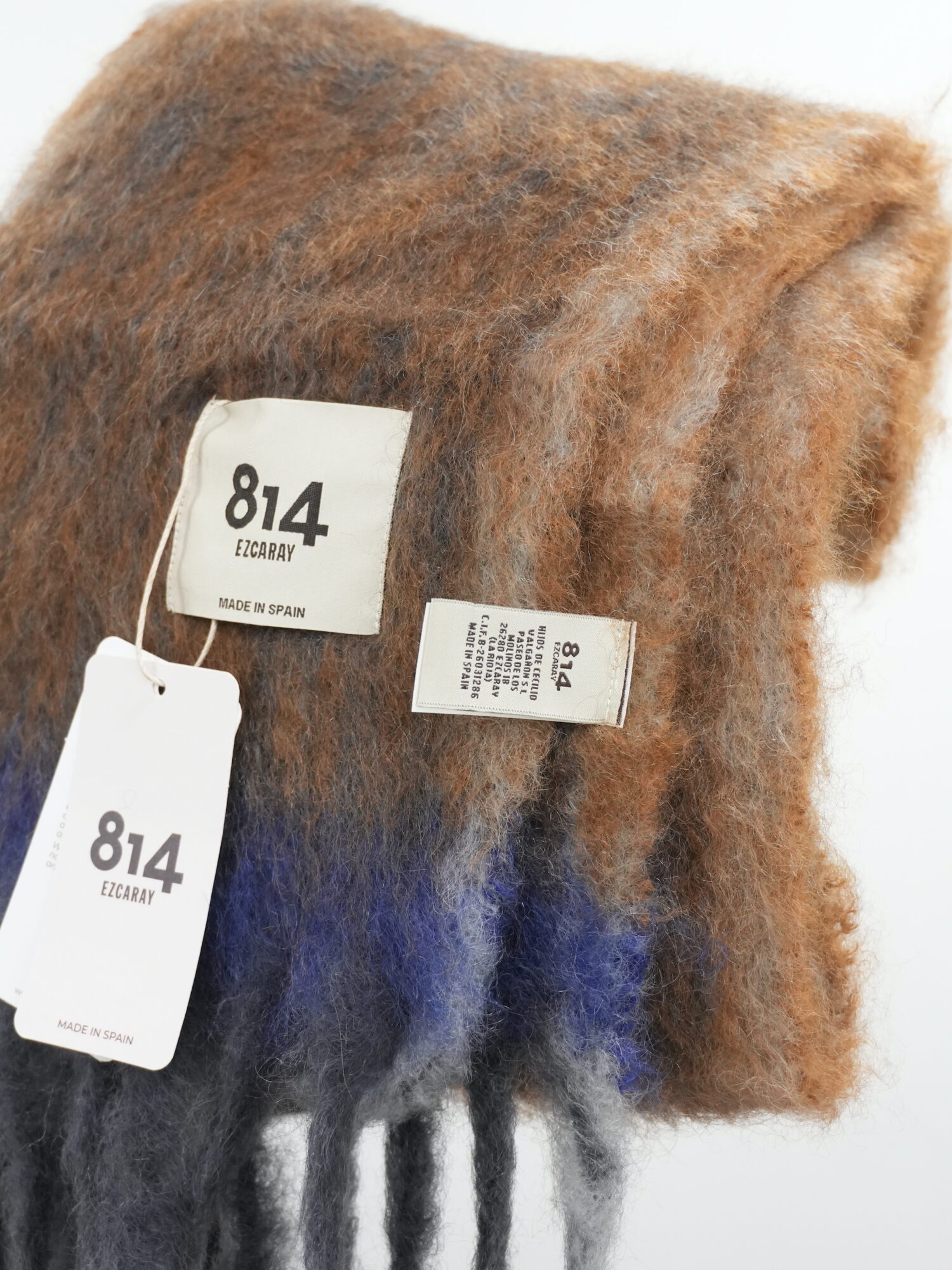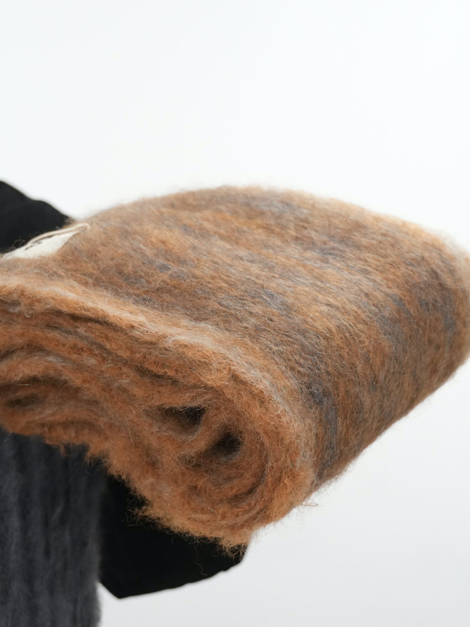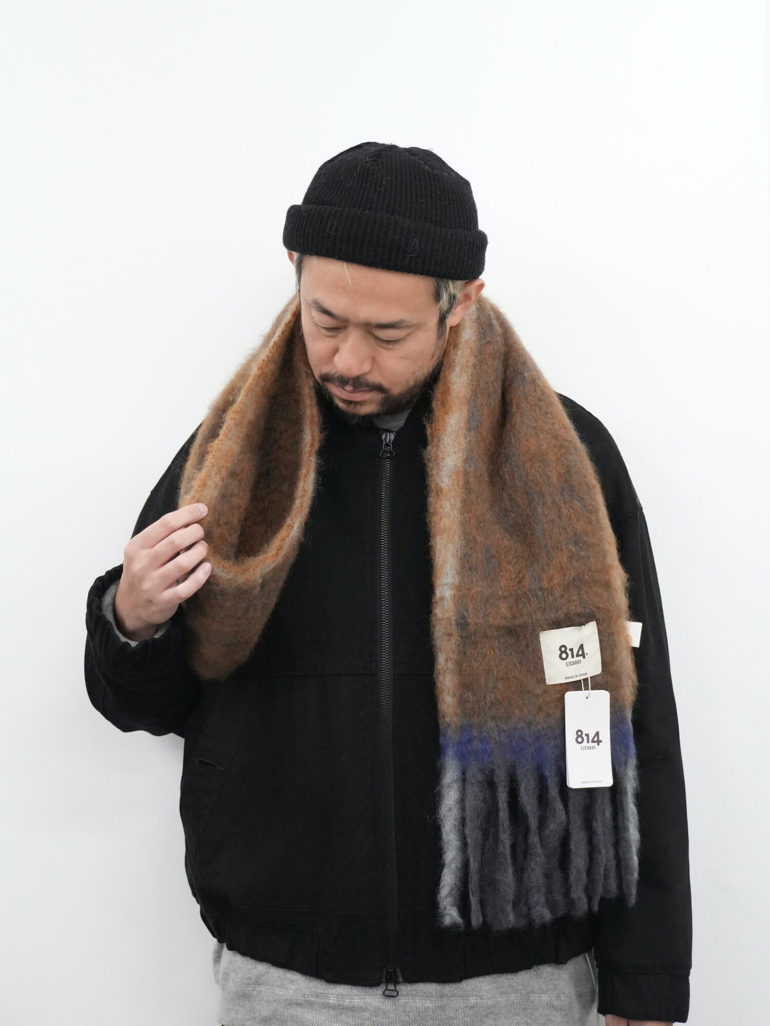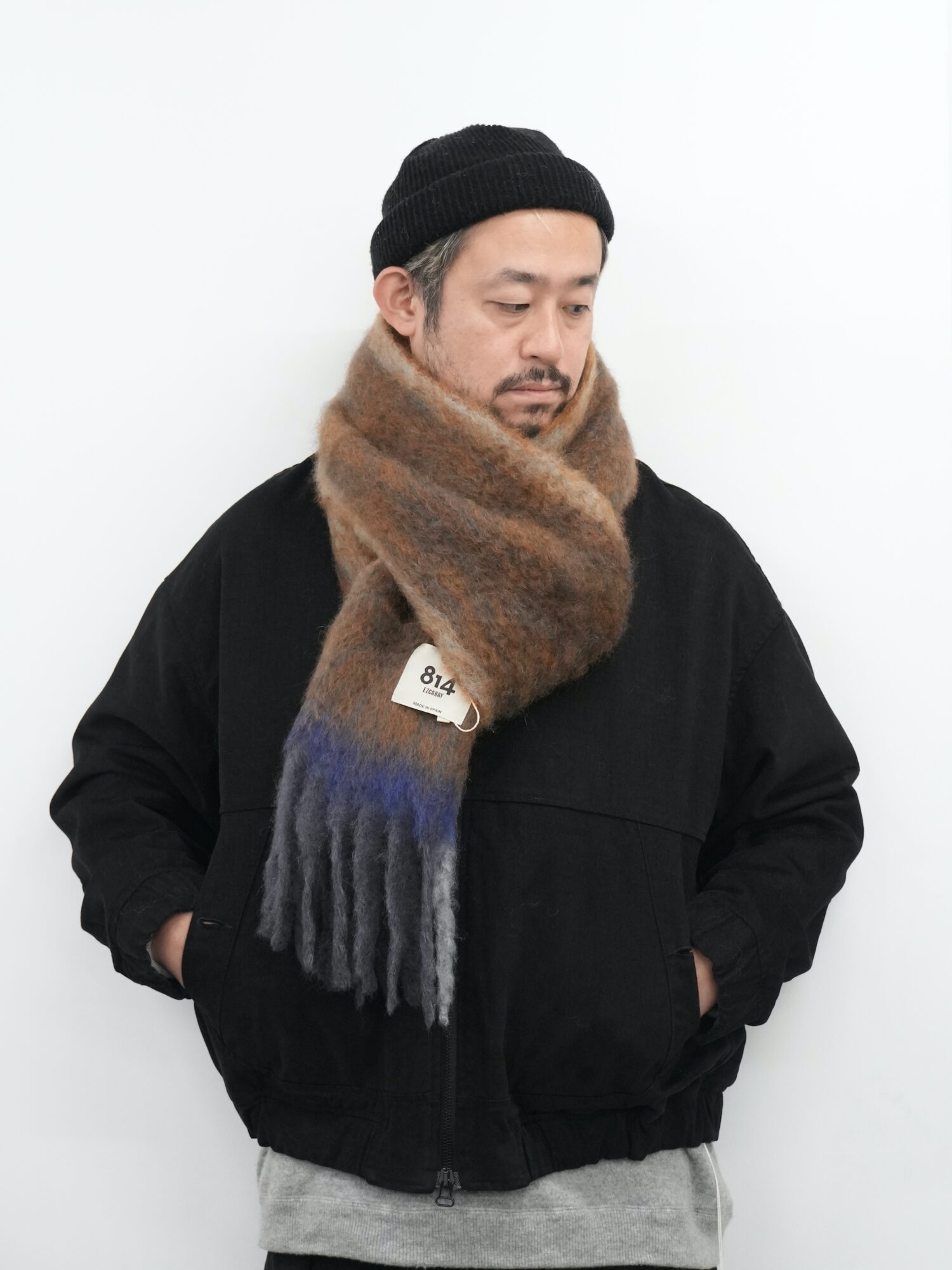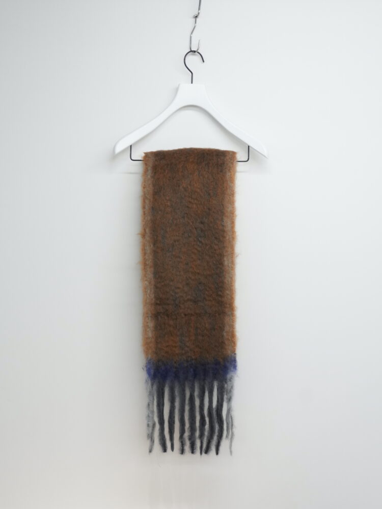 数種類のカラーがミックスされたストール。両端のカラーがアクセントになっているので、巻き方や見せ方で表情に変化が出ます。