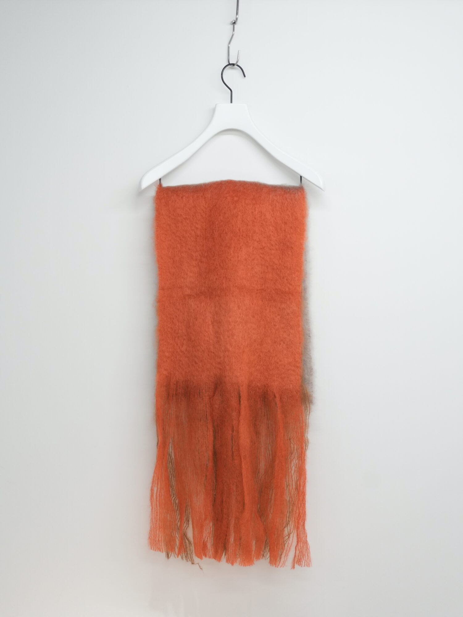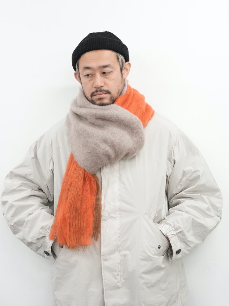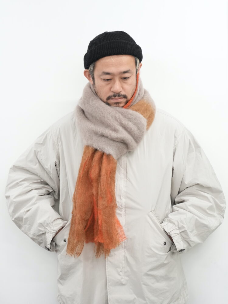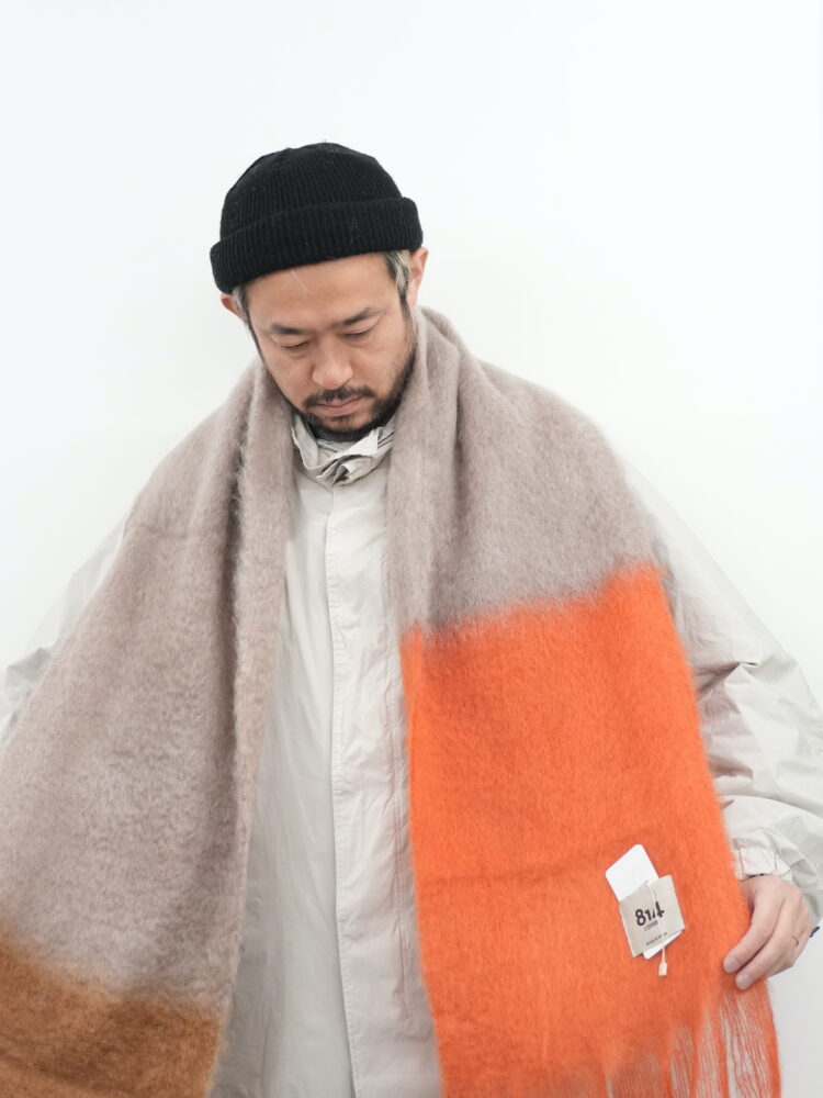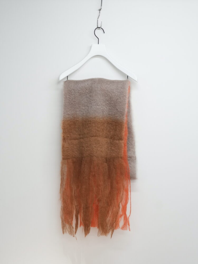 3色のカラーがブロックごとに配されたストール。着用する向きやねじれ具合で表情が変化します。裾部分は編み込まれておらずスッキリとした表情です。