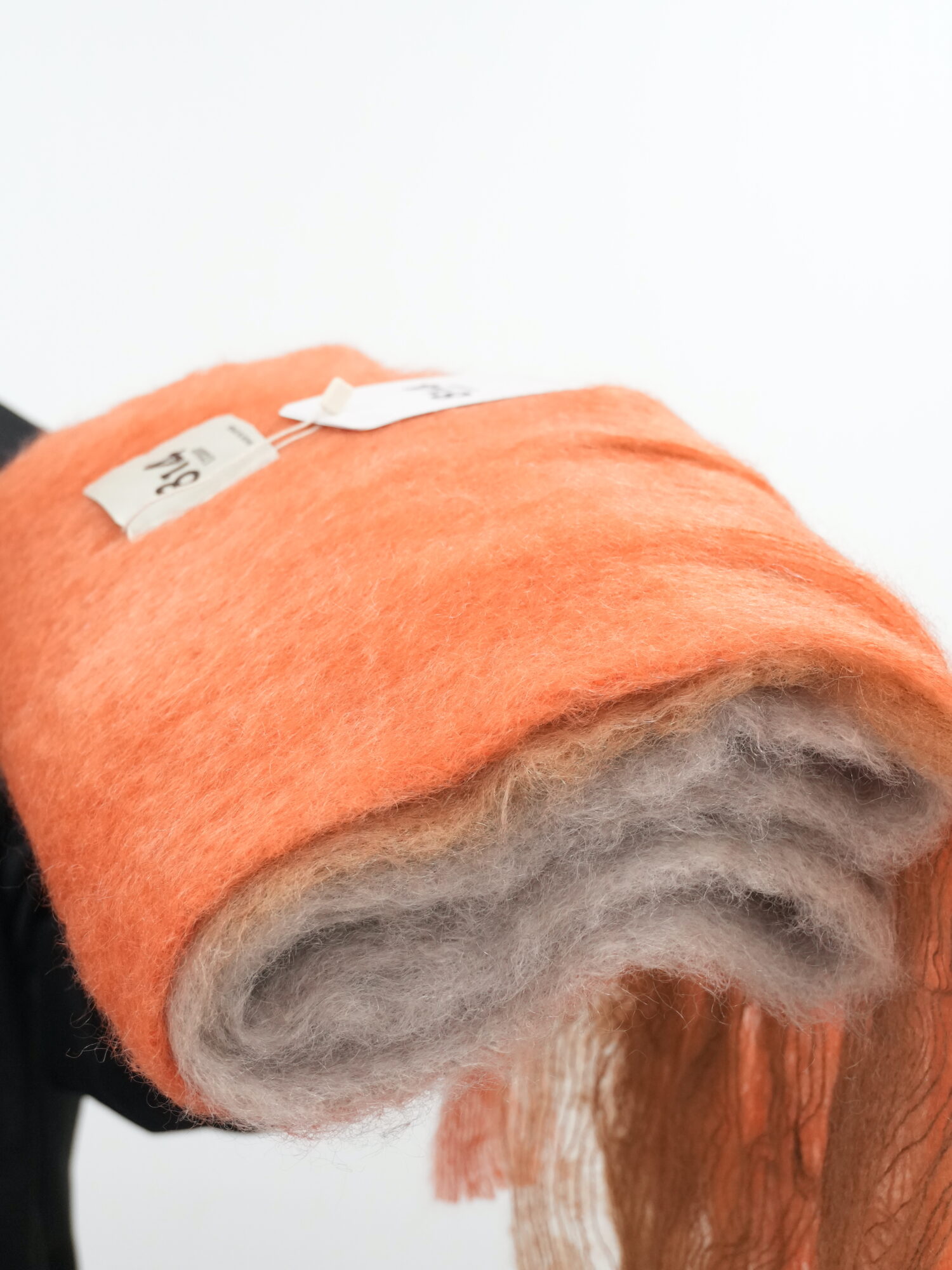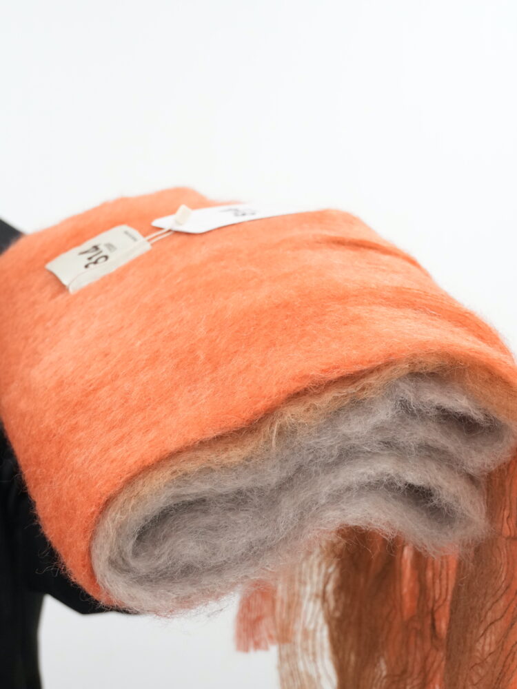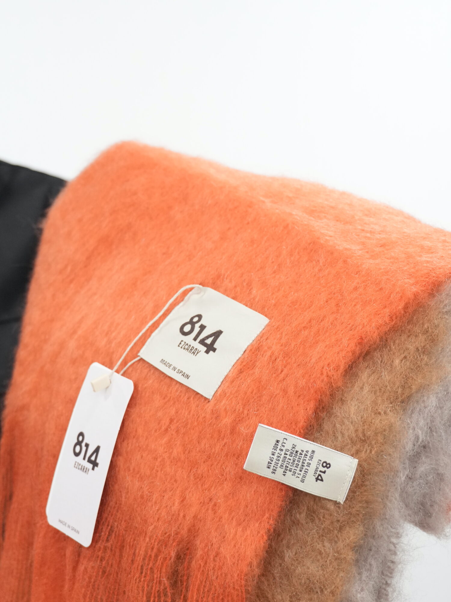 3色のカラーがブロックごとに配されたストール。着用する向きやねじれ具合で表情が変化します。裾部分は編み込まれておらずスッキリとした表情です。
