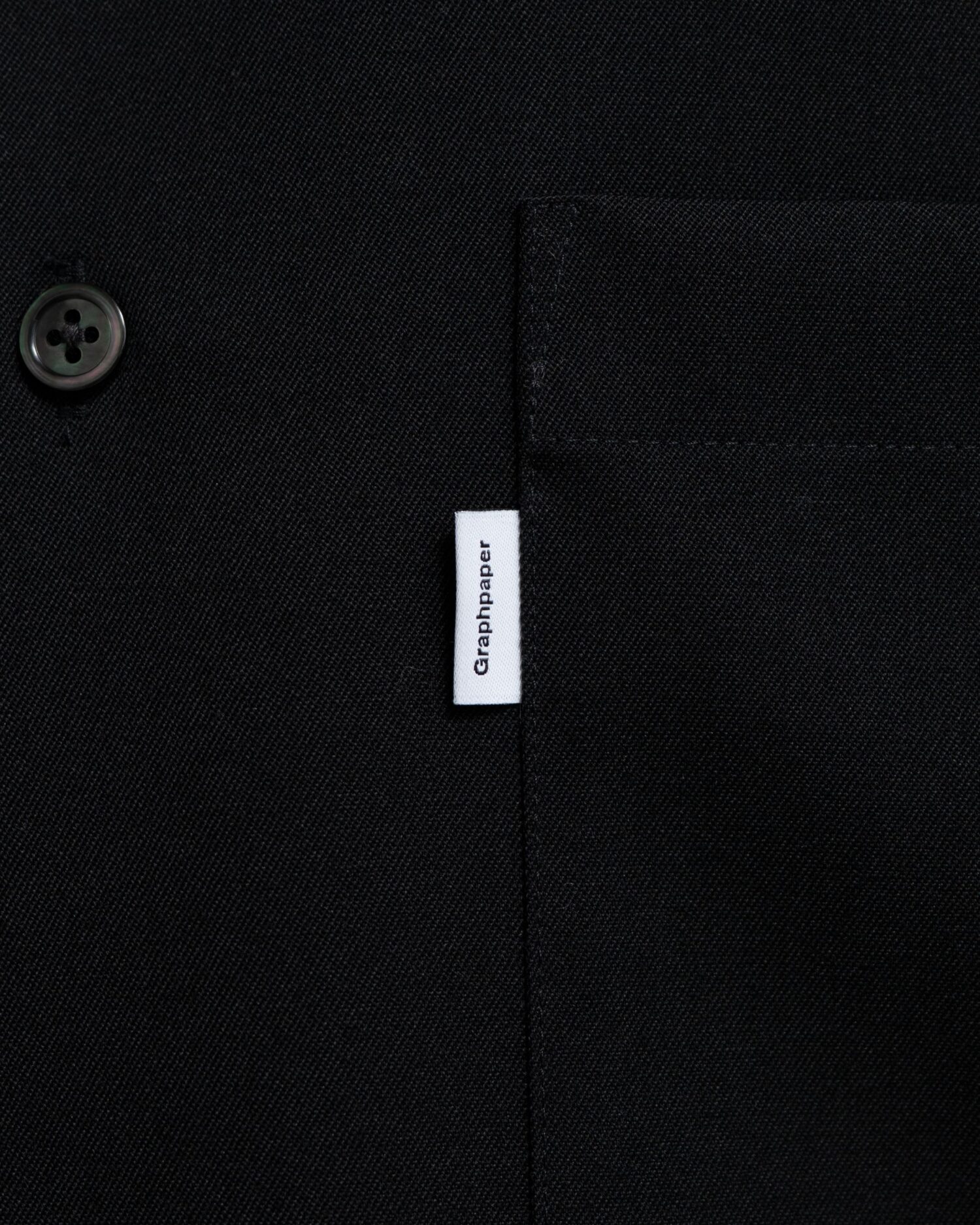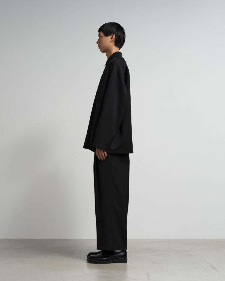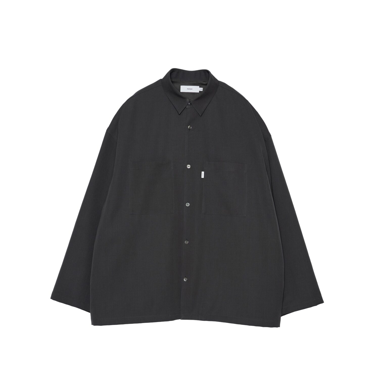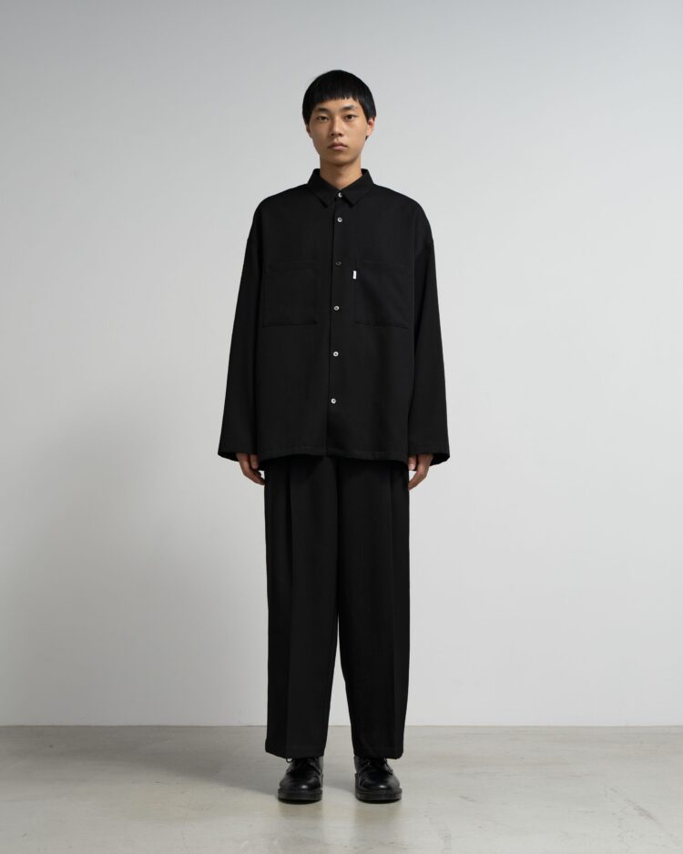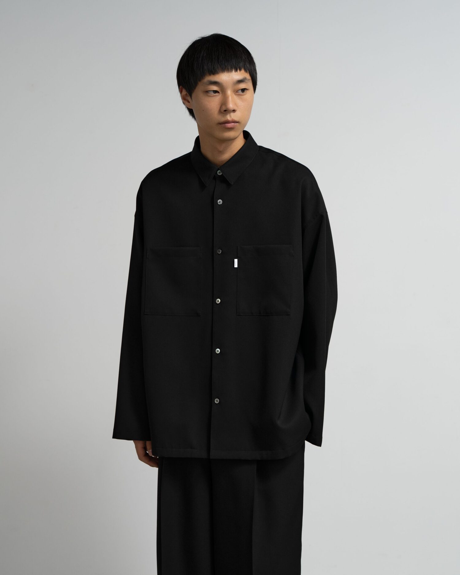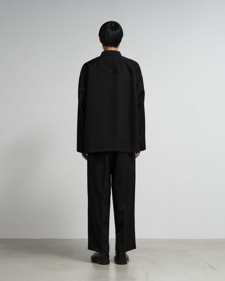 最も美しい綾目を表現するため縦糸を高密度に、横糸は限界まで打ち込んだウールギャバジン。特殊な樹脂をウール繊維の内部まで染み込ませることでフィラメントのような光沢とクリアな質感を生む。定番のオーバーサイズボックスシャツをベースに総裏のロングスリーブシャツジャケットに。