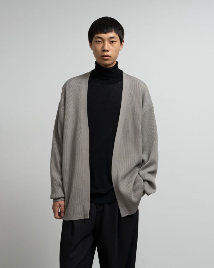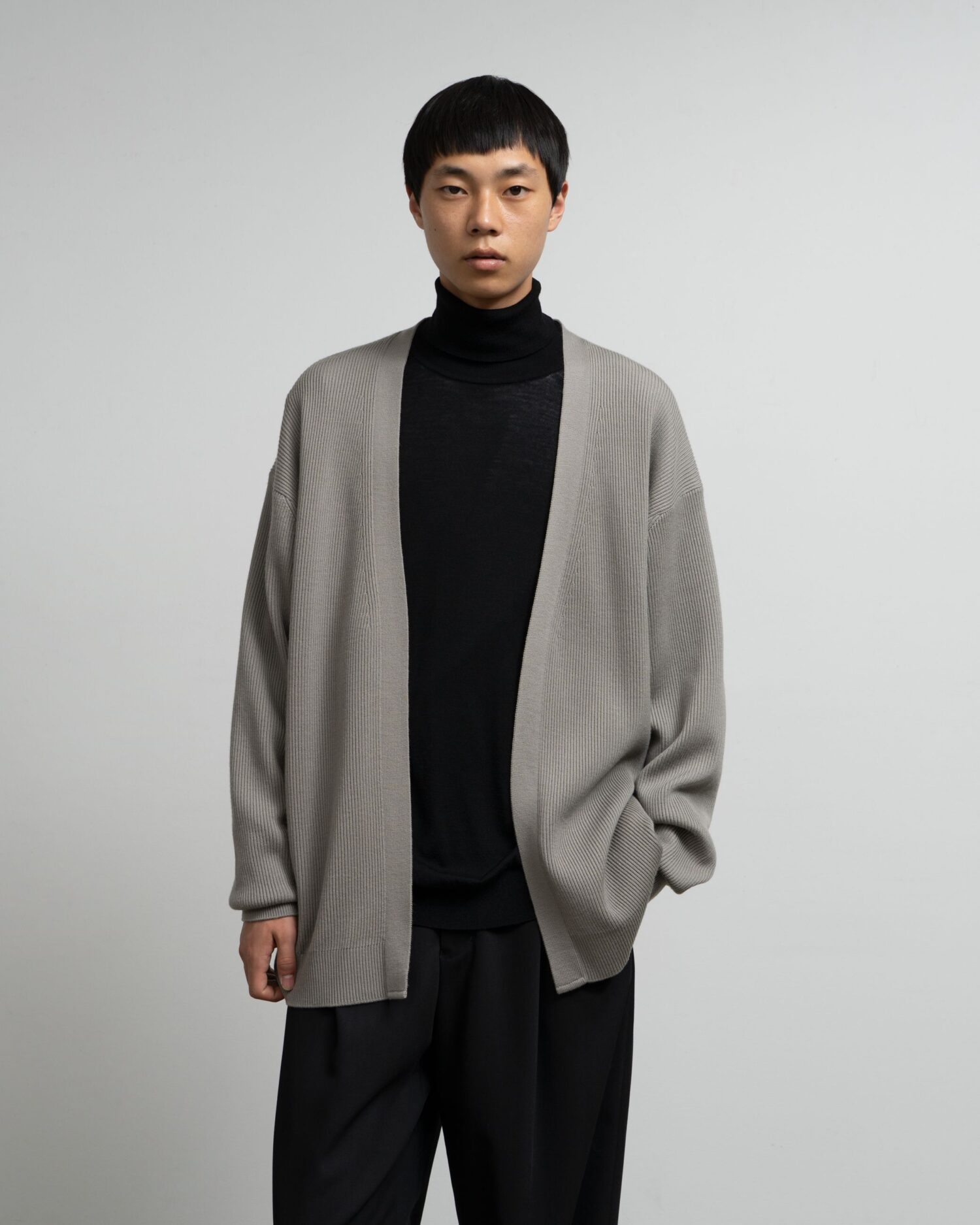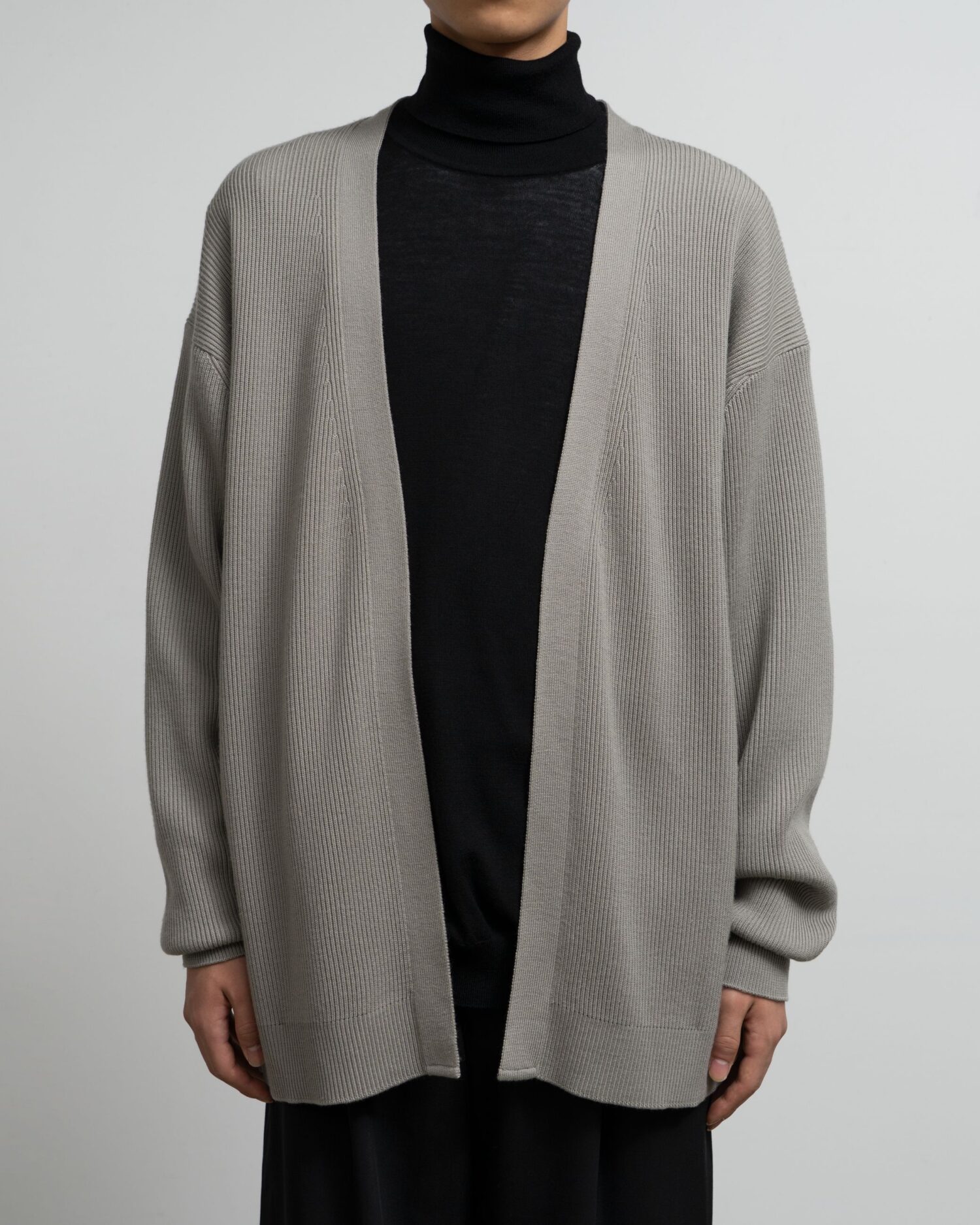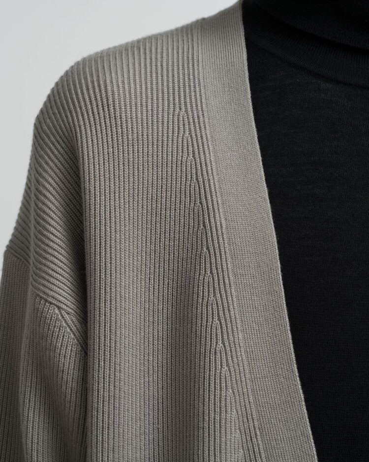 シンプルながらもしっかりと立ち上がった編み目が印象的な、ミドルゲージのオープンカーディガン。非常に細かく上質で艶のあるメリノウールを使用し、限界まで度詰めで編み立てることで、適度なボリュームと美しい表情を兼ね備えた一着。※グレージュは今シーズンのコレクションカラーです。