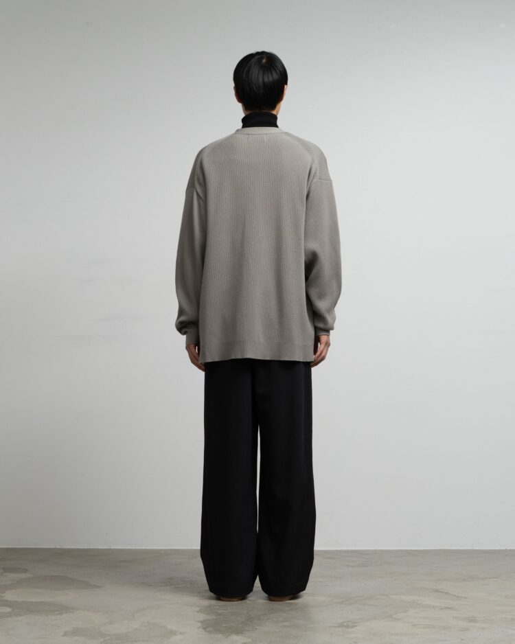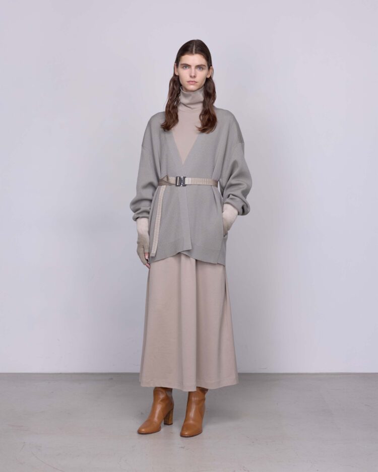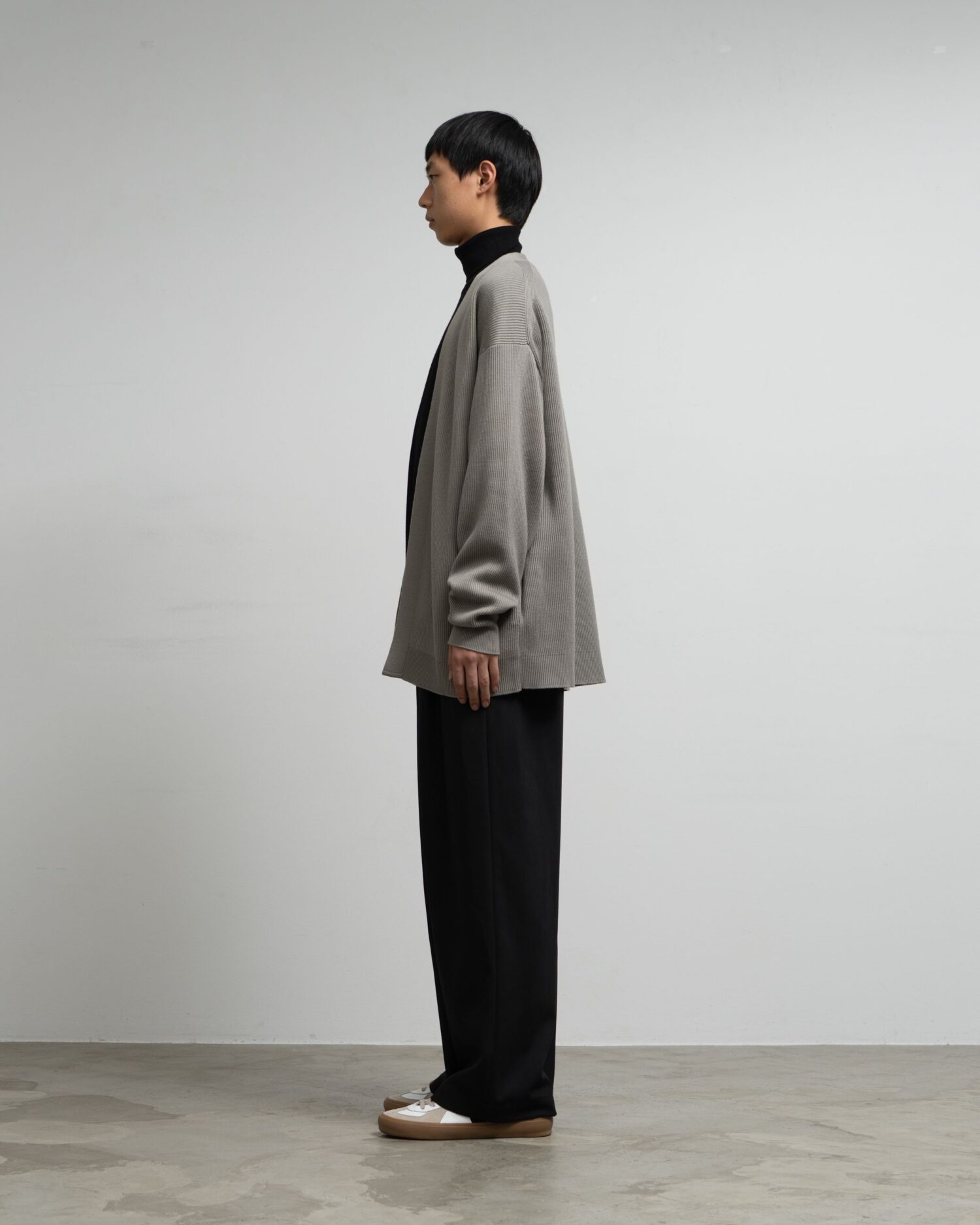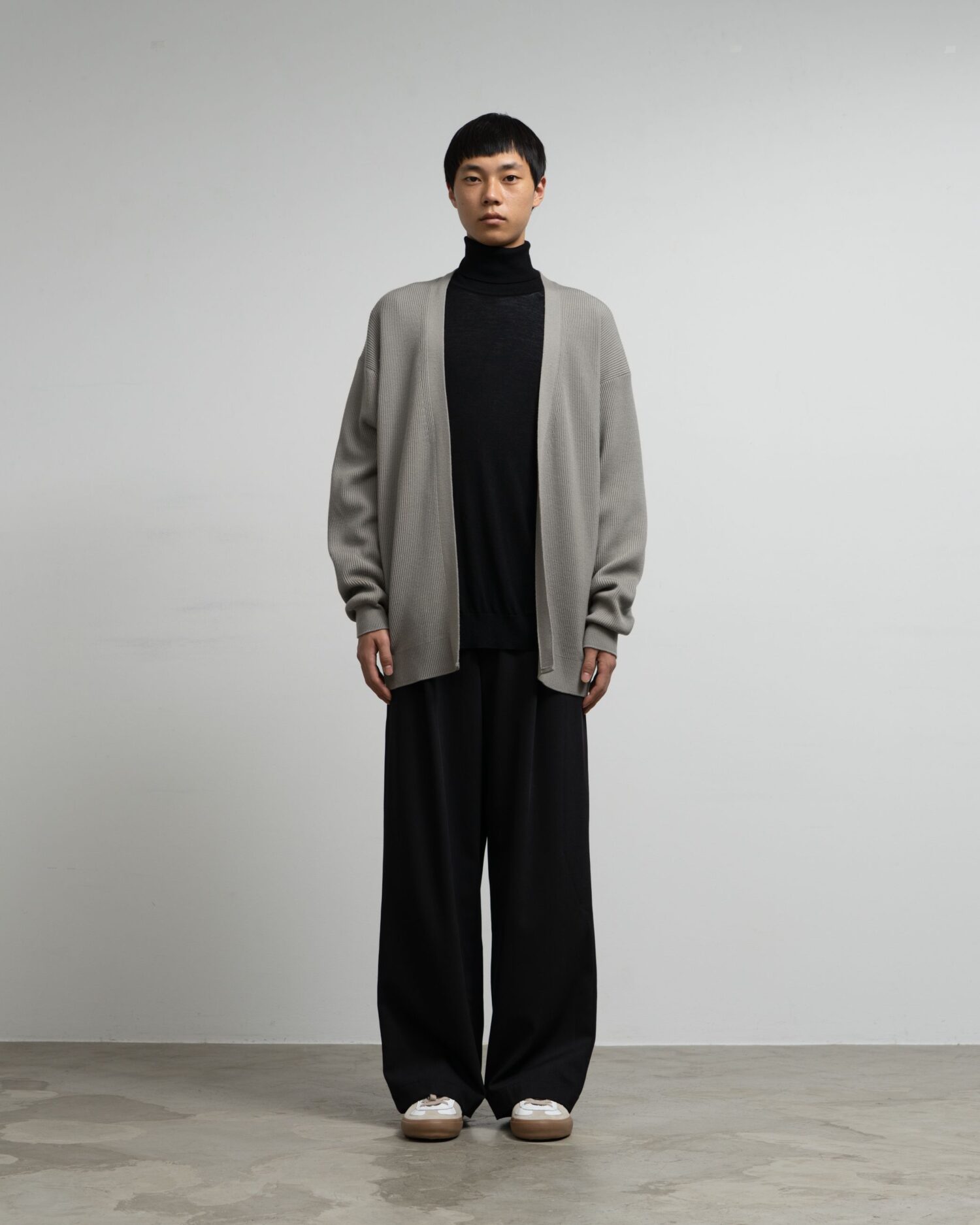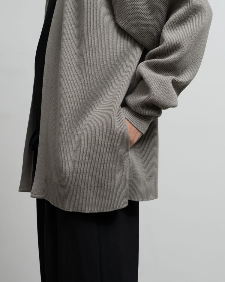 シンプルながらもしっかりと立ち上がった編み目が印象的な、ミドルゲージのオープンカーディガン。非常に細かく上質で艶のあるメリノウールを使用し、限界まで度詰めで編み立てることで、適度なボリュームと美しい表情を兼ね備えた一着。※グレージュは今シーズンのコレクションカラーです。