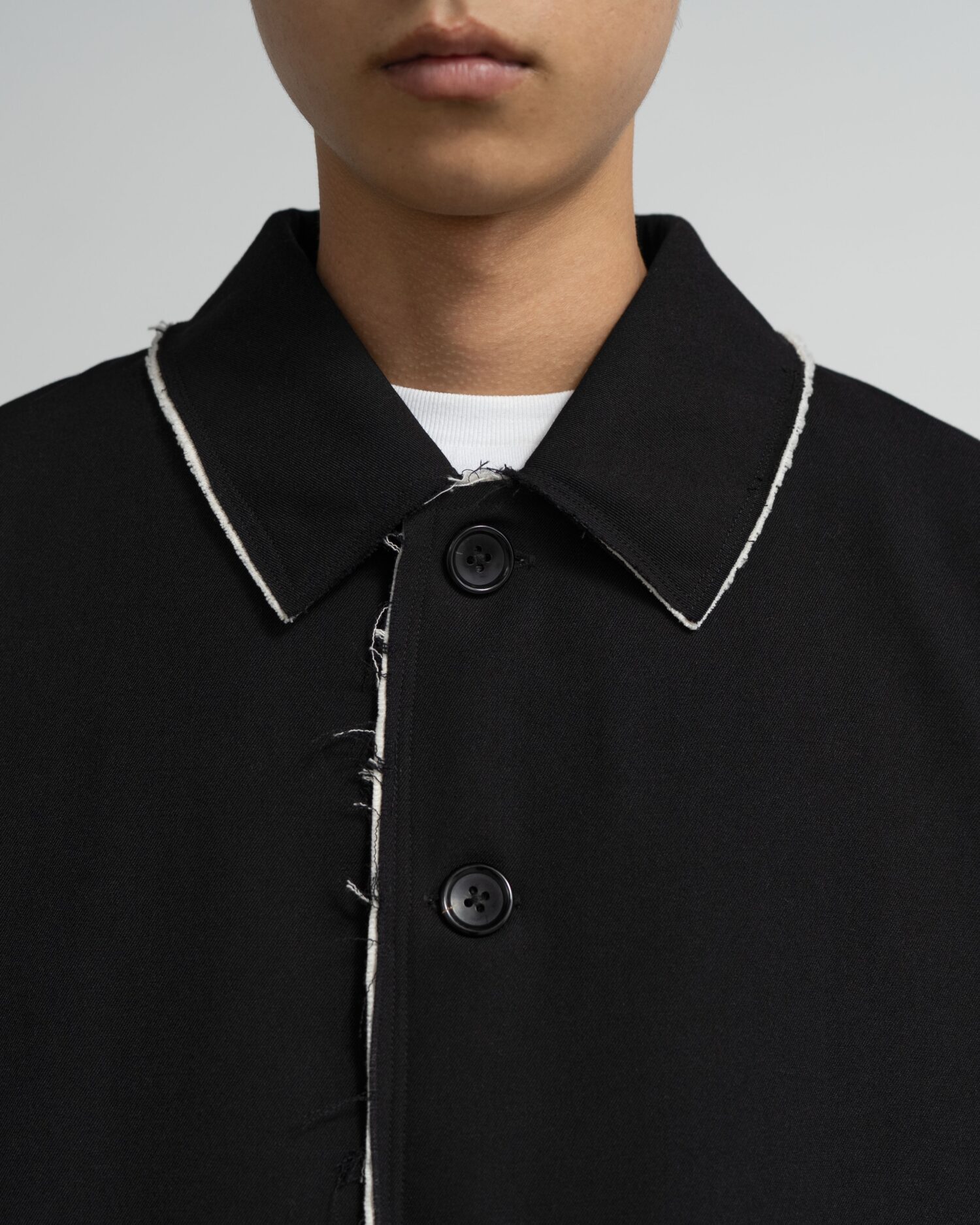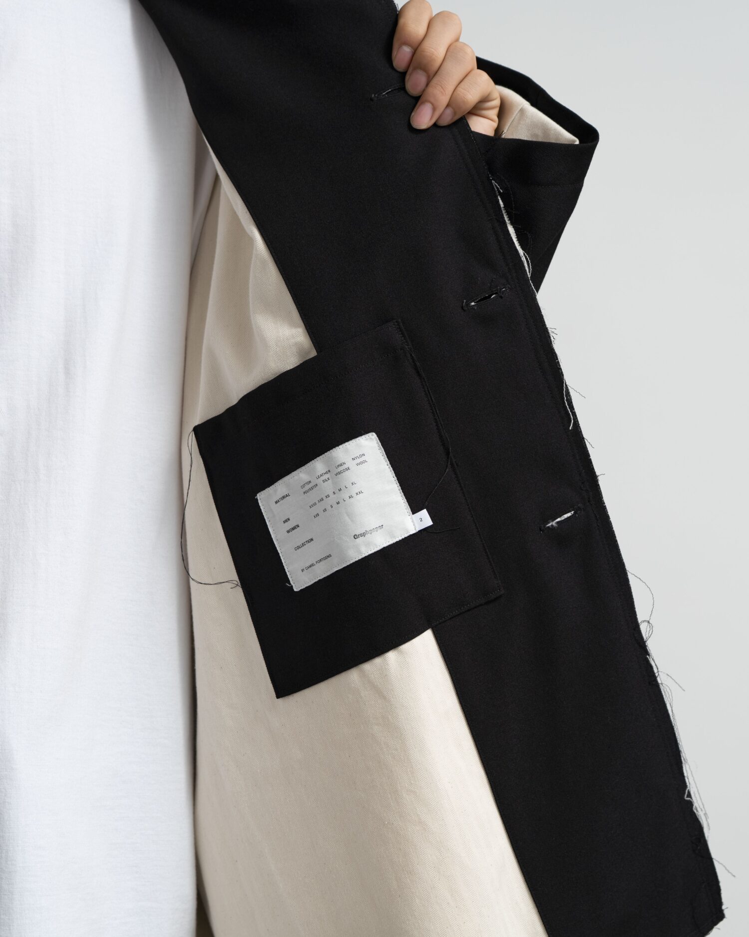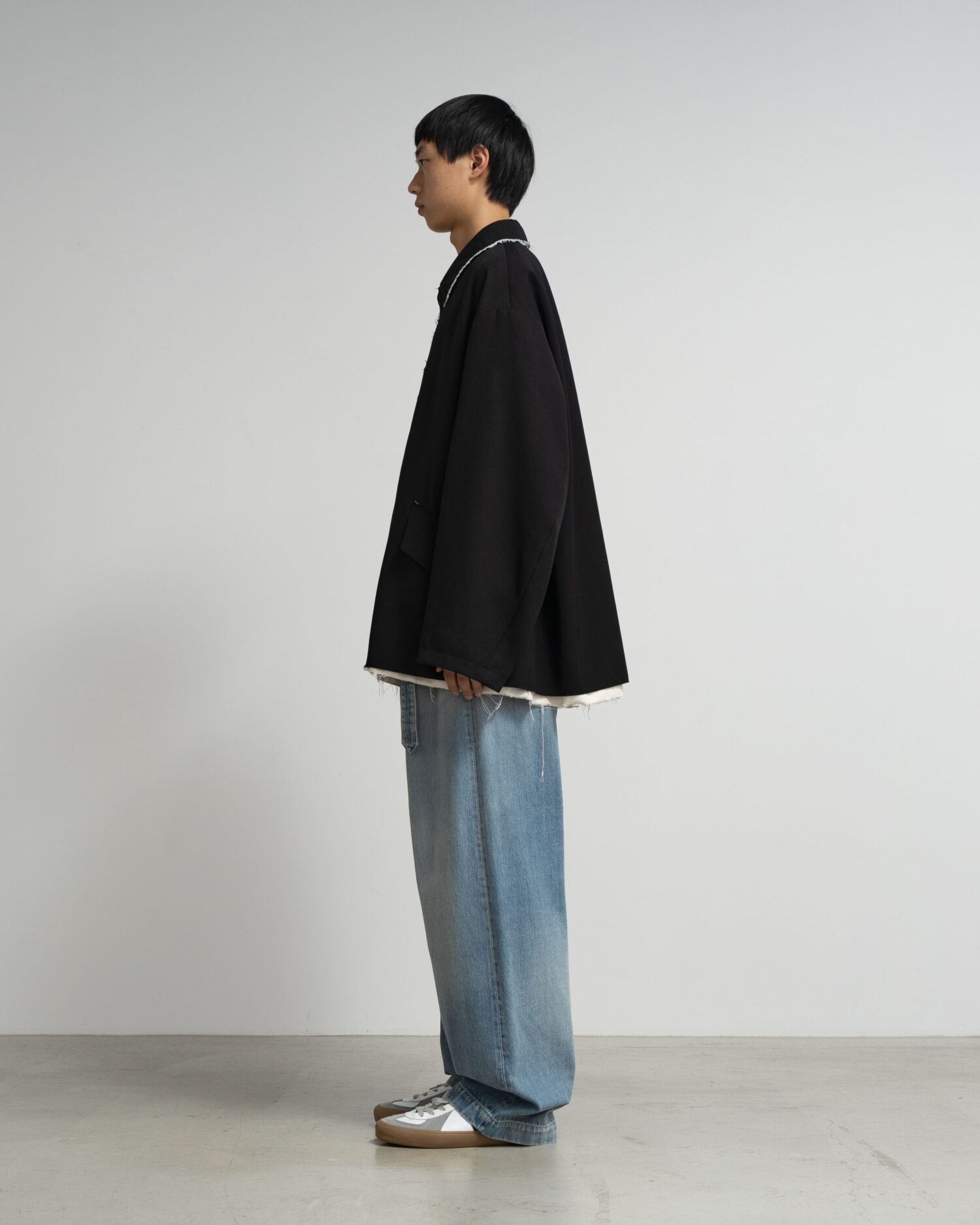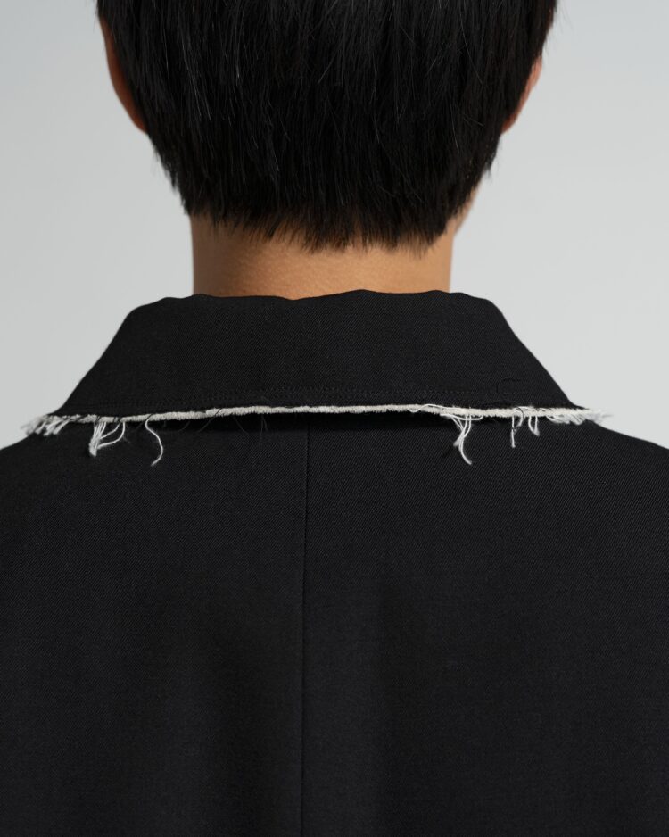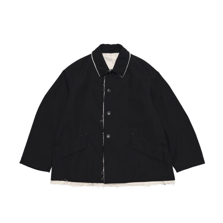 ドライな質感としなやかな落ち感を併せ持つ二重織りのウールギャバジンを使用した、ミドルレングスのオーバーサイズコート。前立てや襟にはCamiel Fortgensらしい切りっぱなしのディテールを施し、構築的なフォルムにラフなニュアンスのある存在感のある一着。裏面にはサテン組織、ライニングには無染色のコットンヘリンボンツイルを採用し、素材のコントラストと美しいドレープを引き立てます。