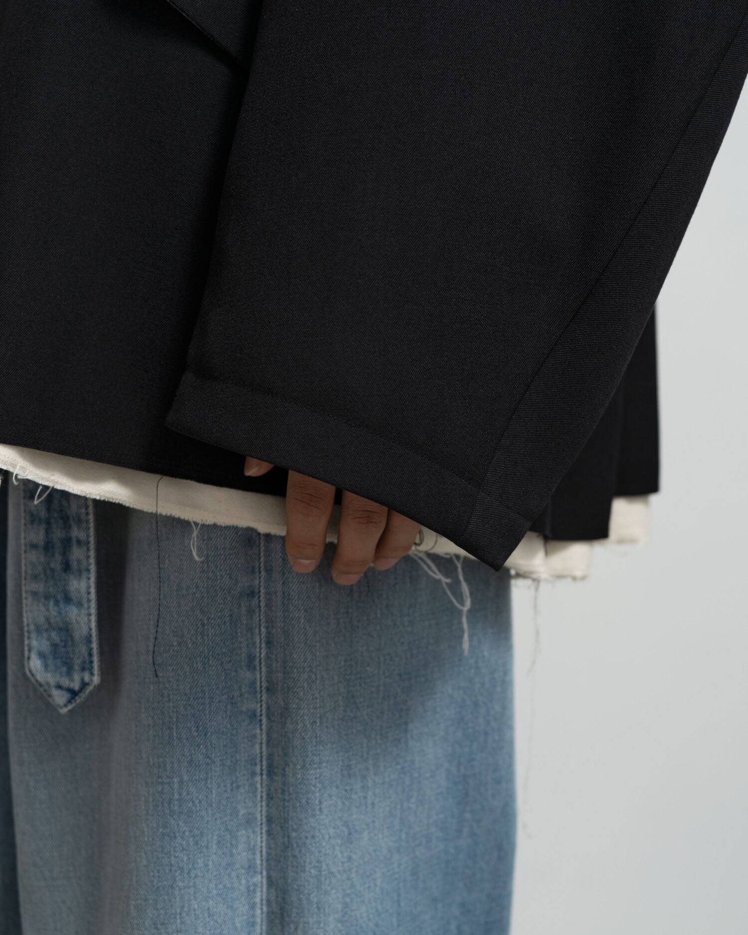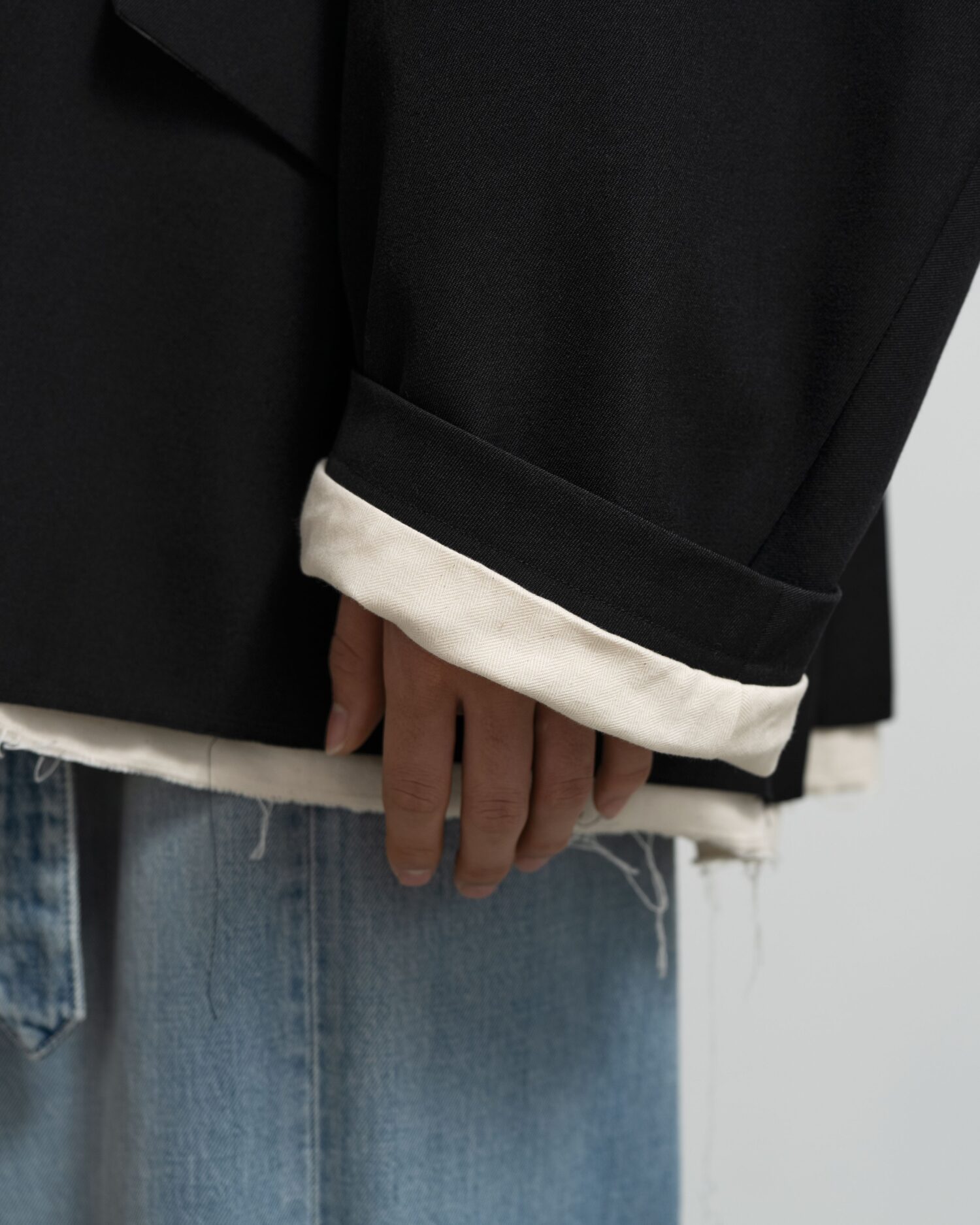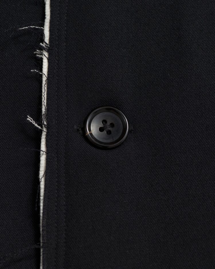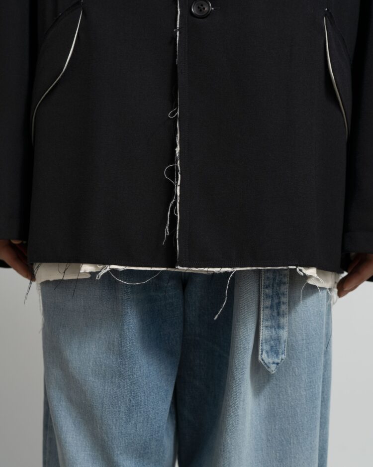 ドライな質感としなやかな落ち感を併せ持つ二重織りのウールギャバジンを使用した、ミドルレングスのオーバーサイズコート。前立てや襟にはCamiel Fortgensらしい切りっぱなしのディテールを施し、構築的なフォルムにラフなニュアンスのある存在感のある一着。裏面にはサテン組織、ライニングには無染色のコットンヘリンボンツイルを採用し、素材のコントラストと美しいドレープを引き立てます。