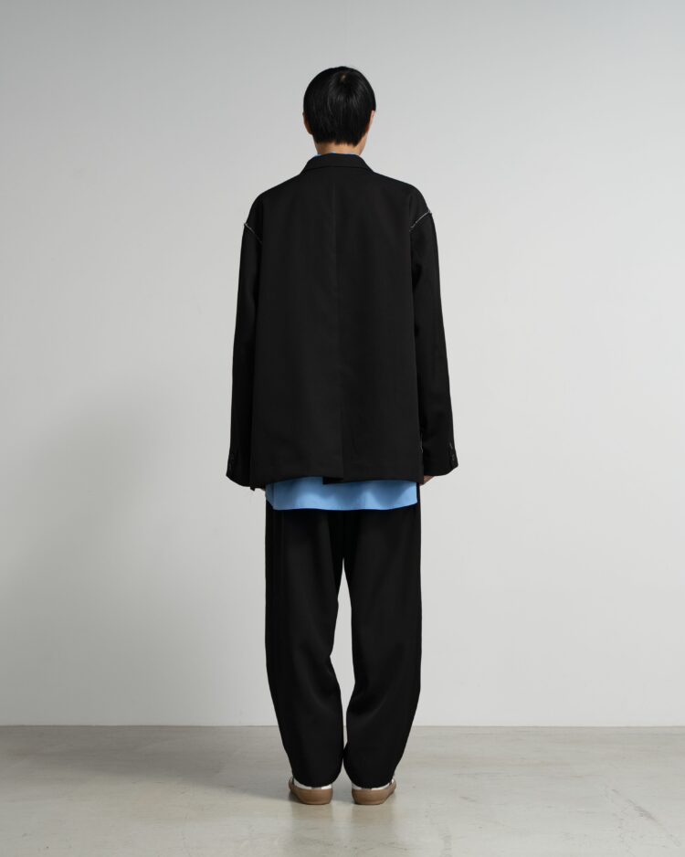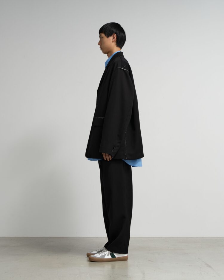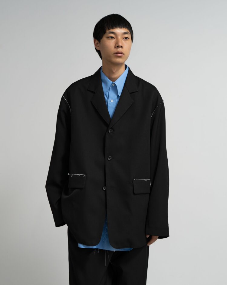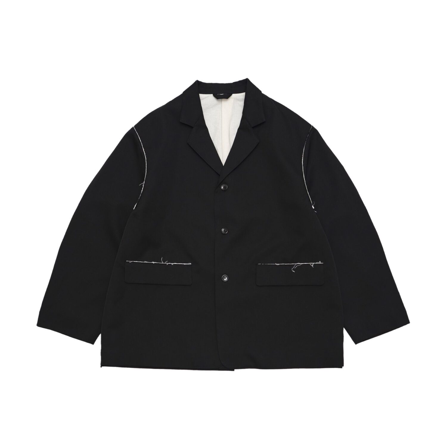 端正なテーラリングに対し、Camiel Fortgensらしい切りっぱなしの縫い付けをアームホールやポケットに施しディテールが際立つ一着。無染色のシーチング生地を使用したライニングが印象的です。※本製品は、素材の風合いやデザインを活かすため、袖口や裾に断ち切りの仕様を施しています。着用を重ねることで生地端にほつれが生じる場合がございますが、製品特性としてご理解ください。※生産工程の一部に手作業を取り入れているため、形やサイズには個体差があり、寸法数値と実際のサイズに差が生じる場合がございます。